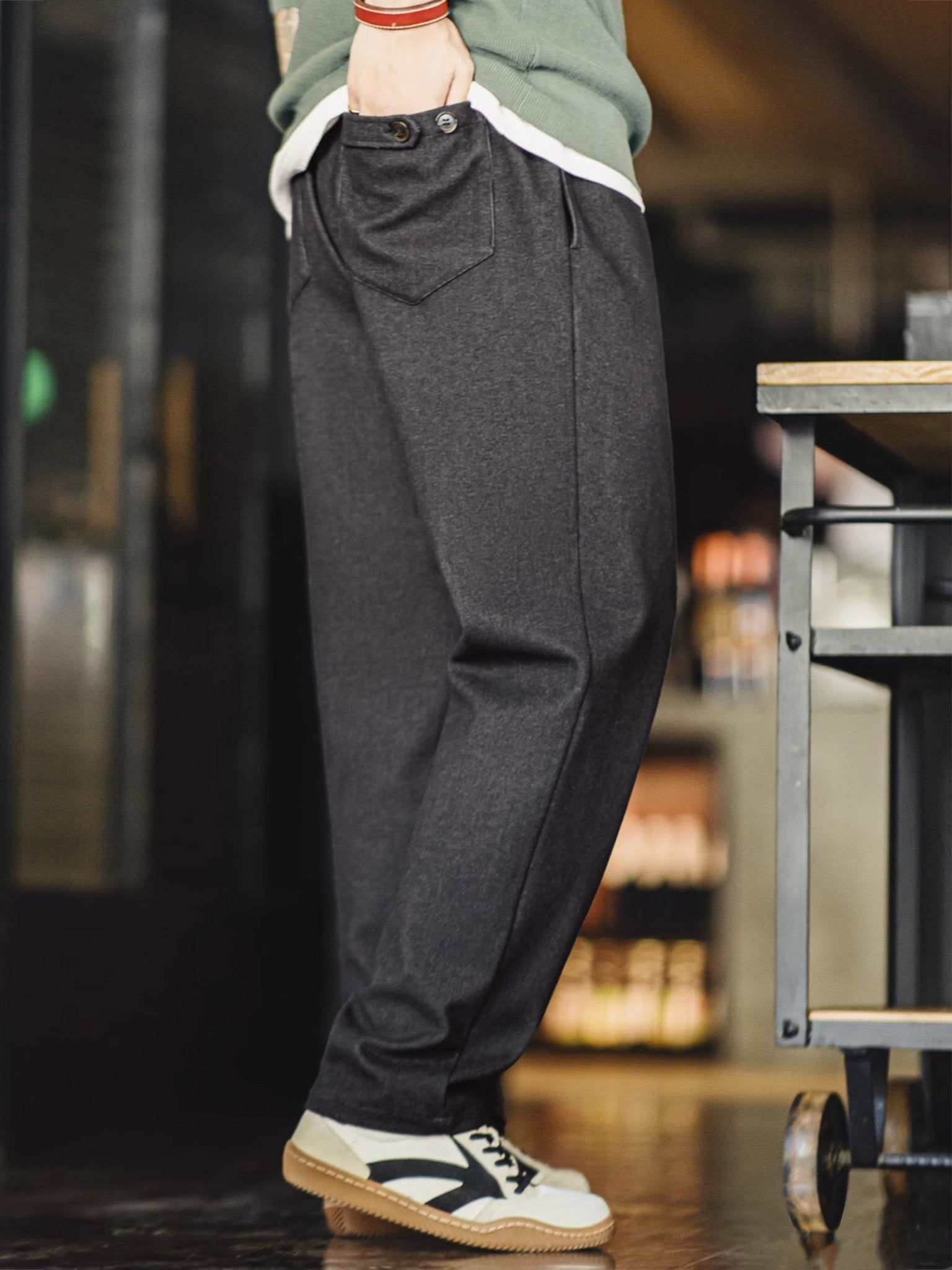 不規則な樹脂ボタンと縦のストライプテクスチャは、パンツにユニークなディテールを加え、個性を引き立てます。