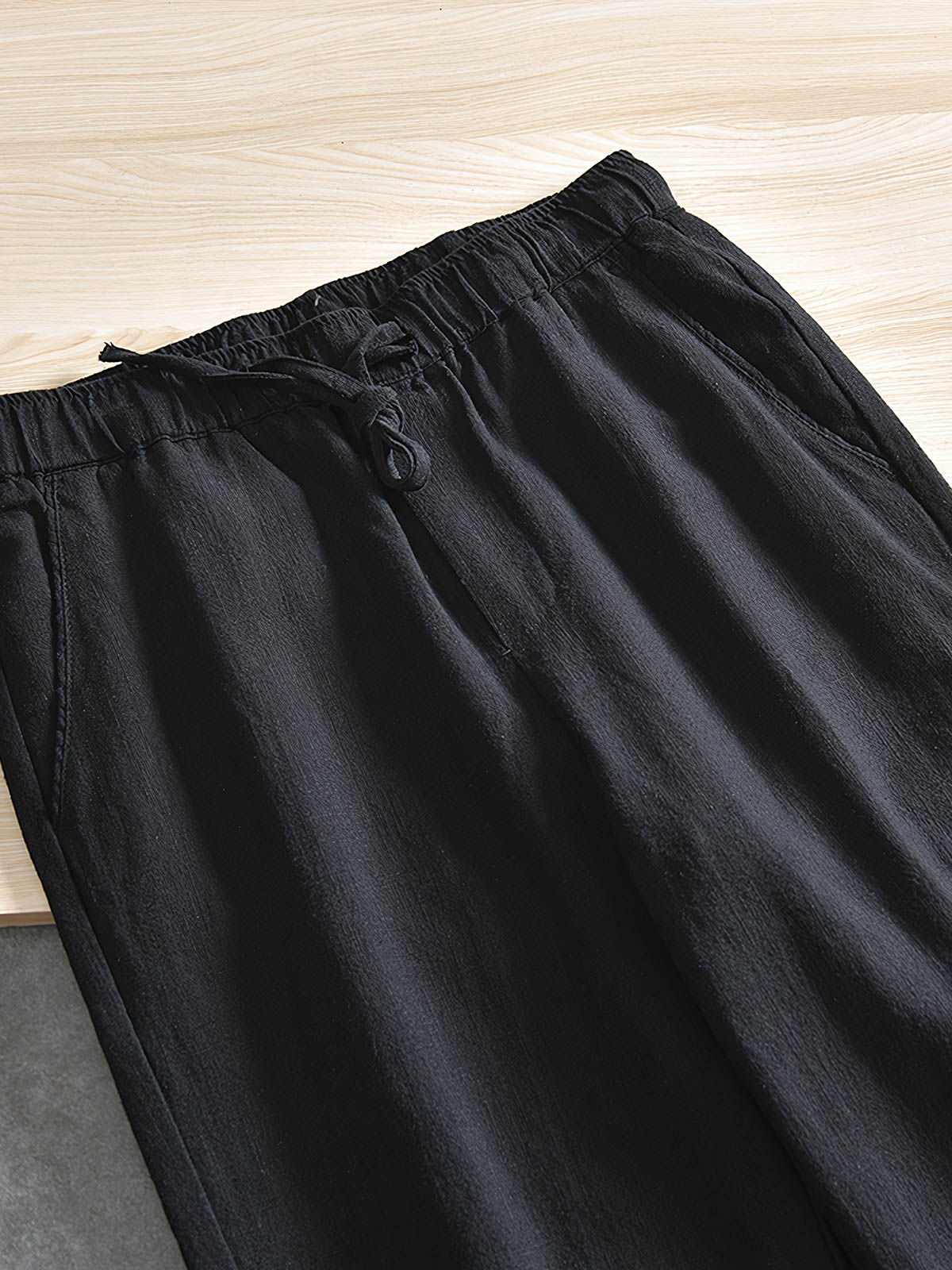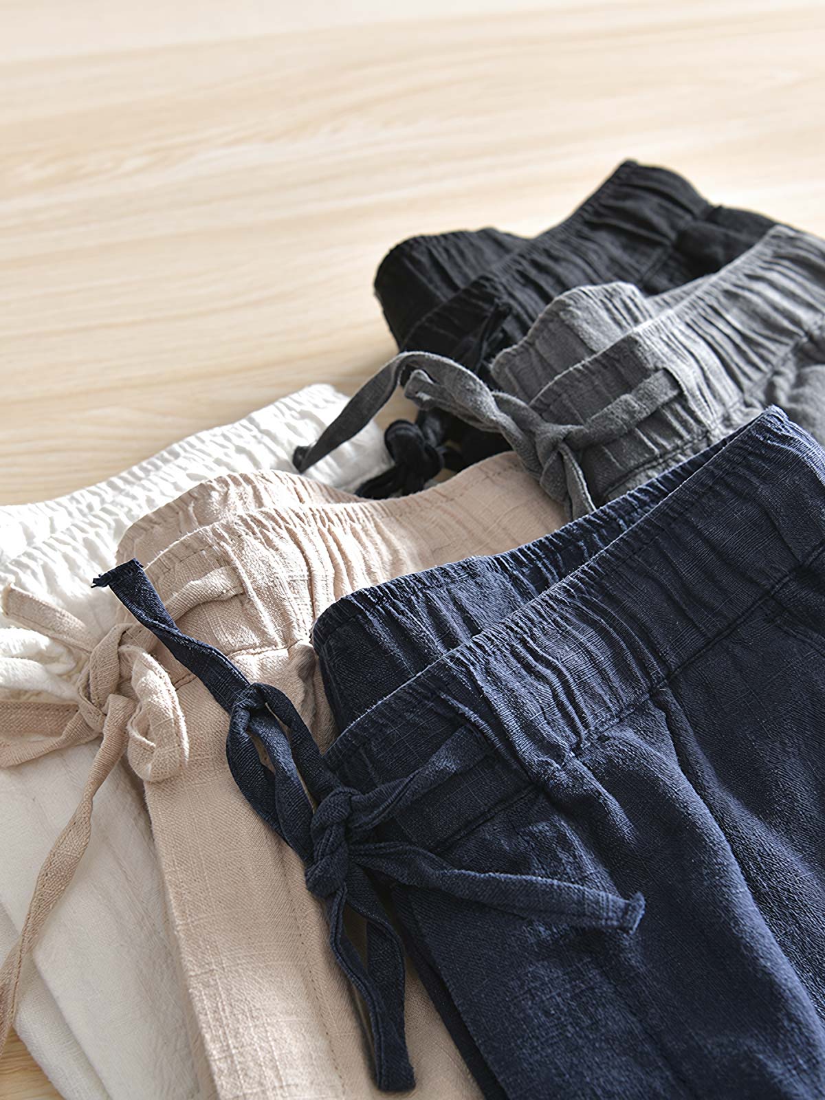 ウエスト部分はゴム仕様であり、個人のニーズに合わせてウエストの調節が可能で、体にフィットします。ウォッシュ加工により、生地が柔らかくなり、快適な肌触りを実現します。微光沢の質感が生地に重みを与え、軽すぎず重すぎない感触をもたらします。細部の制作工程と加工により、生地の品質と耐久性が優れています。