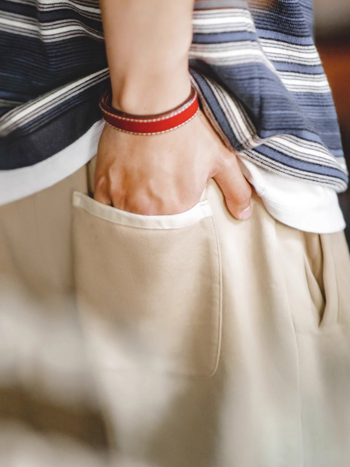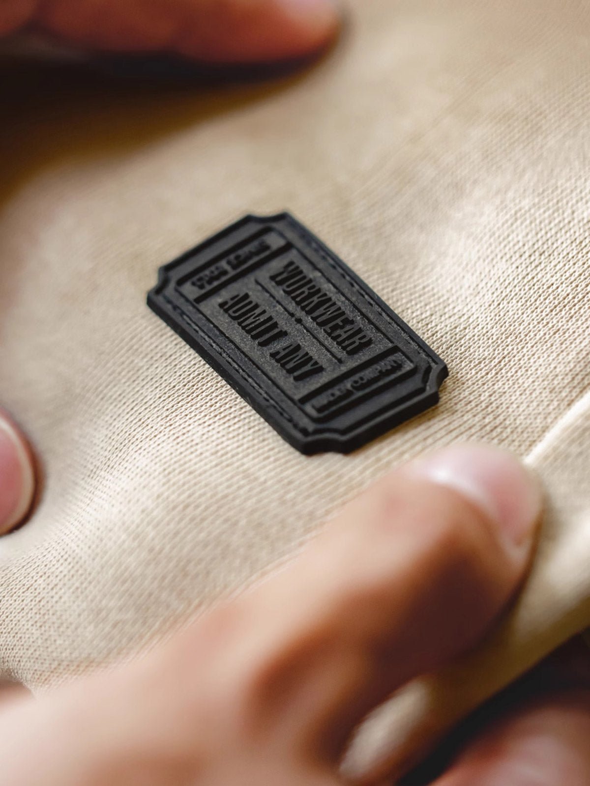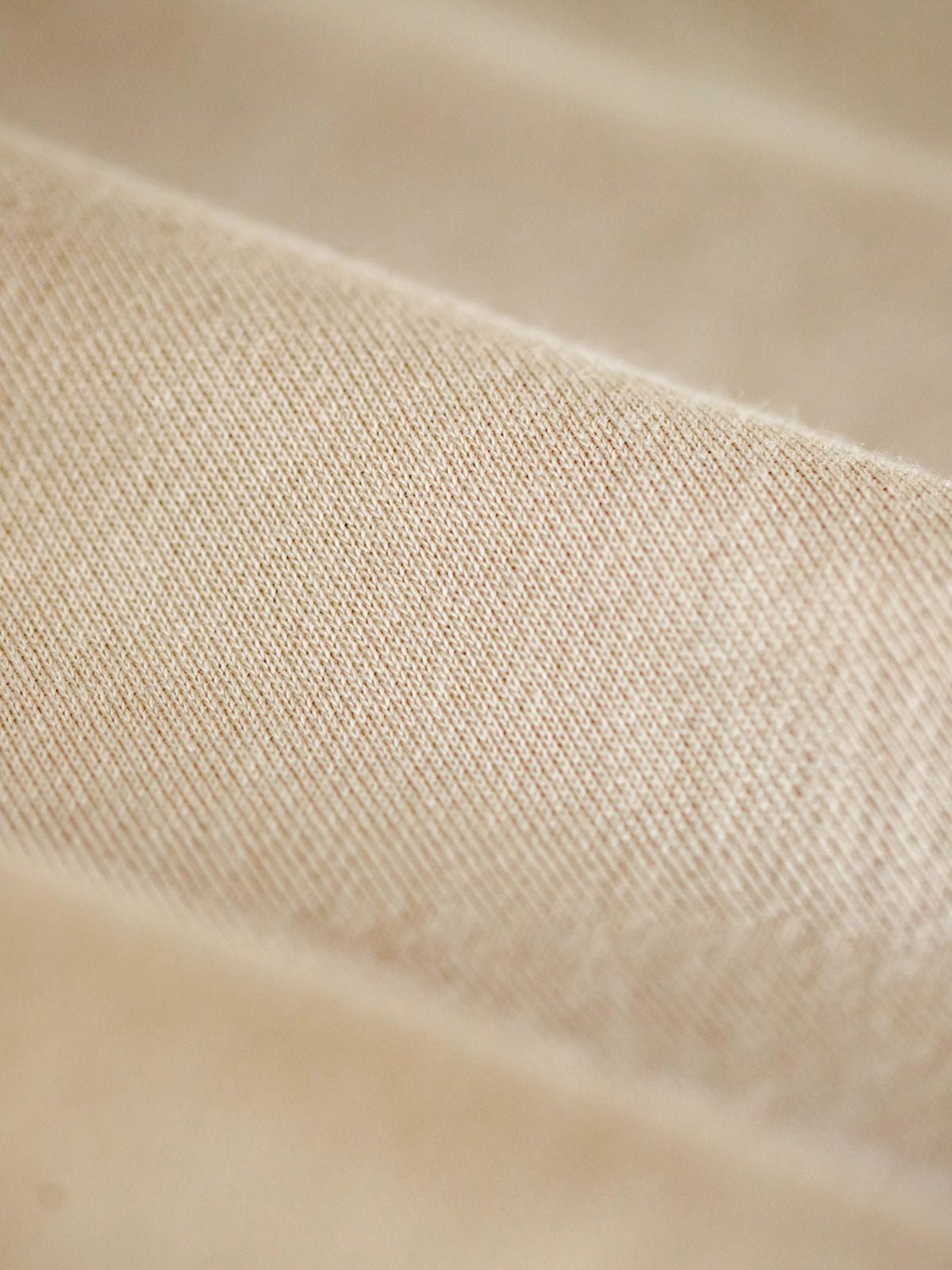 柔らかなコットン混紡素材を選択し、快適な着用感と良好な通気性を目指しています。グラデーションハイライトは、異なる光の下で微妙な色の変化を見せ、小さなタグのディテールはブランド認知の巧妙なアクセントです。