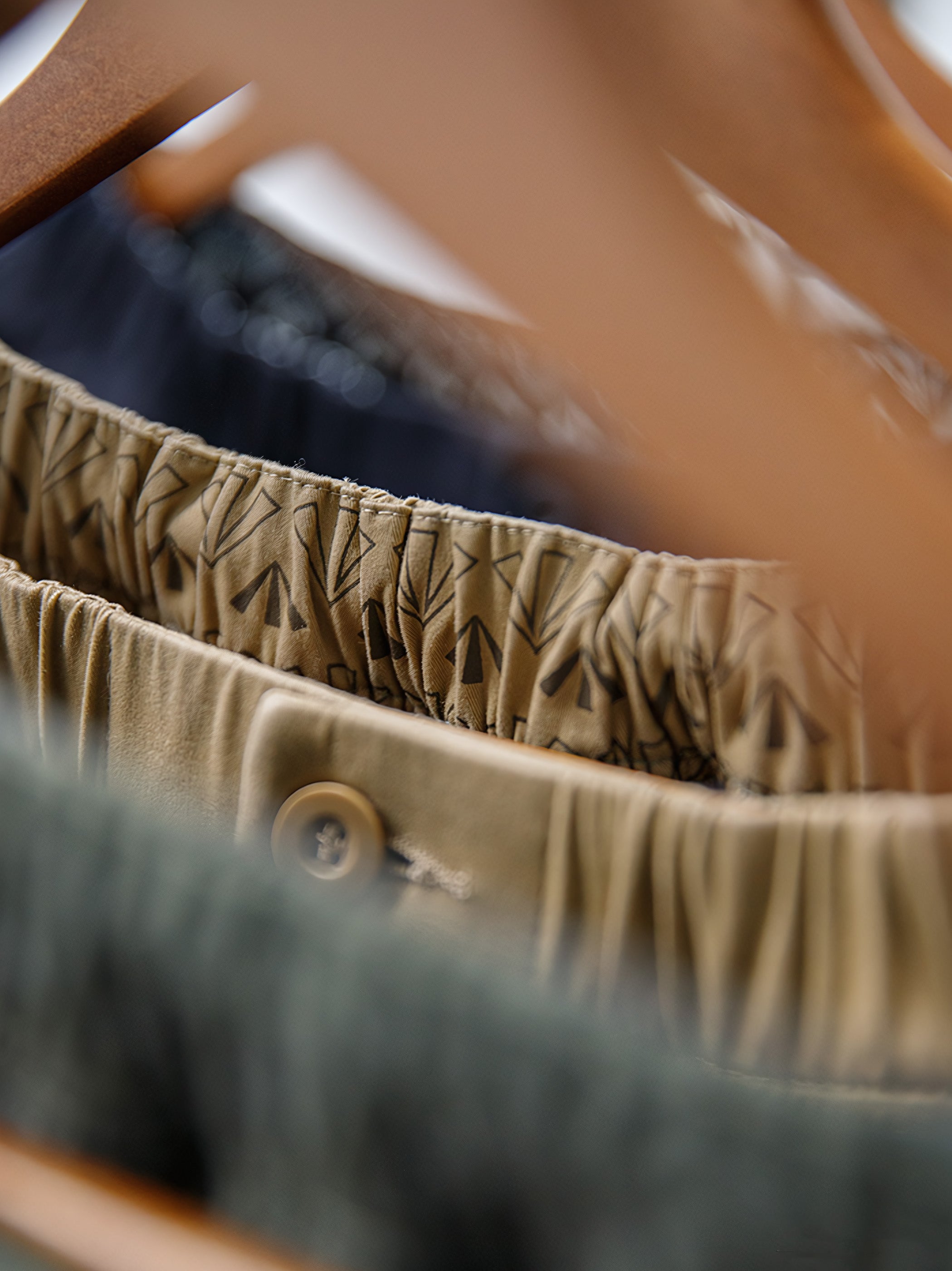 伸縮性のあるリネンコットン素材を使用したり、ウエストにゴムを使ったデザインや機能性素材を使用することで、着心地の良さを追求しています。