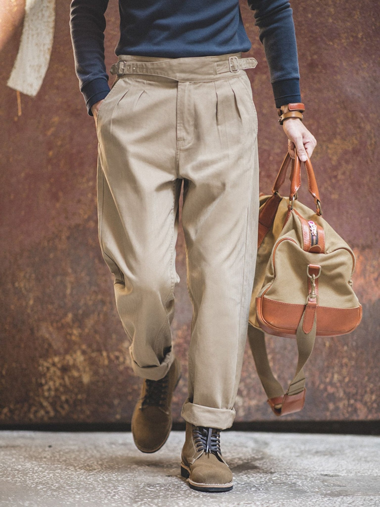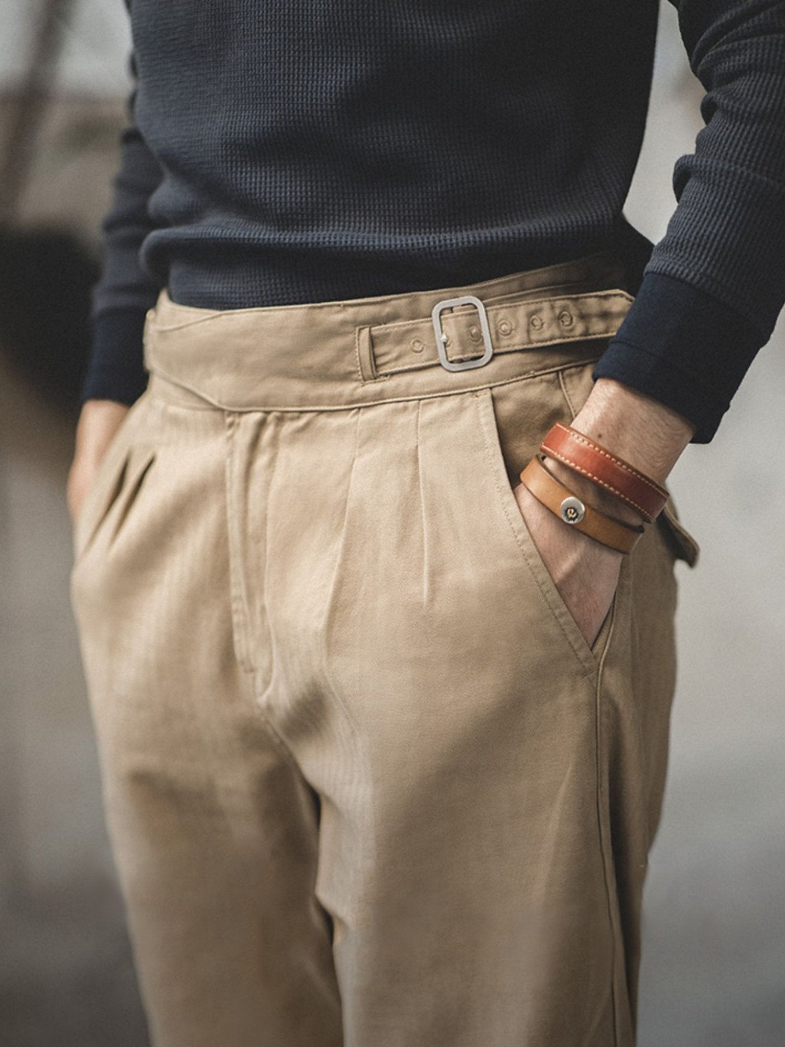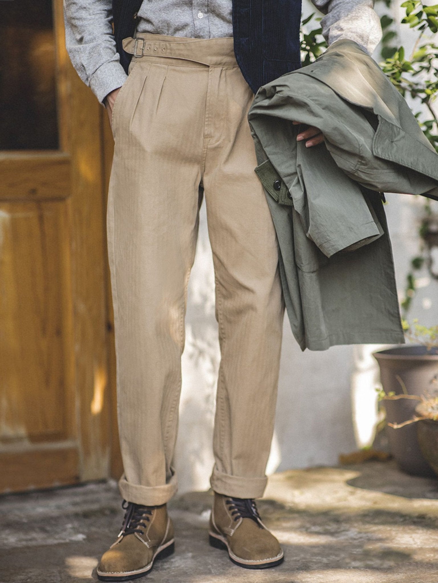 ウエスト部分の調節が可能で、6段階に調整できます。また、生地はコットン100%で、穿き込むほどに風合いが増すが特徴です。さらに、ブランドの技術力により、細部にわたる緻密なディテールにもこだわりが感じられます。