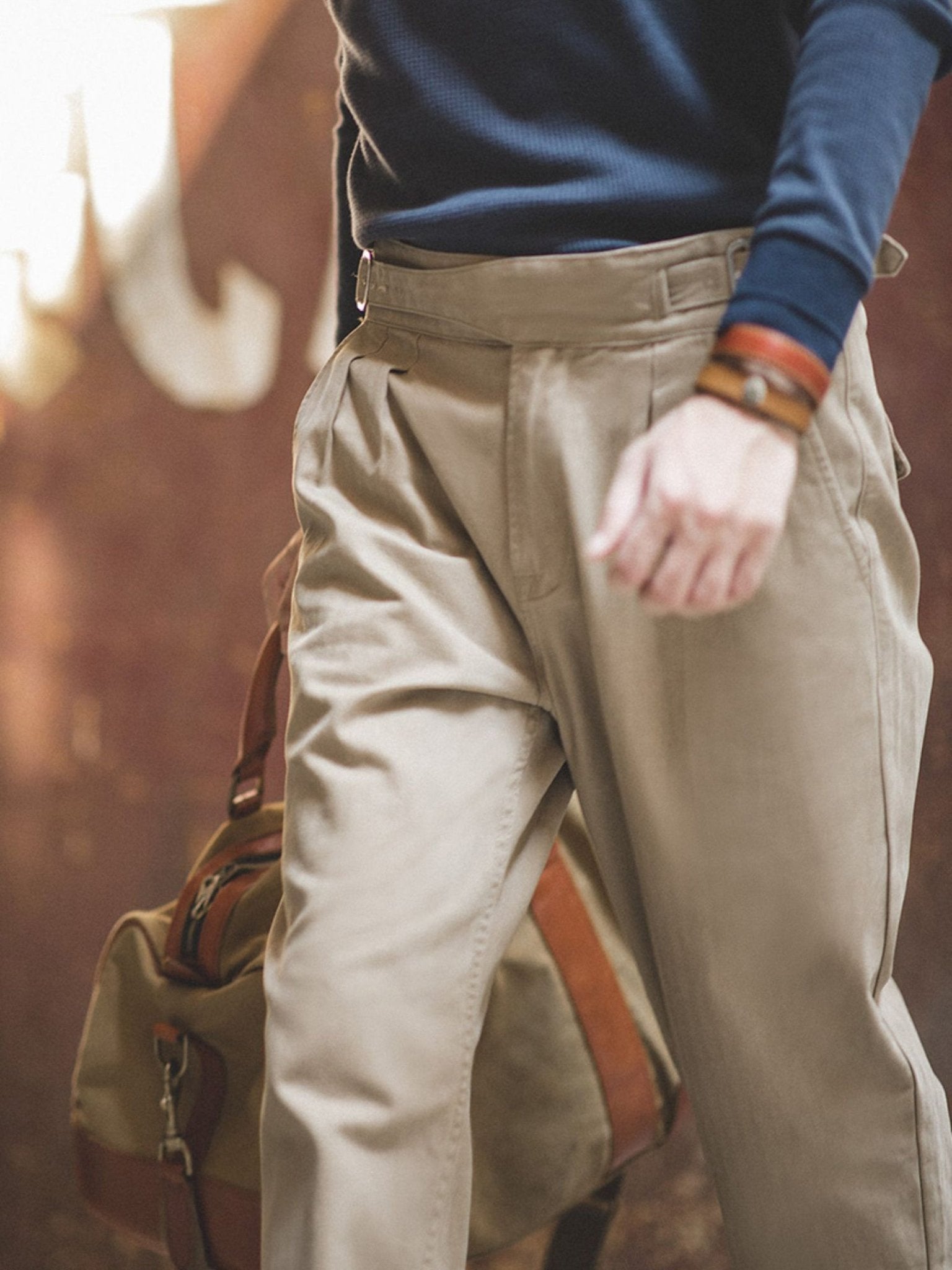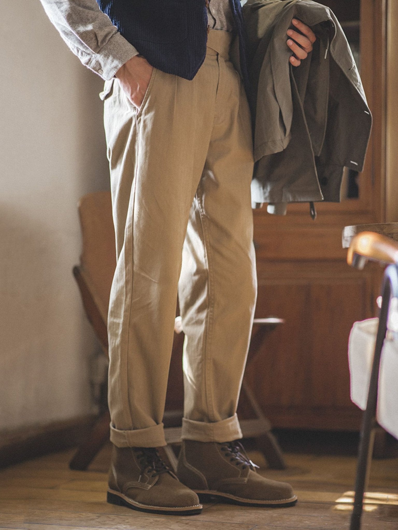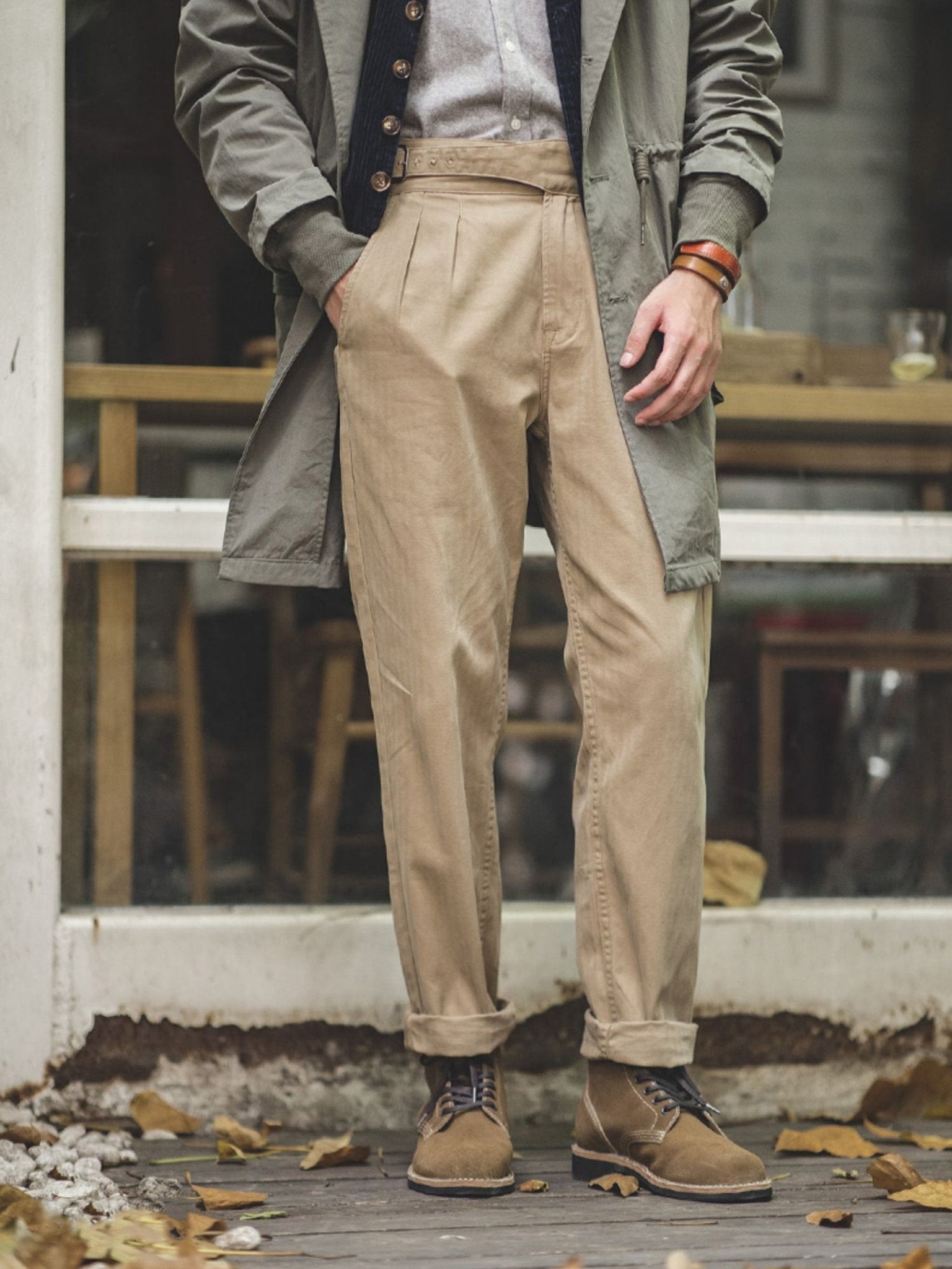 ウエスト部分の調節が可能で、6段階に調整できます。また、生地はコットン100%で、穿き込むほどに風合いが増すが特徴です。さらに、ブランドの技術力により、細部にわたる緻密なディテールにもこだわりが感じられます。