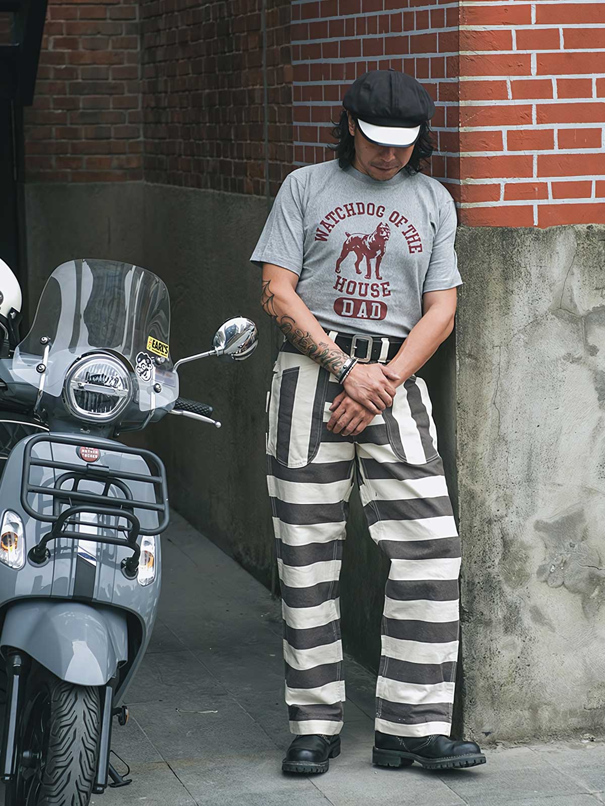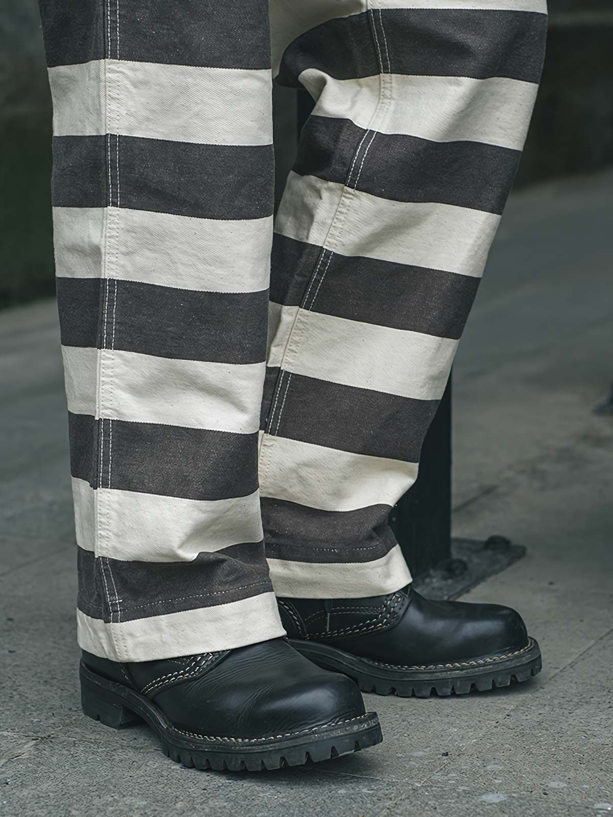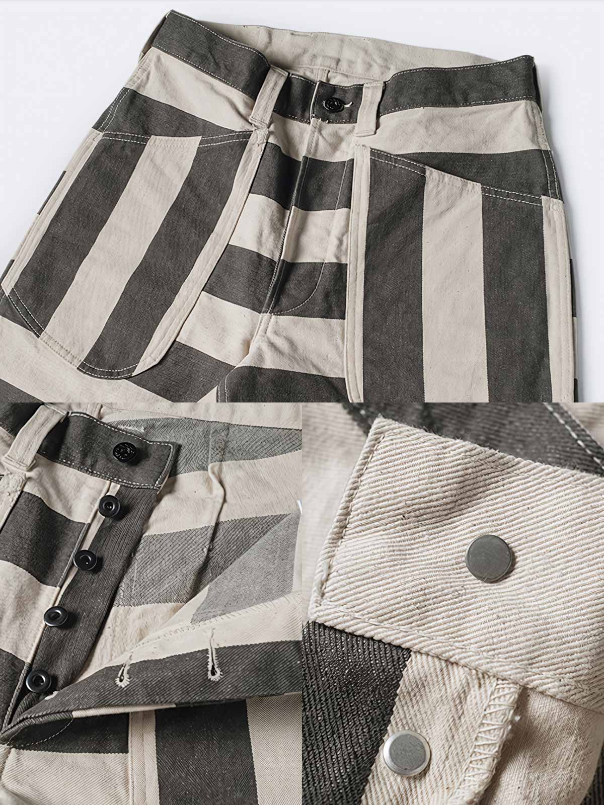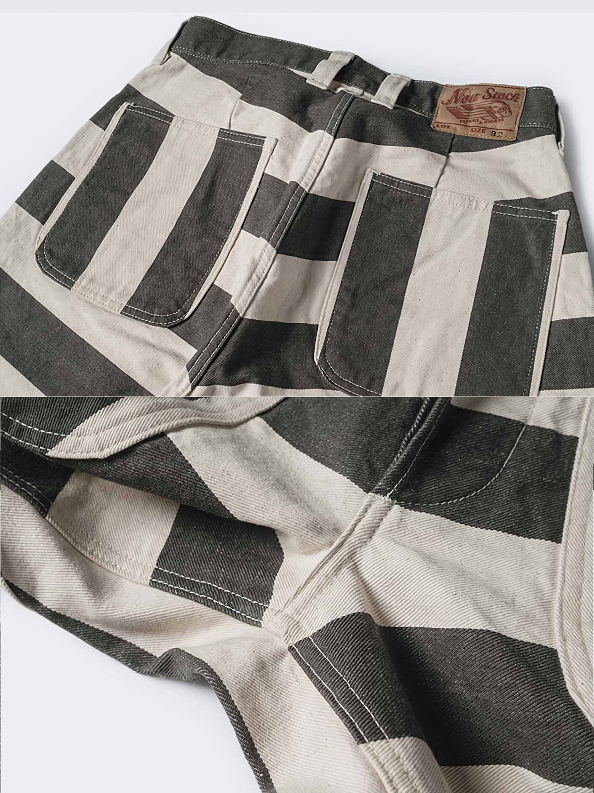 このストライプの色織りモーターサイクルパンツは、その強烈なビジュアルインパクトで目を引きます。伝統的な囚人服の黒と白のストライプは、ここではモダンなスタイルに再解釈されており、ファッションとしての遊び心を表現しています。