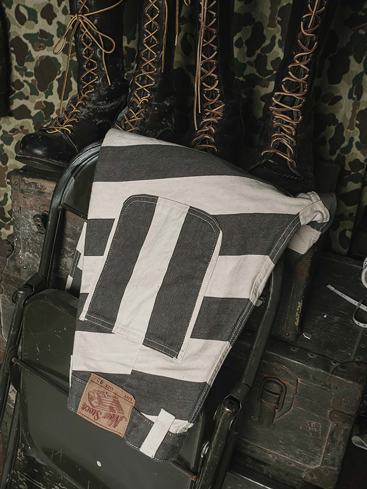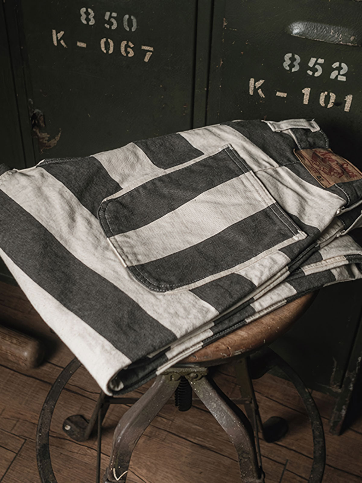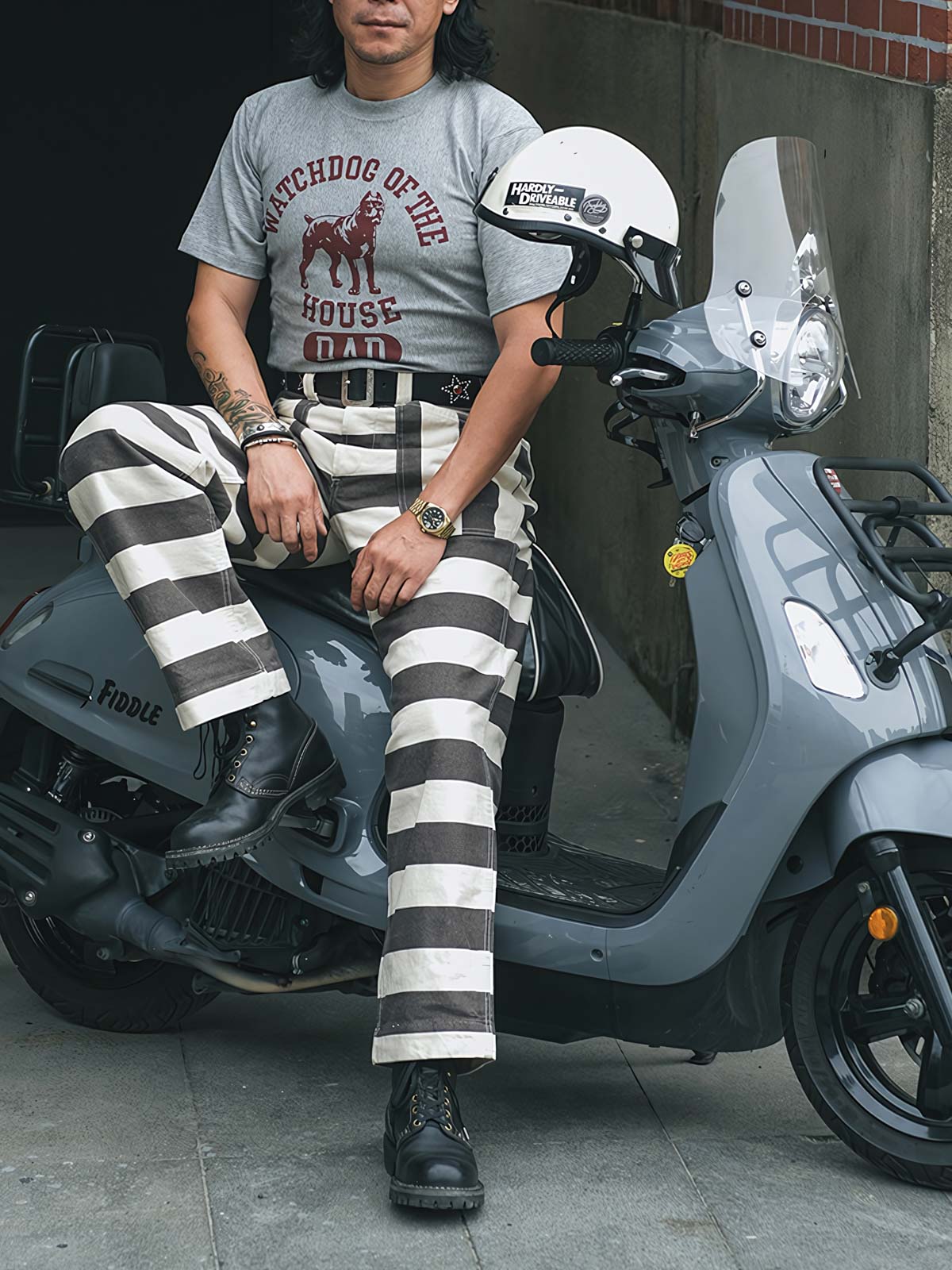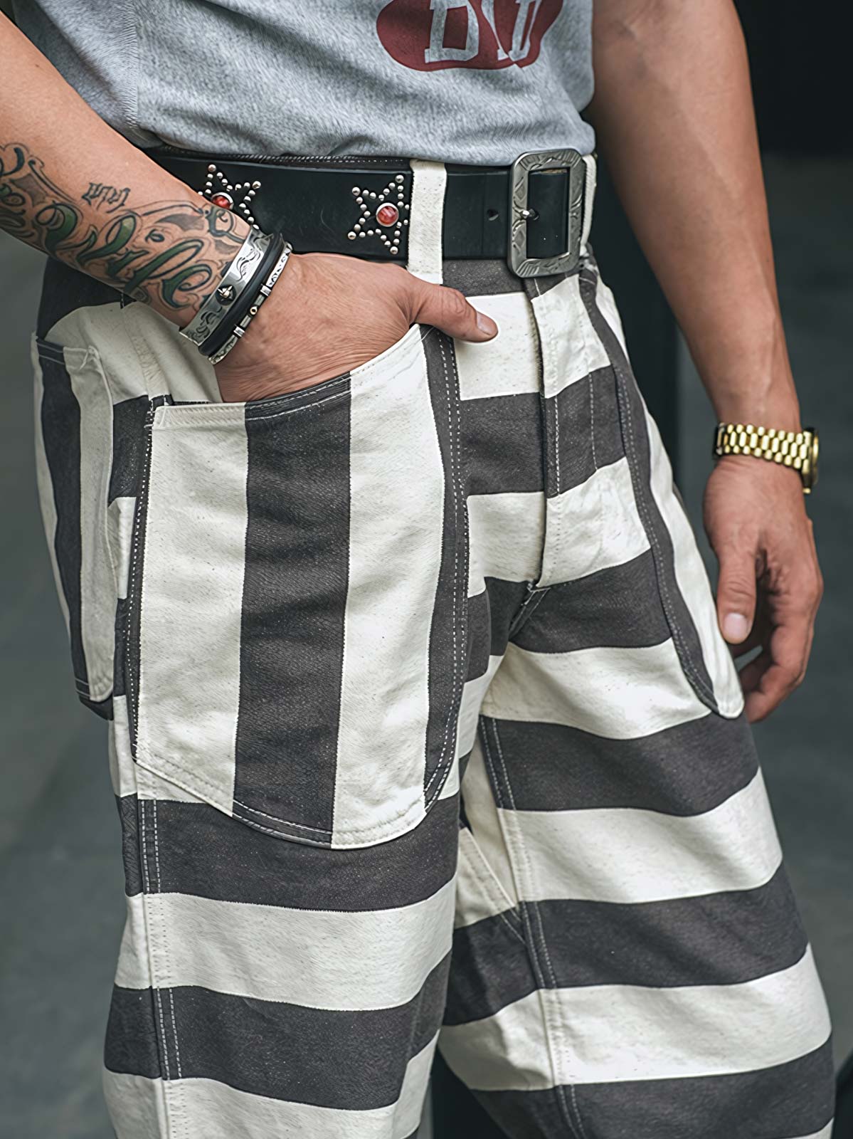 このストライプの色織りモーターサイクルパンツは、その強烈なビジュアルインパクトで目を引きます。伝統的な囚人服の黒と白のストライプは、ここではモダンなスタイルに再解釈されており、ファッションとしての遊び心を表現しています。