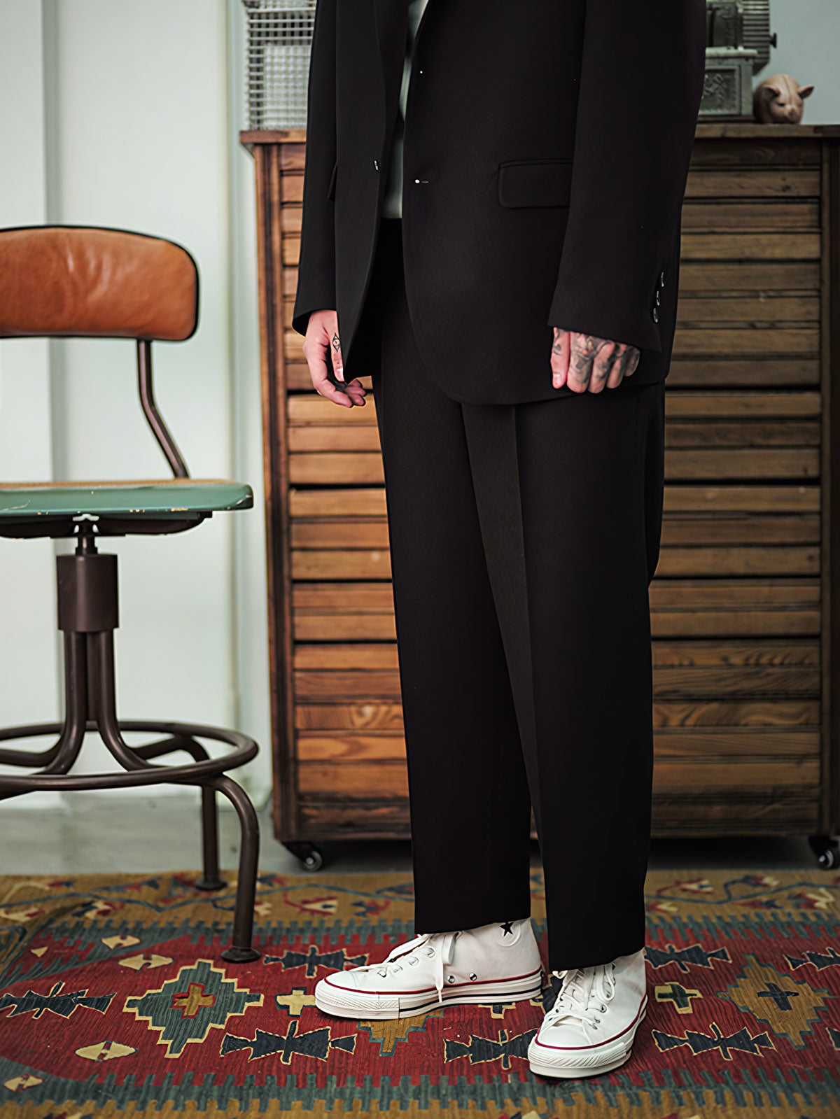 このレトロハイウエストワイドスラックスは、初期のオリジナルモデルを基に改良され、アジア人体型により適したフィット感を提供します。伝統的な製法を守りつつ、洗練されたシルエットで時代感を表現しています。ドイツ製グートマンコアスパン糸と本牛角ボタンを使用し、ディテールにこだわった高品質な仕上がりです。LabourUnionの製作部門による少量生産で、高品質を確保しています。ブラックカラーはさまざまなシーンに合わせやすく、素材とシルエットの完璧な状態を保つためにドライクリーニングをお勧めします。