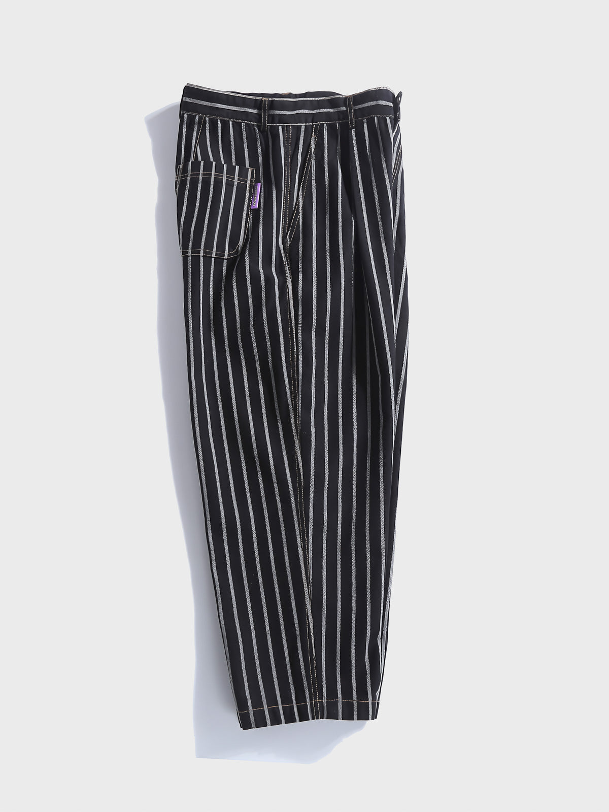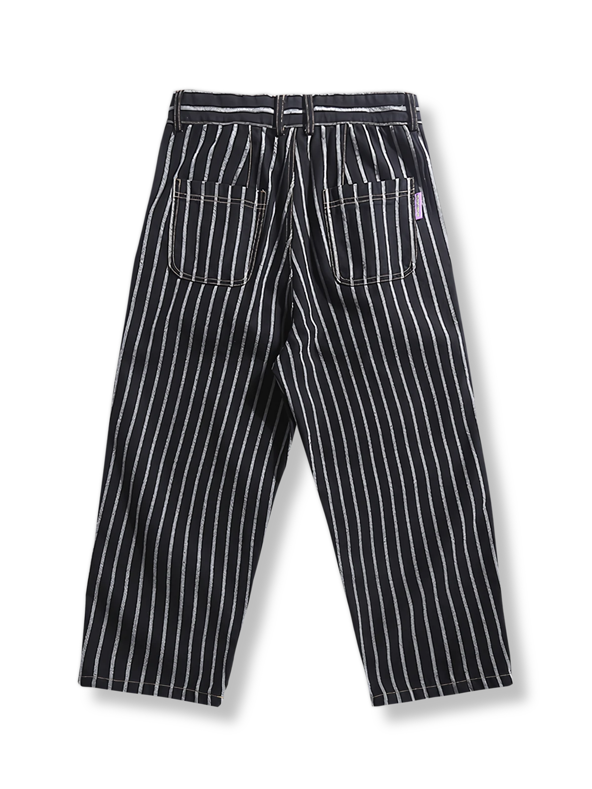 クラシックなヴィンテージストライプデザインのコットンデニムワイドパンツで、レトロなストリートスタイルを簡単に演出。