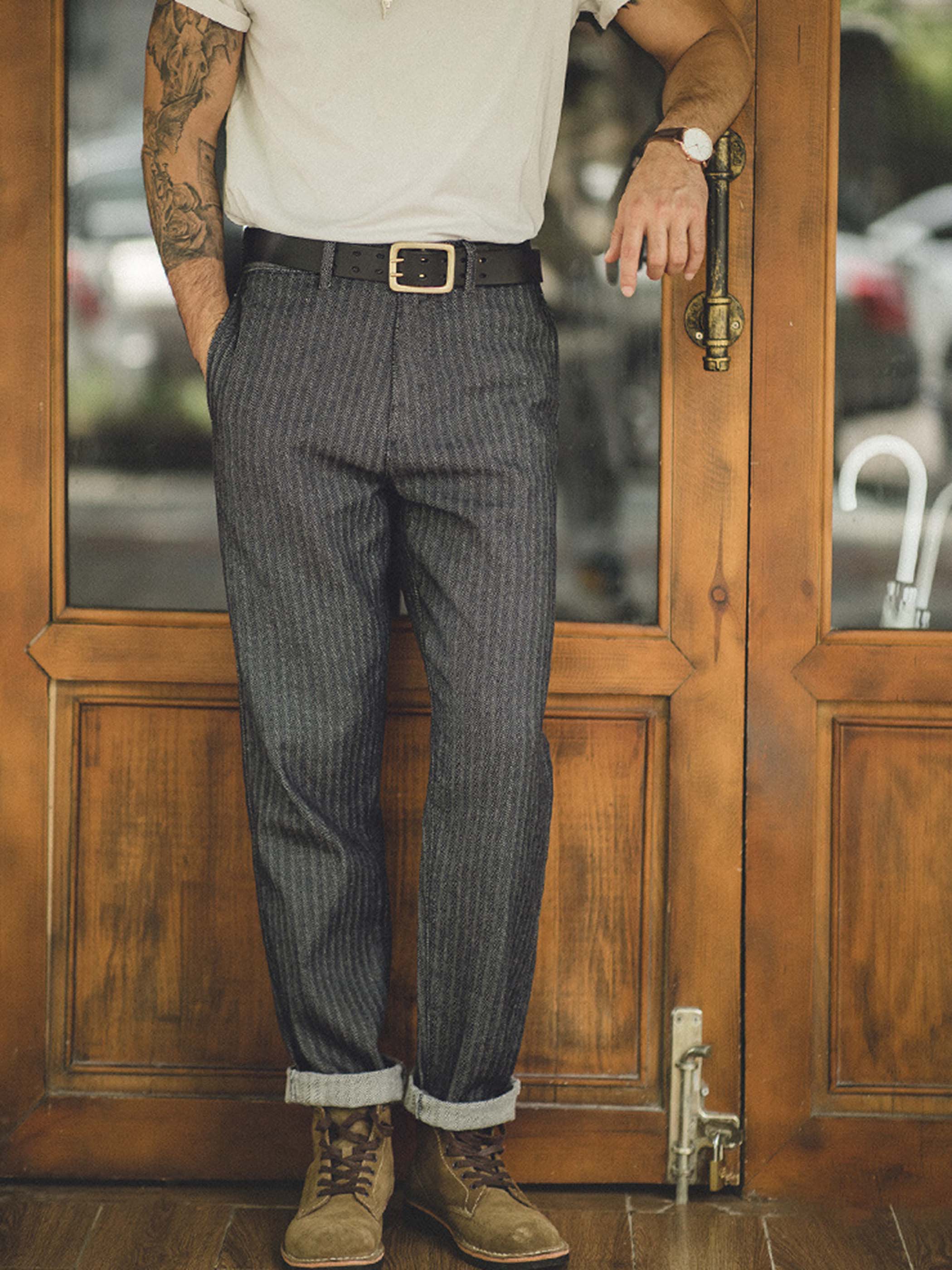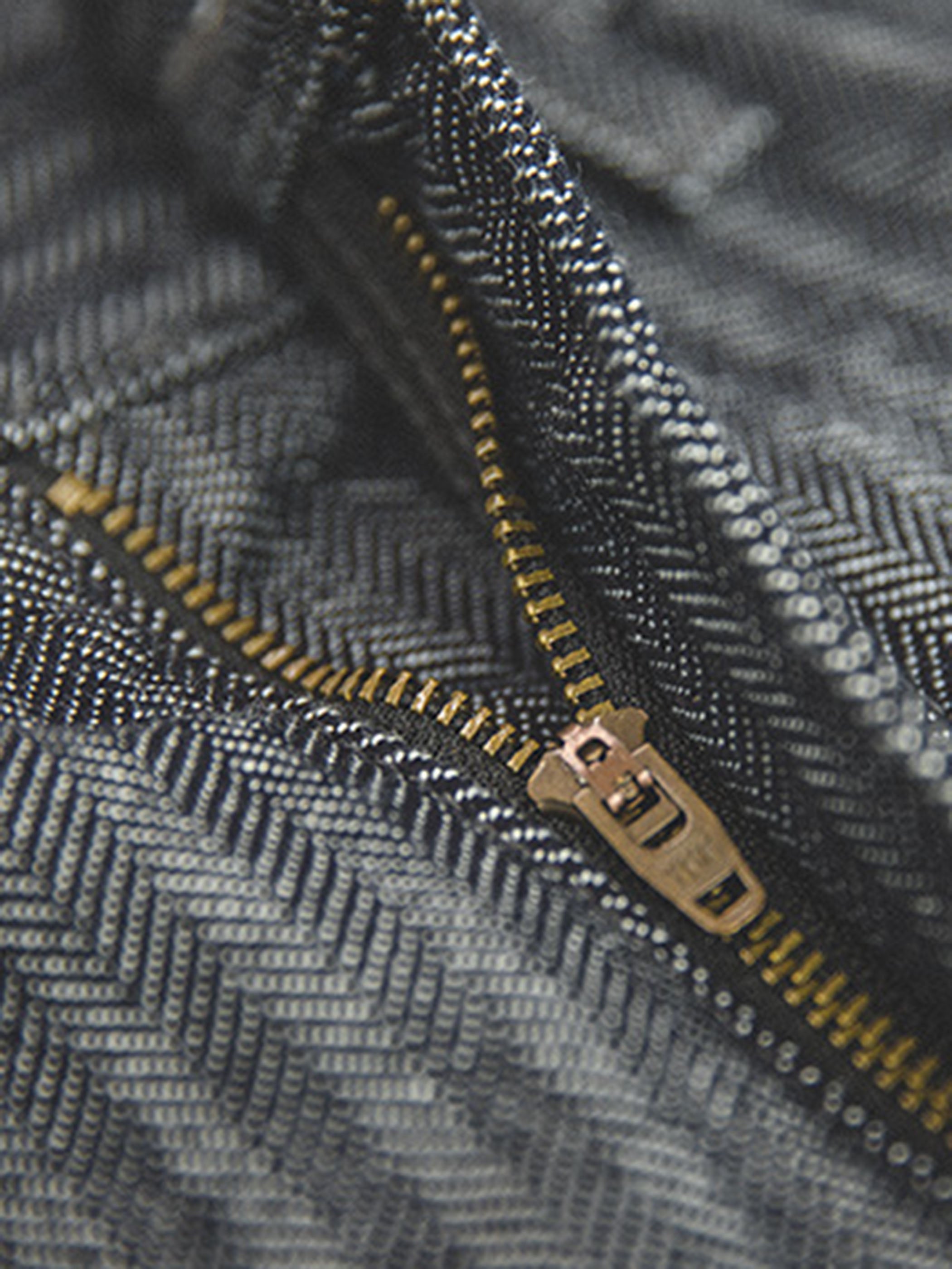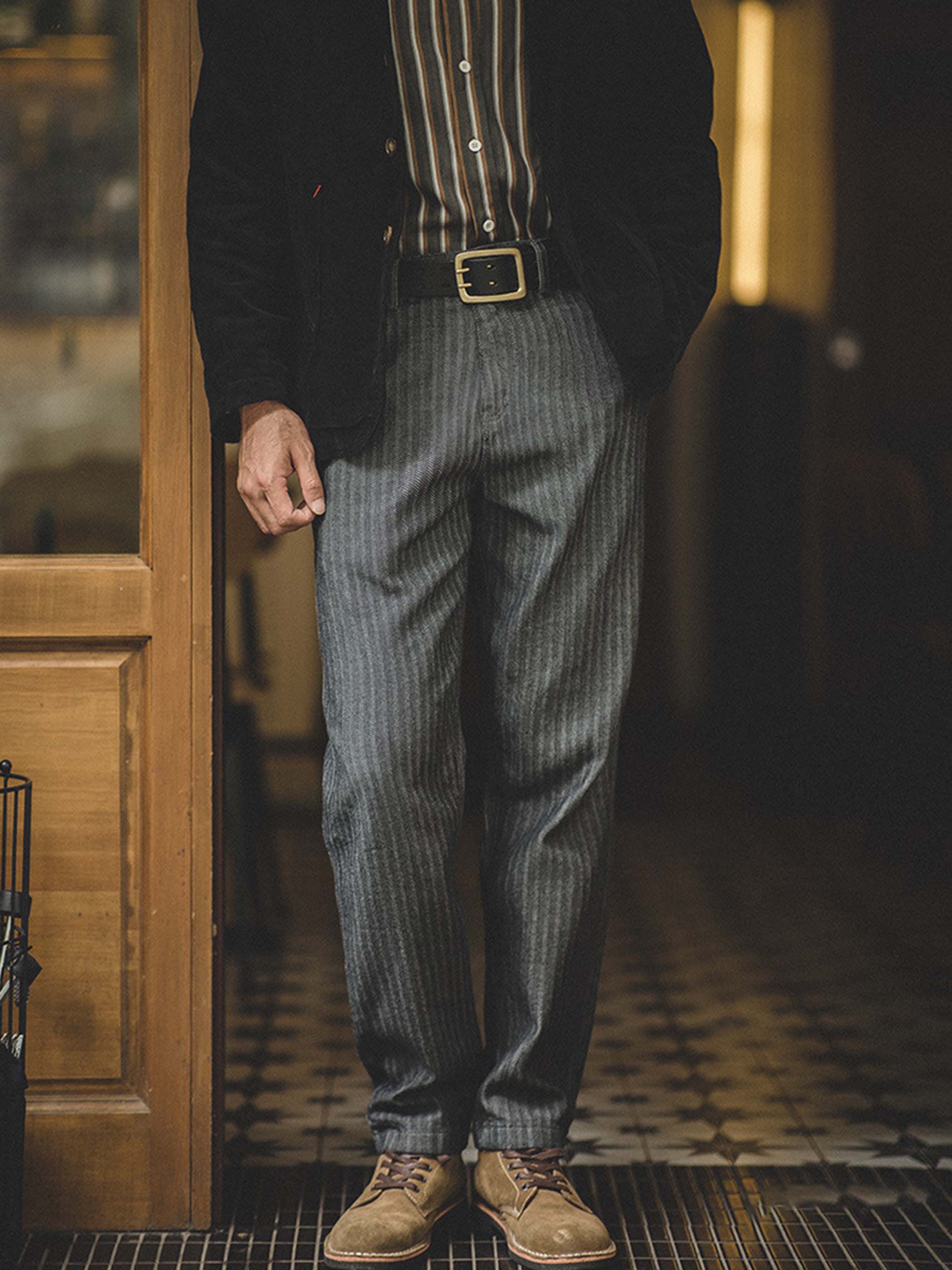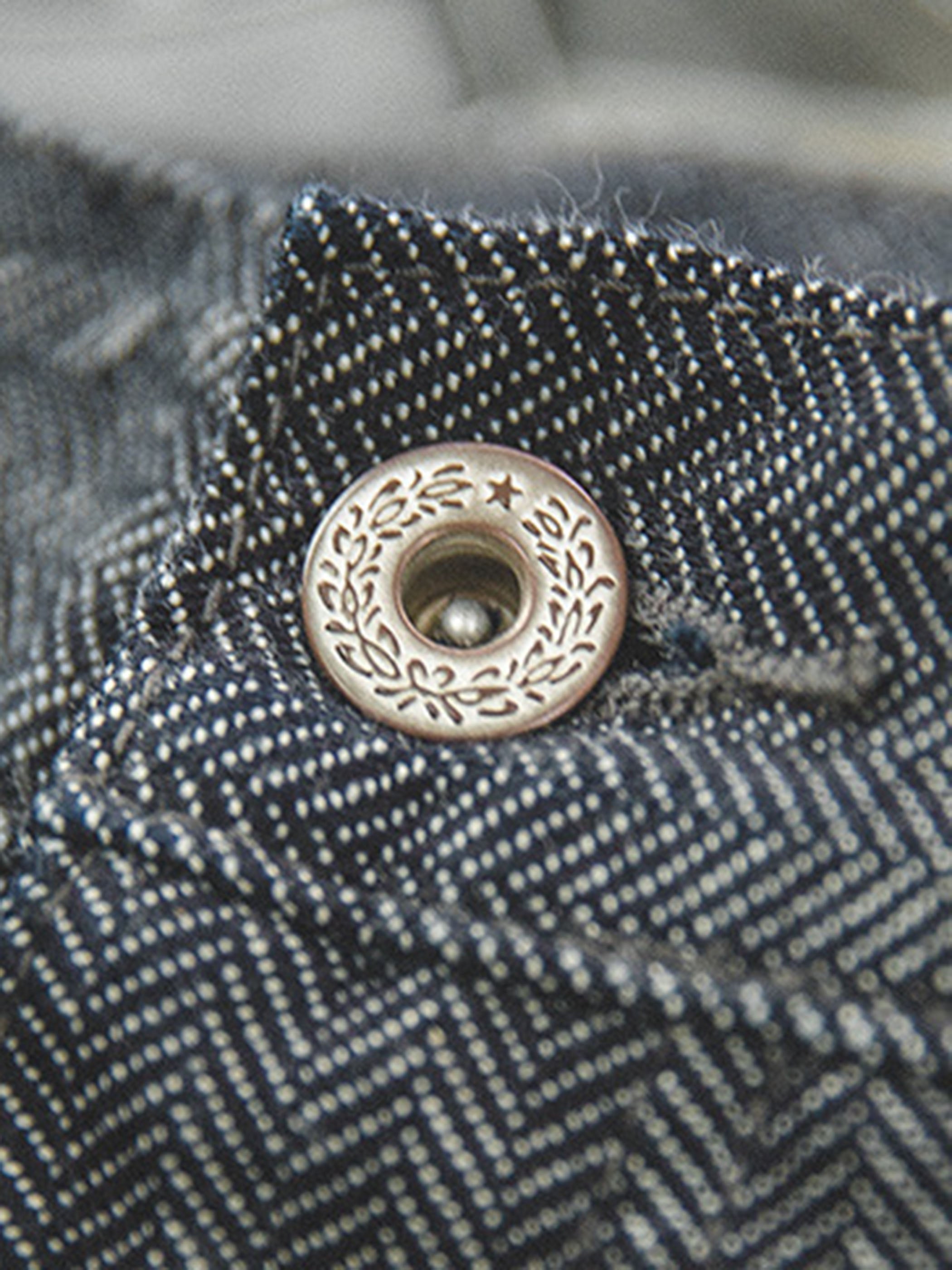 ヴィンテージ感あふれるヘリンボーン織りとクラシックなストレートシルエットが魅力のワークスタイルデニム。