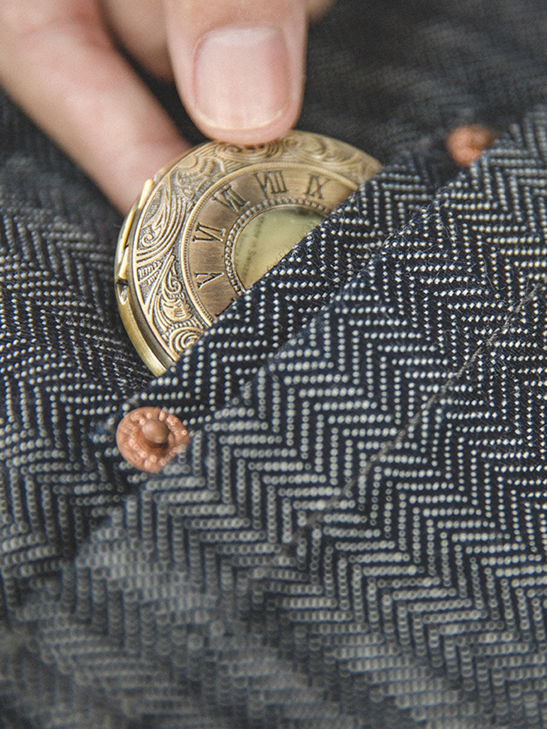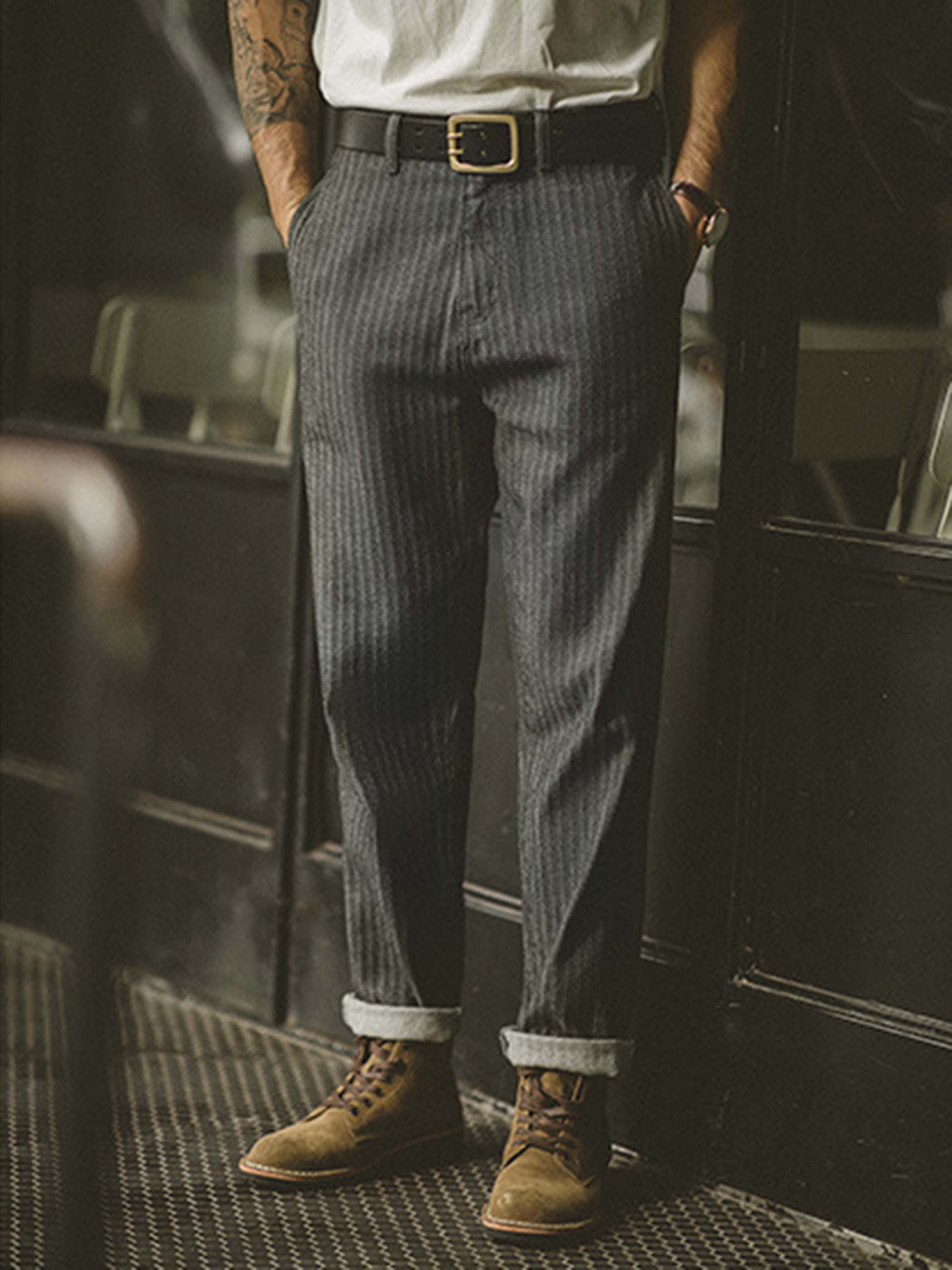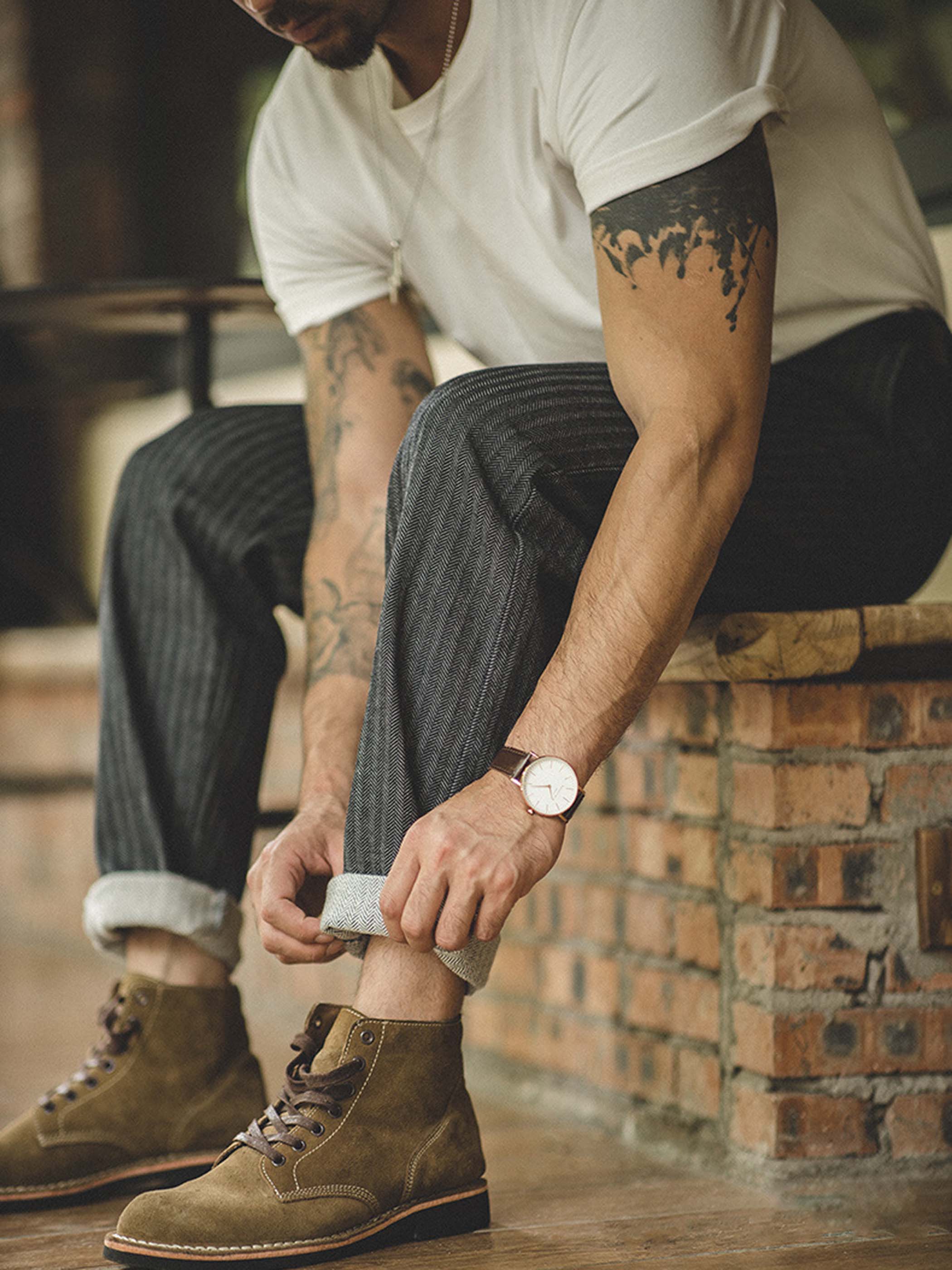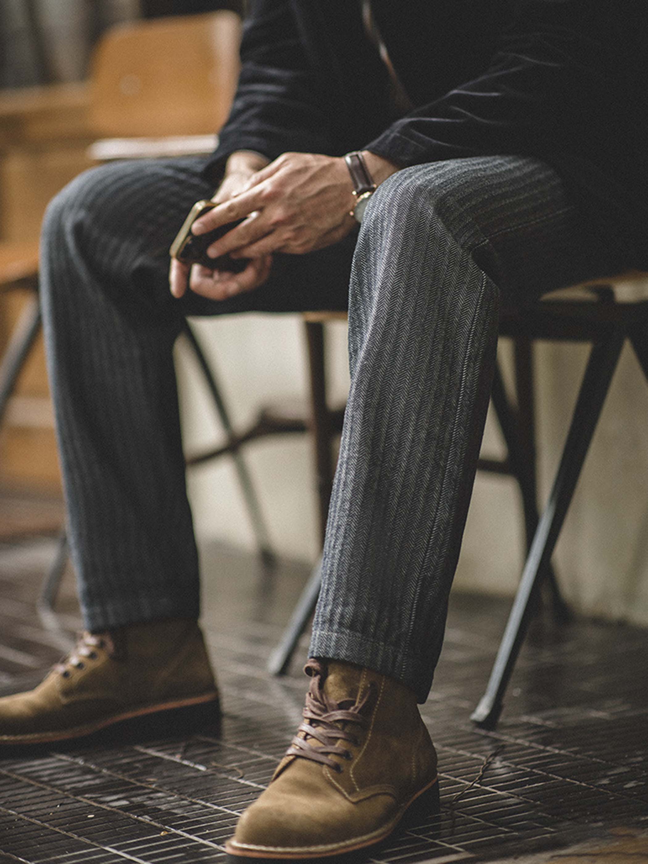 ヴィンテージ感あふれるヘリンボーン織りとクラシックなストレートシルエットが魅力のワークスタイルデニム。