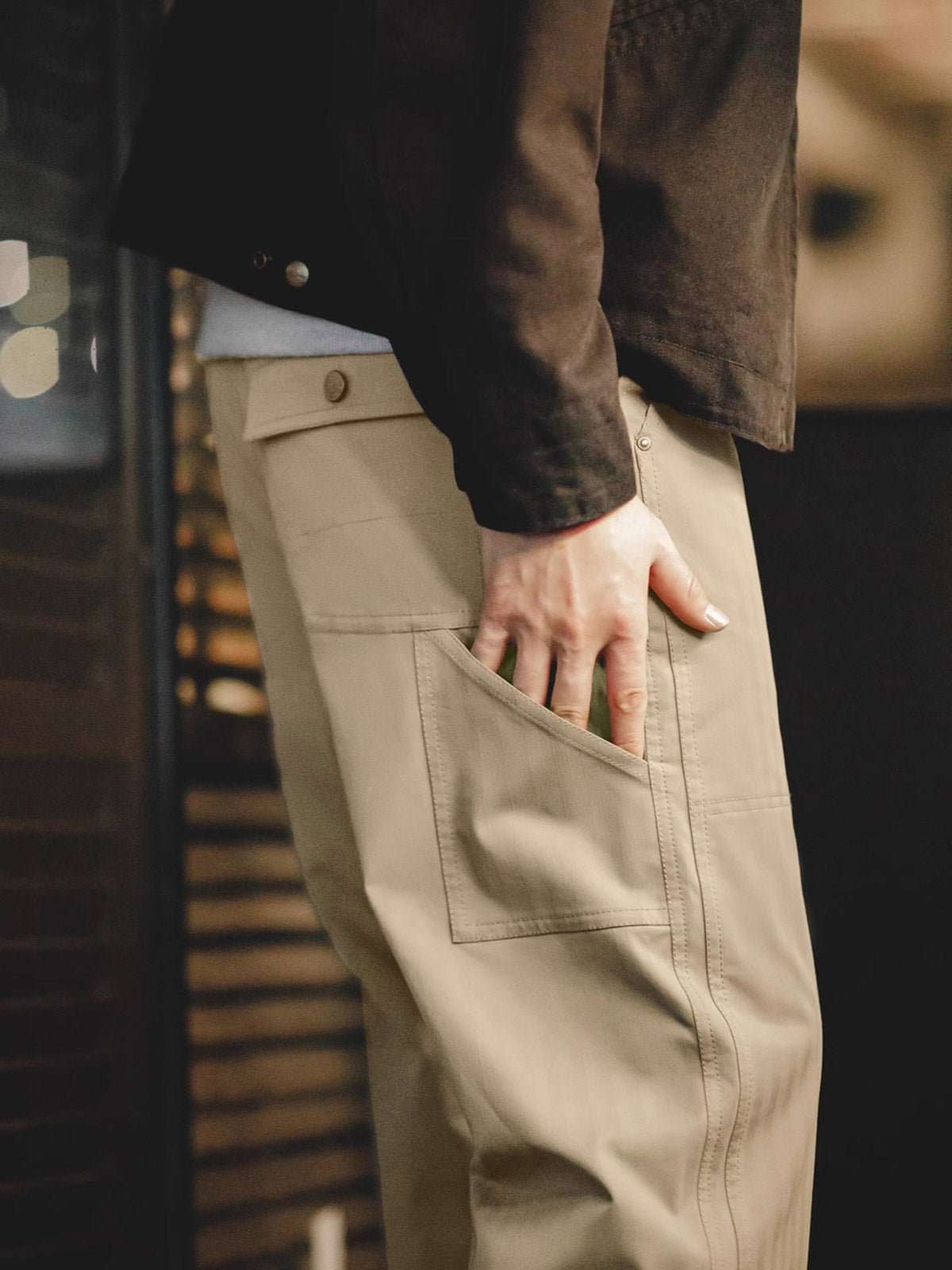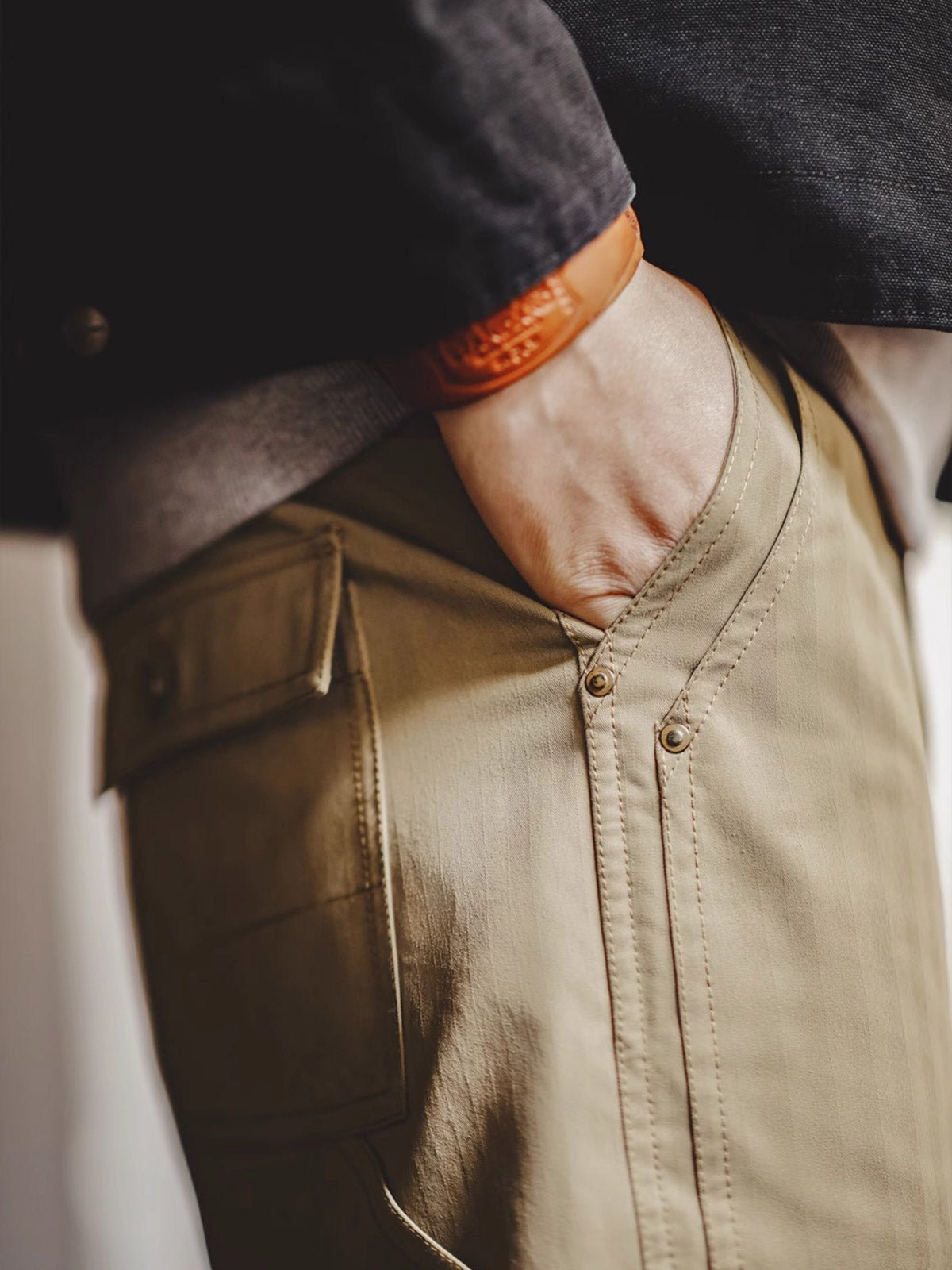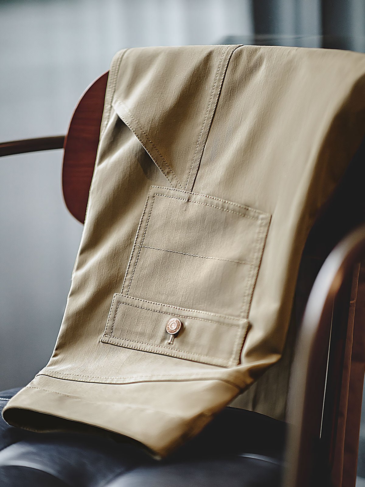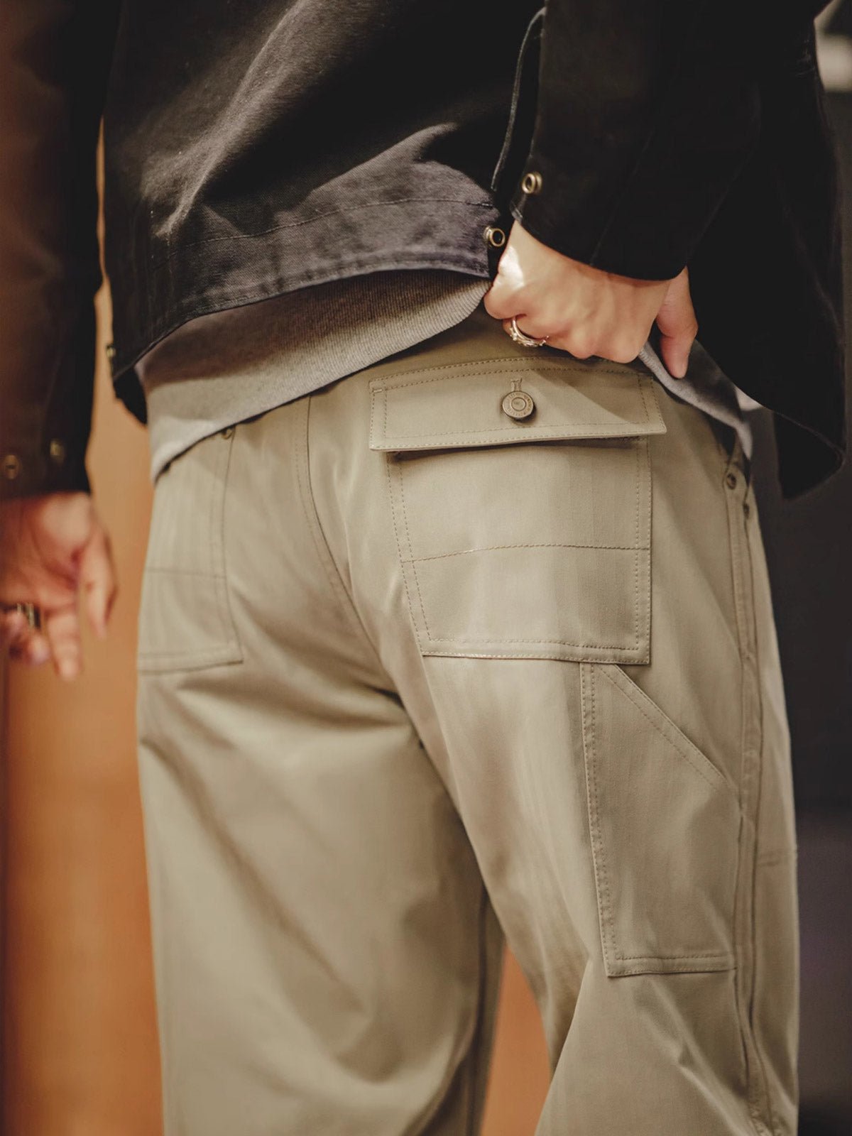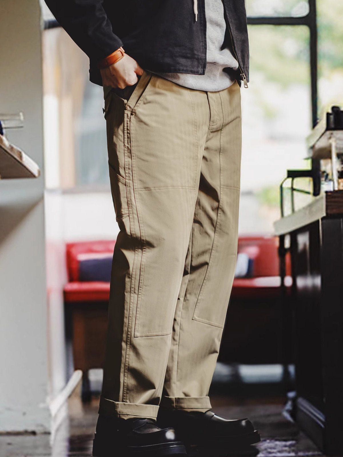 高密度のコットン素材を使用し、耐久性がありながら透気性も保持しており、四季を通じて快適に着用できます。精密な縫製技術と強化された継ぎ目の処理は、優れた技術を示しています。落ち着いたカーキ色は、汚れに強く、さまざまな服との組み合わせが容易で、非常に実用的です。