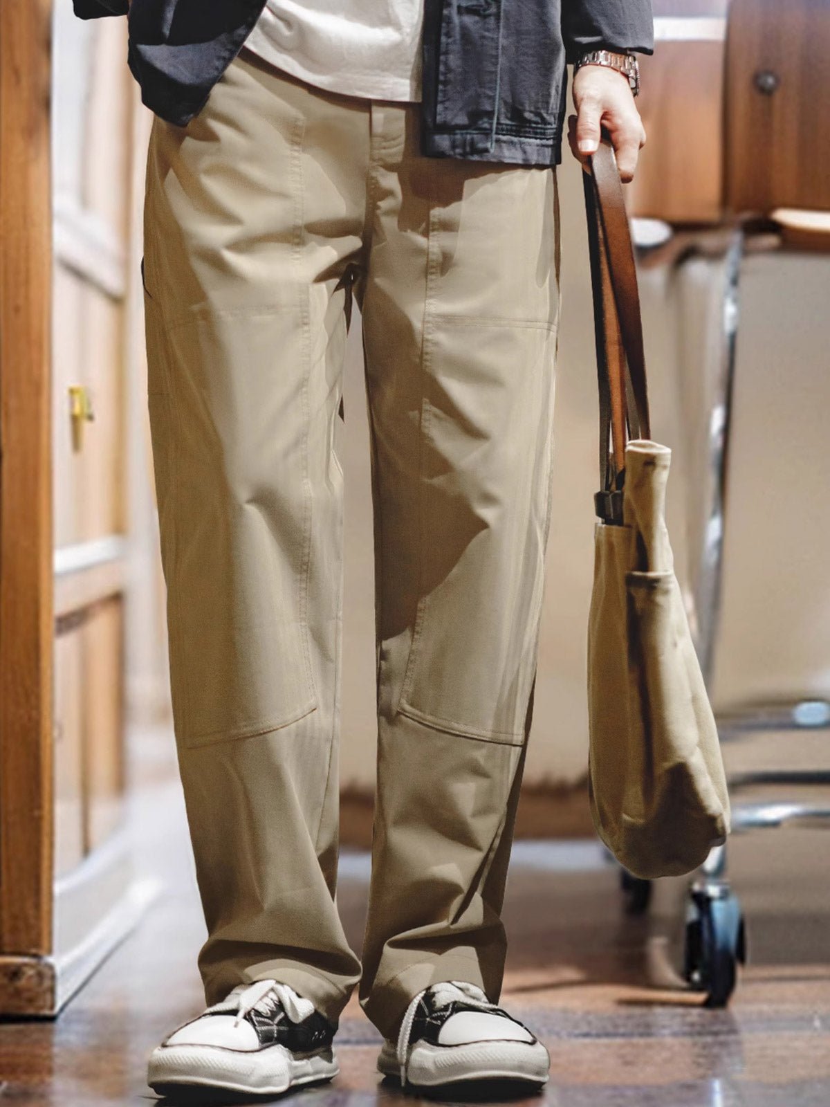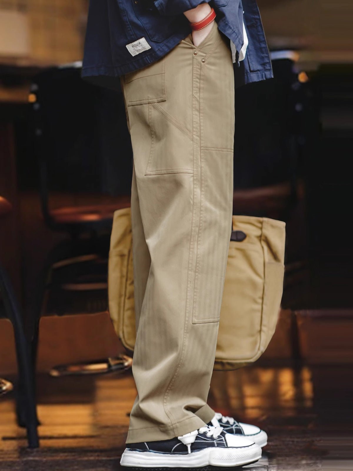 このメンズ用ダブルニーパッチログガーパンツは、20世紀初頭のアメリカの労働者、特に伐採作業員が着用していた実用的な作業着にインスパイアされています。歴史的には、このタイプのパンツは過酷な屋外作業環境に耐えるために設計され、耐摩耗性と耐久性で人気を博しました。現在では、産業労働の実用的な衣服から、都市の男性が求めるレトロ感と機能性を兼ね備えたファッショナブルなアイテムへと変化しています。