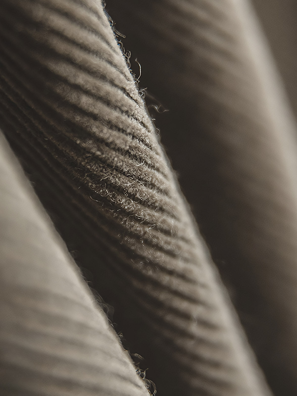 コーデュロイはその独特の織りと柔らかな質感で知られ、19世紀から様々な衣類に使用されています。特に秋冬シーズンには、その耐久性と保温性で人気があり、長く愛され続けている素材です。