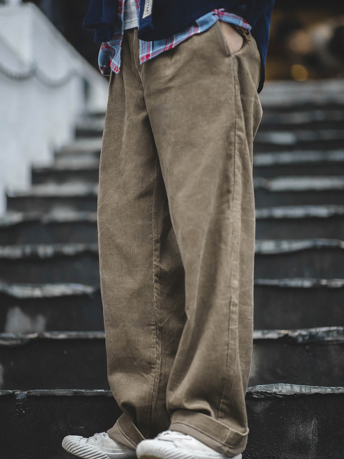このパンツは100%綿のコーデュロイ生地を使用しており、優れた通気性と吸湿性を誇ります。繊細なテクスチャーは触り心地の良さだけでなく、視覚的な層を加えています。シンプルなデザインで、クラシックなサイドポケットとバックポケットが特徴です。