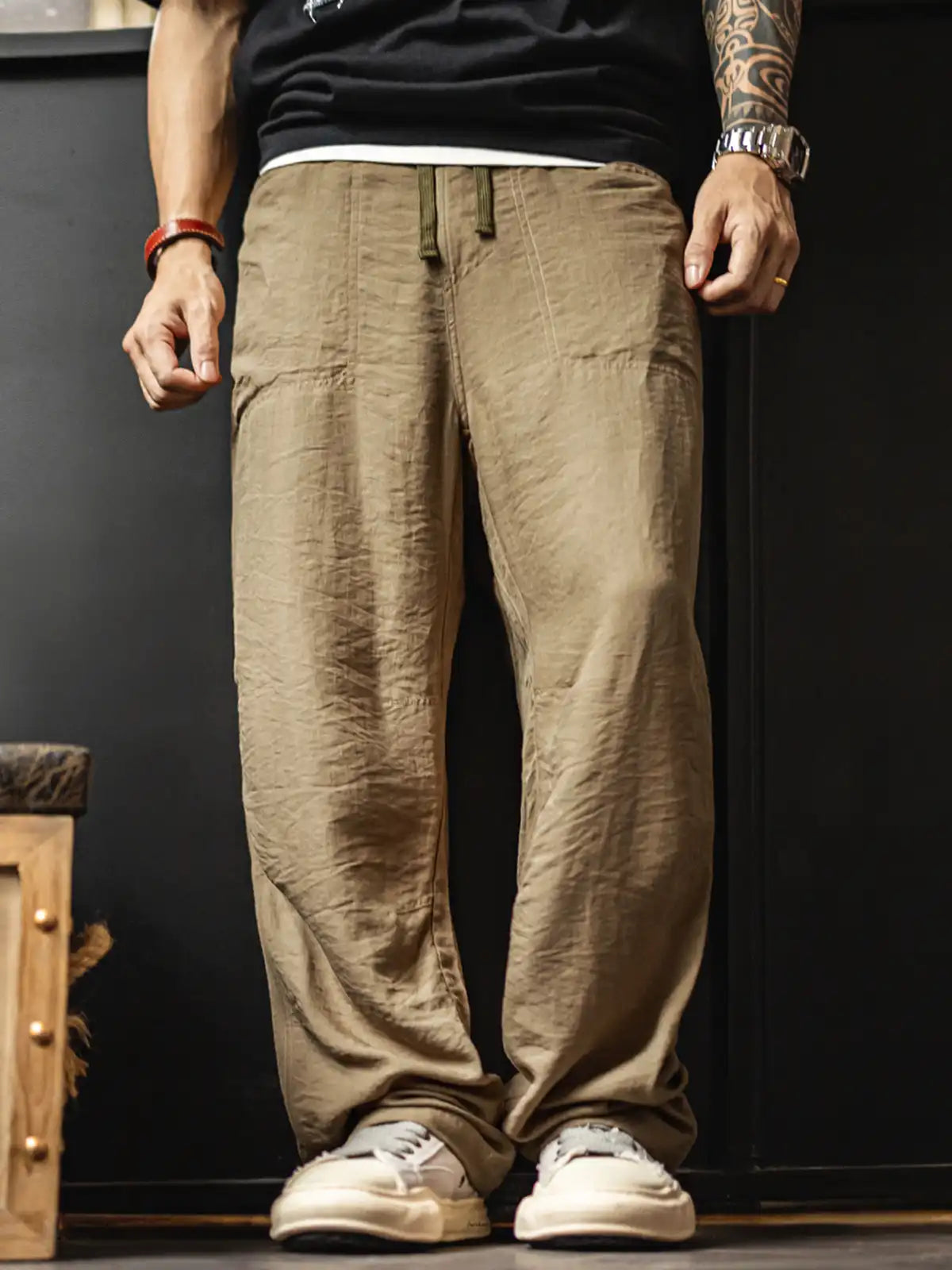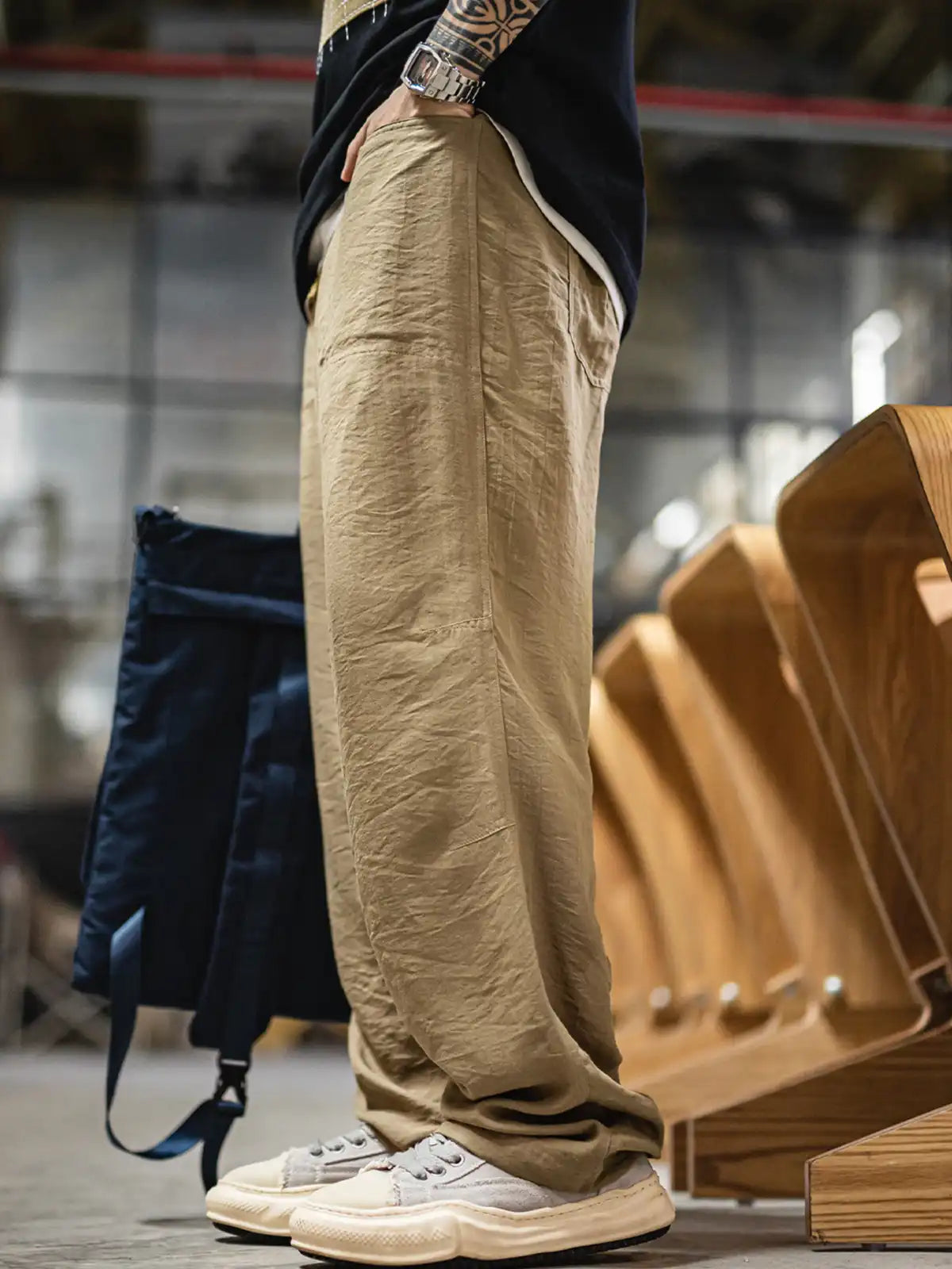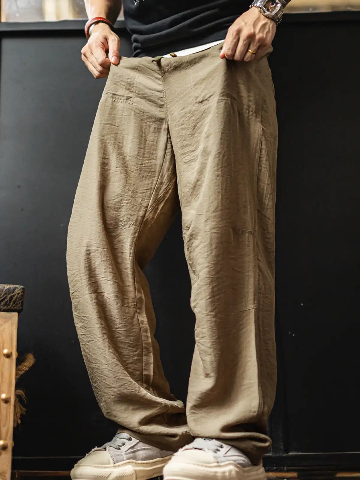 1940年代のミリタリーベイカーパンツの直筒シルエットを継承しつつ、吸湿性と光沢感に優れたリヨセル(ライオセル)と麻混紡生地を採用。125g/m²の薄手ながらしなやかで自然なドレープを生み出す。特徴的なL字型フロントポケットやバックポケットはボタン留め仕様に改良し、実用性も高い。動きに合わせて自然にできるシワはこの素材の味わい。洗濯後は陰干しし、シワは低温アイロンで整えることを推奨。