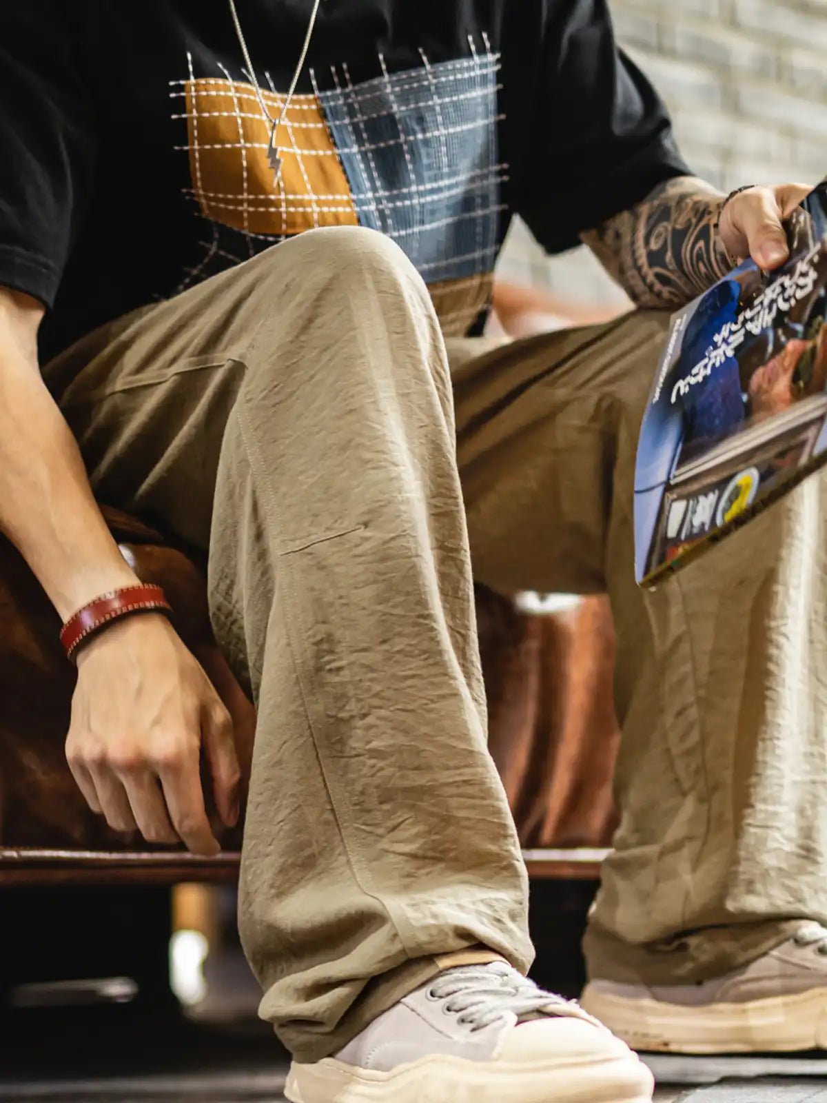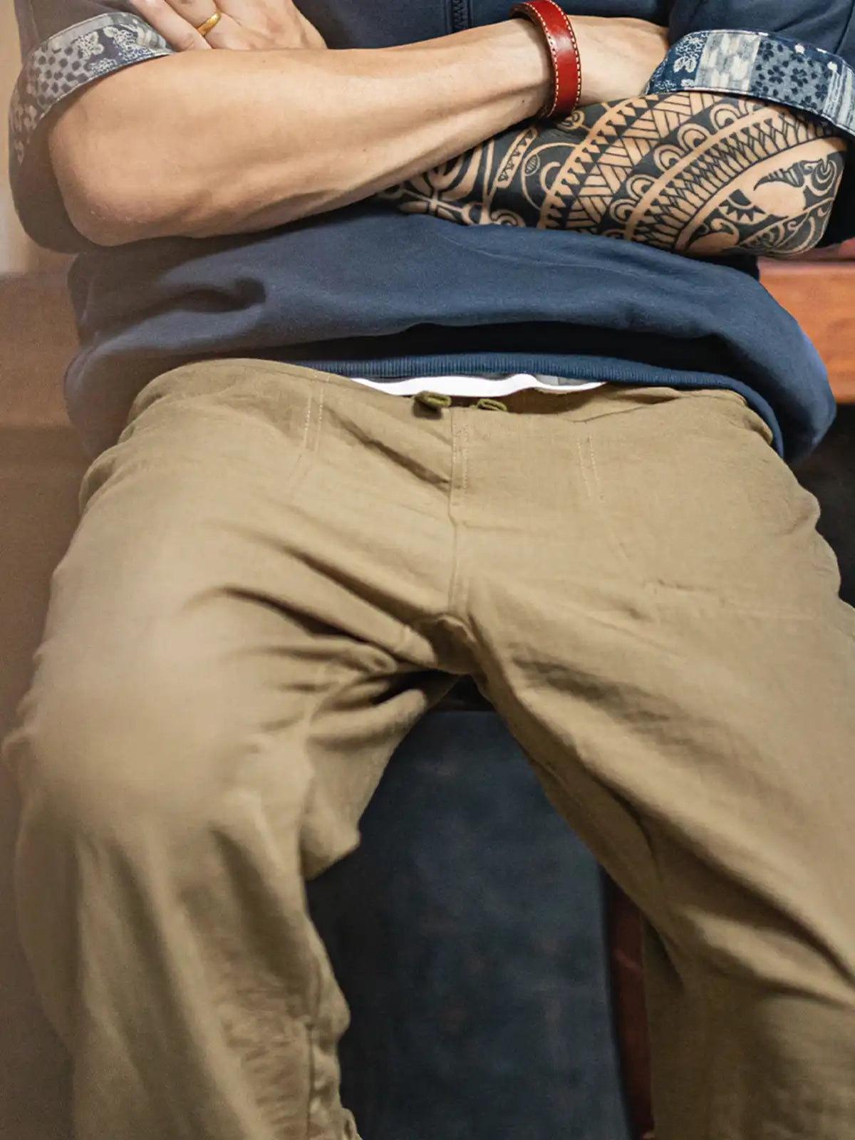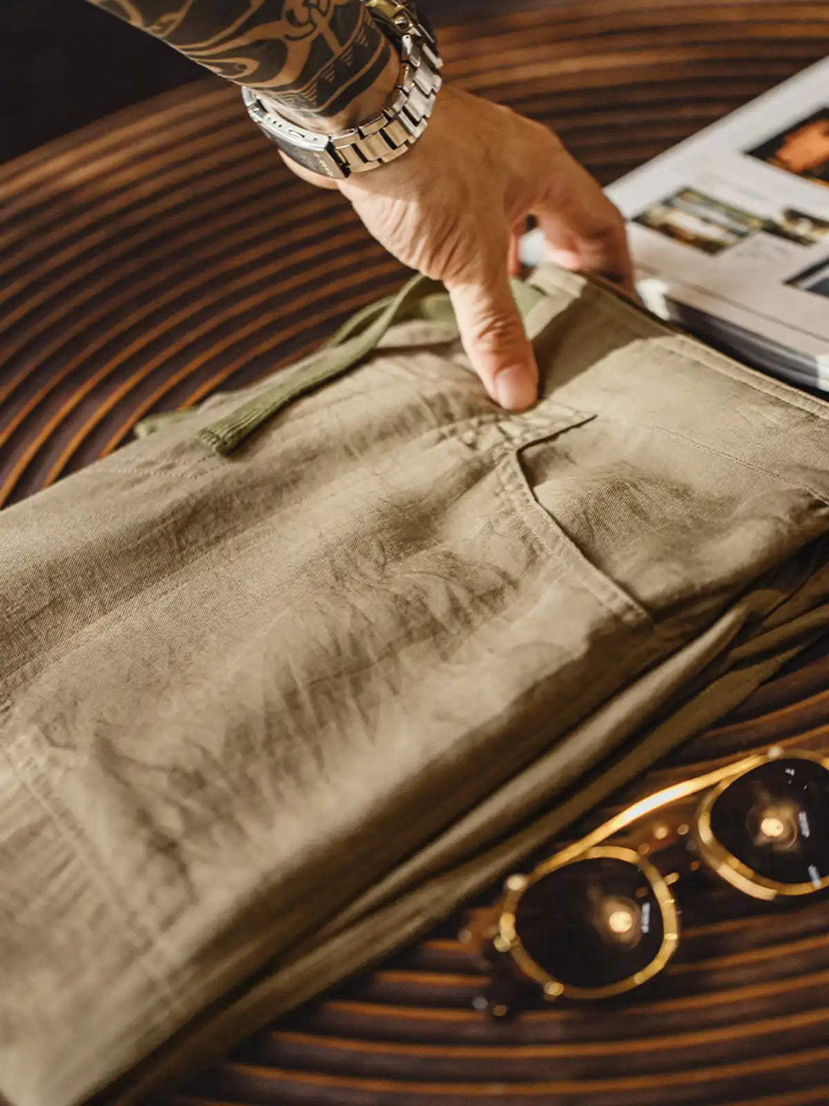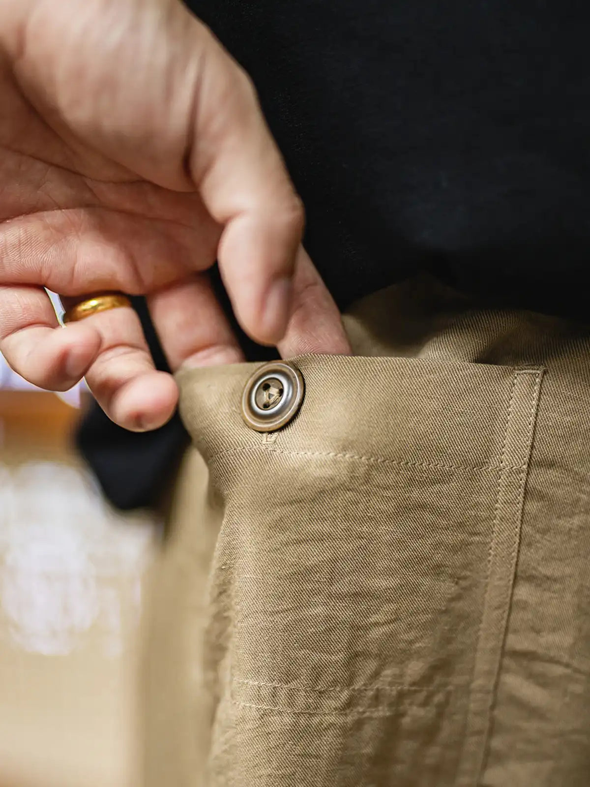1940年代のミリタリーベイカーパンツの直筒シルエットを継承しつつ、吸湿性と光沢感に優れたリヨセル(ライオセル)と麻混紡生地を採用。125g/m²の薄手ながらしなやかで自然なドレープを生み出す。特徴的なL字型フロントポケットやバックポケットはボタン留め仕様に改良し、実用性も高い。動きに合わせて自然にできるシワはこの素材の味わい。洗濯後は陰干しし、シワは低温アイロンで整えることを推奨。