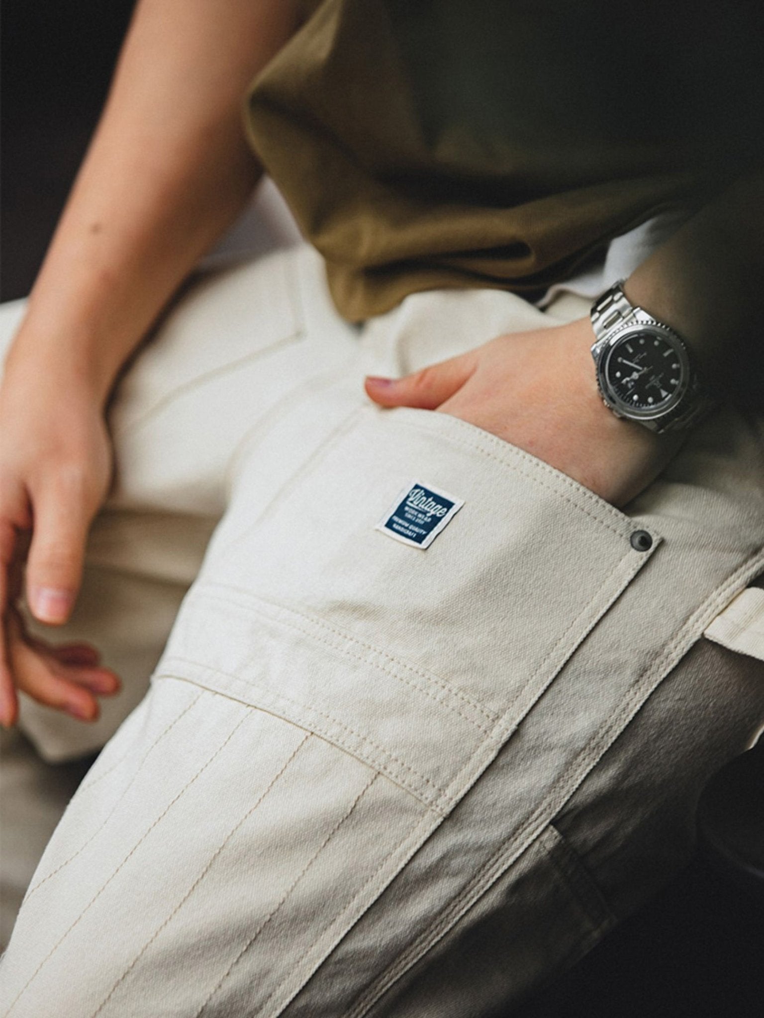 本アイテムはペインターパンツのディテールを取り入れながら改良した、デザイン性だけでなく機能面も充実した一着です。特徴としては何といってもポケット!マルチポケットのデザインで用途に合わせた収納ができる機能性に優れた仕様になっている。