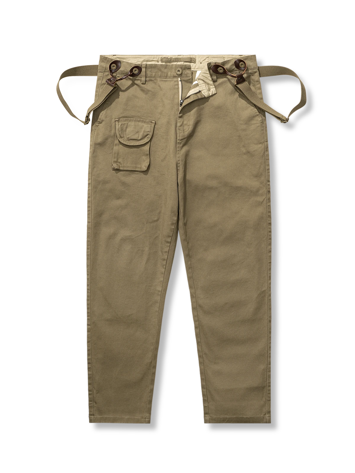サスペンダーを付くかどうかの着こなしは基本のコーデの楽しみポイントです。全体のスタイルにファッション性とレトロ感を演出しています。