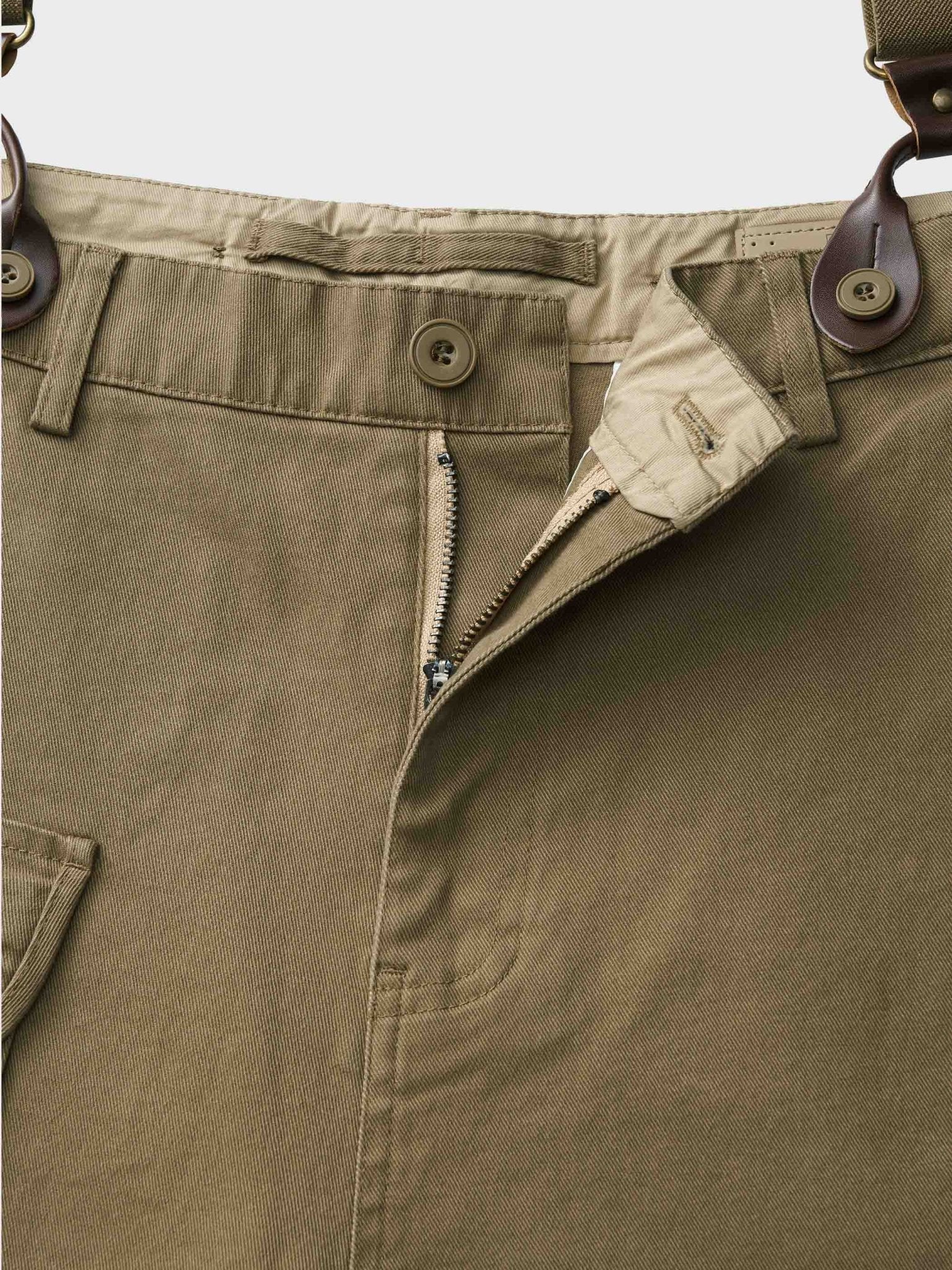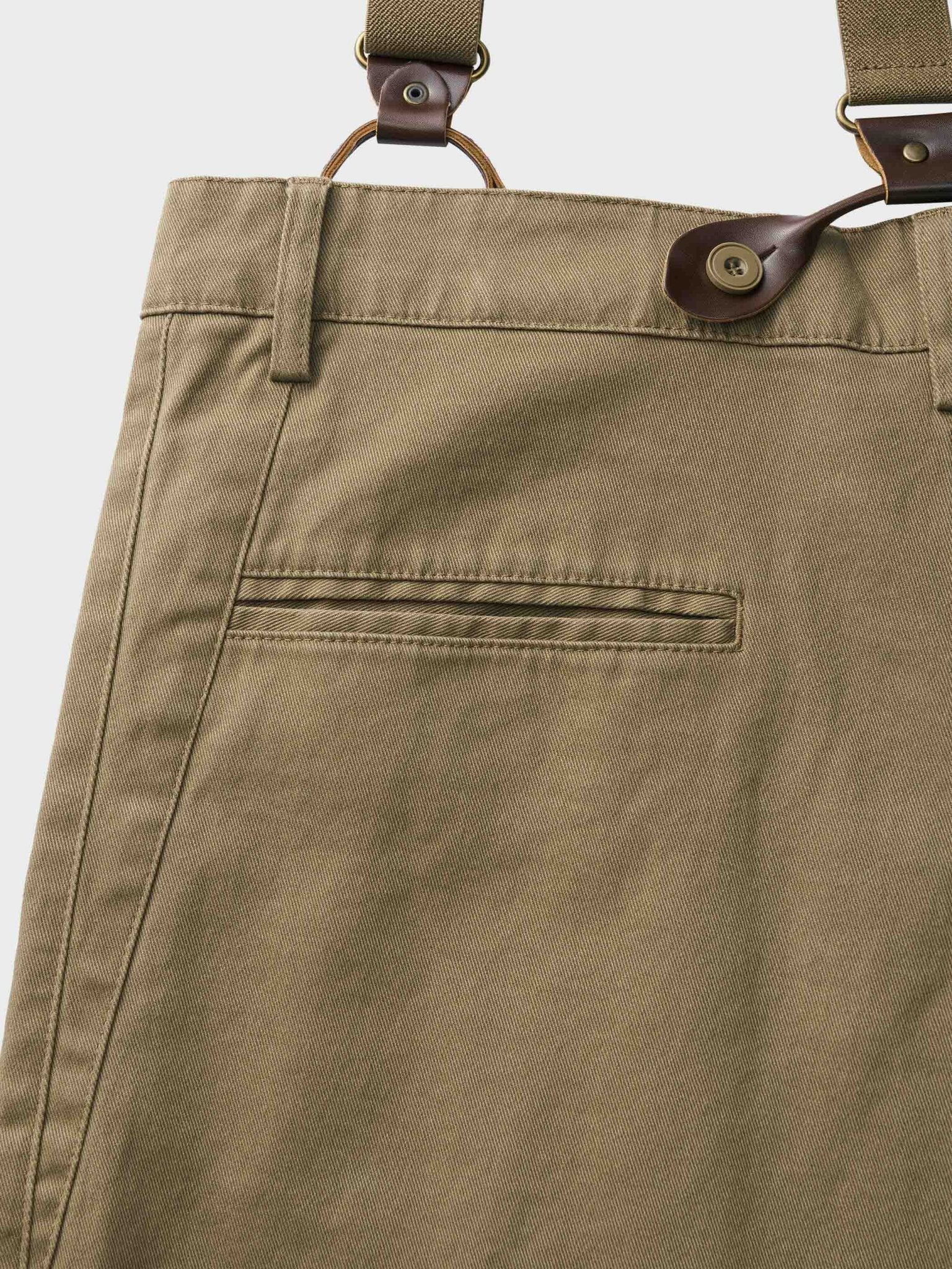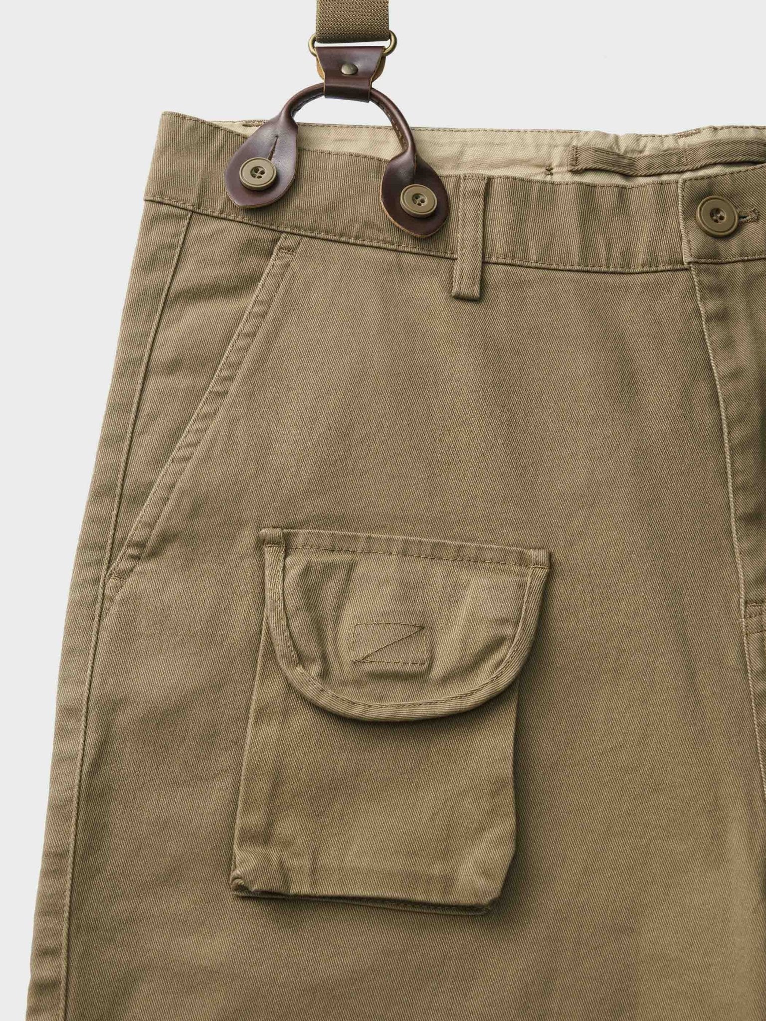 絶妙な幅があるサスペンダーは肩に絞り過ぎず付けられます。フラップポケットは飾り用だけではなく、小物を入れて、落とさないようにマジックテープもついてあり、より実用性が高い。裾まで繊細な縫い方は質感を現れています。
