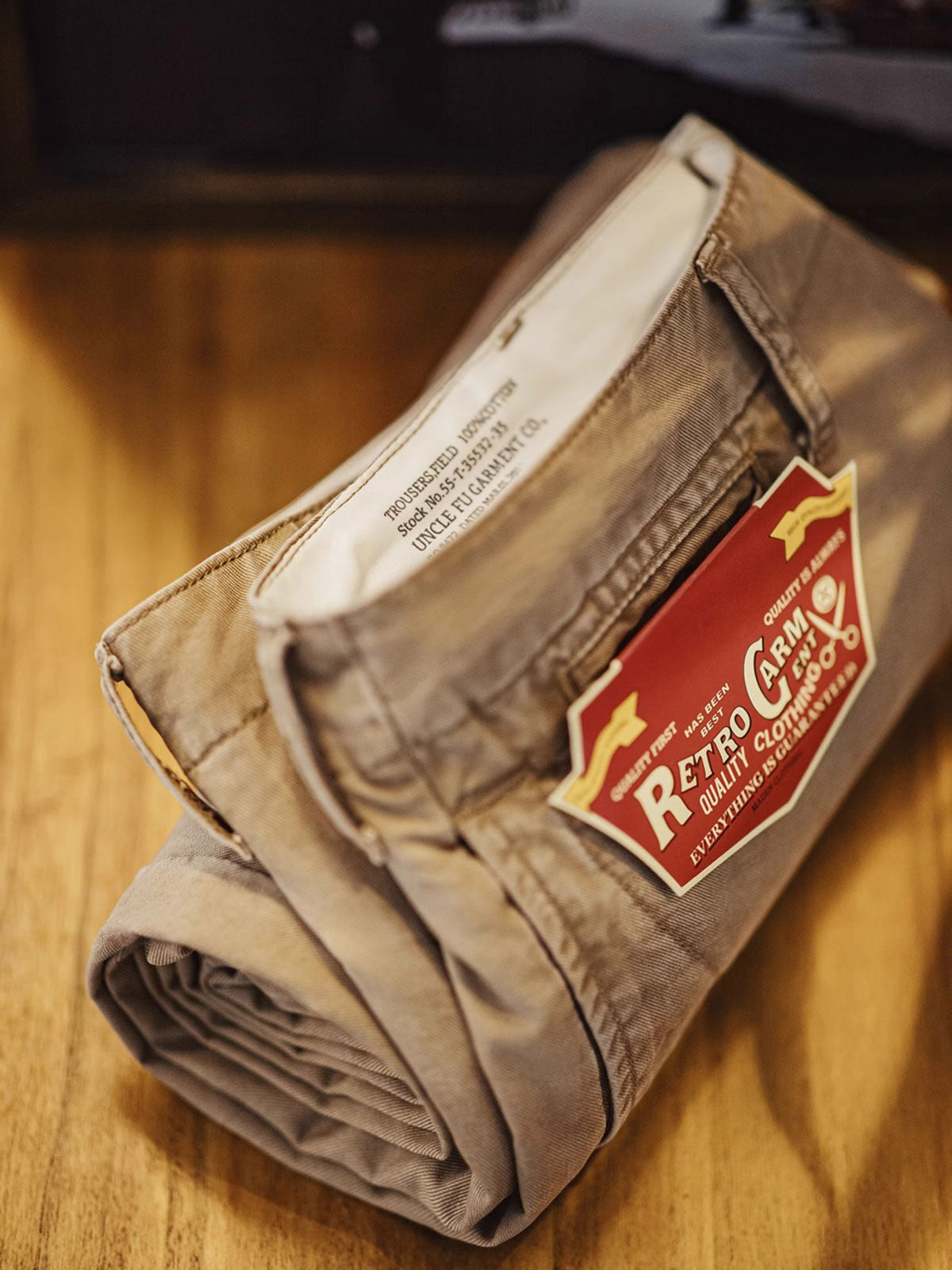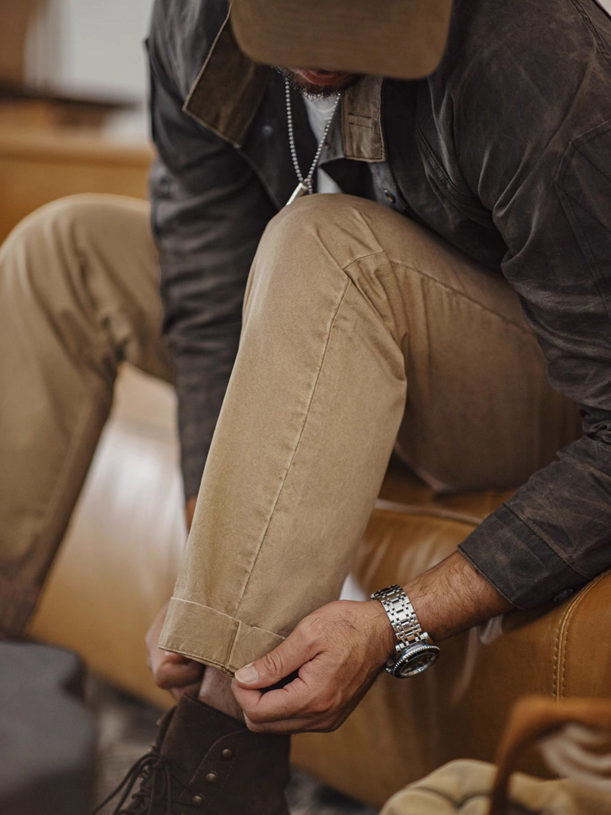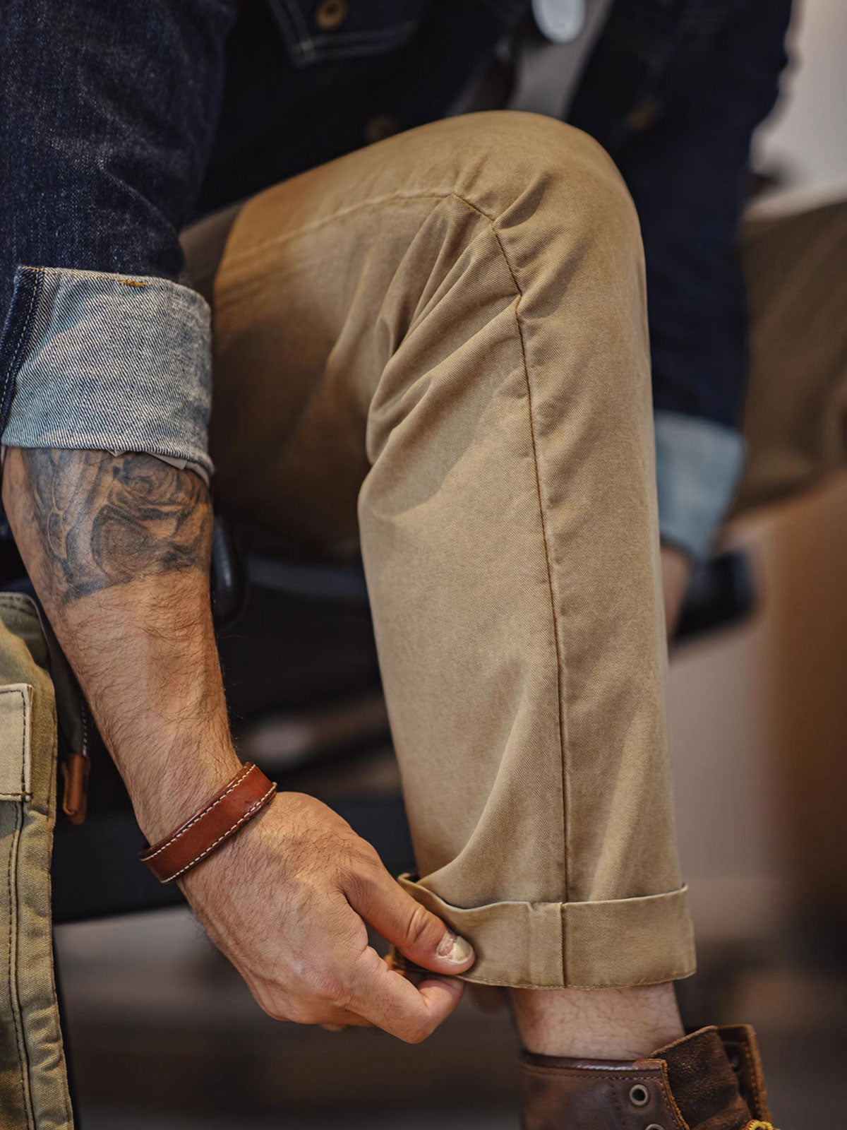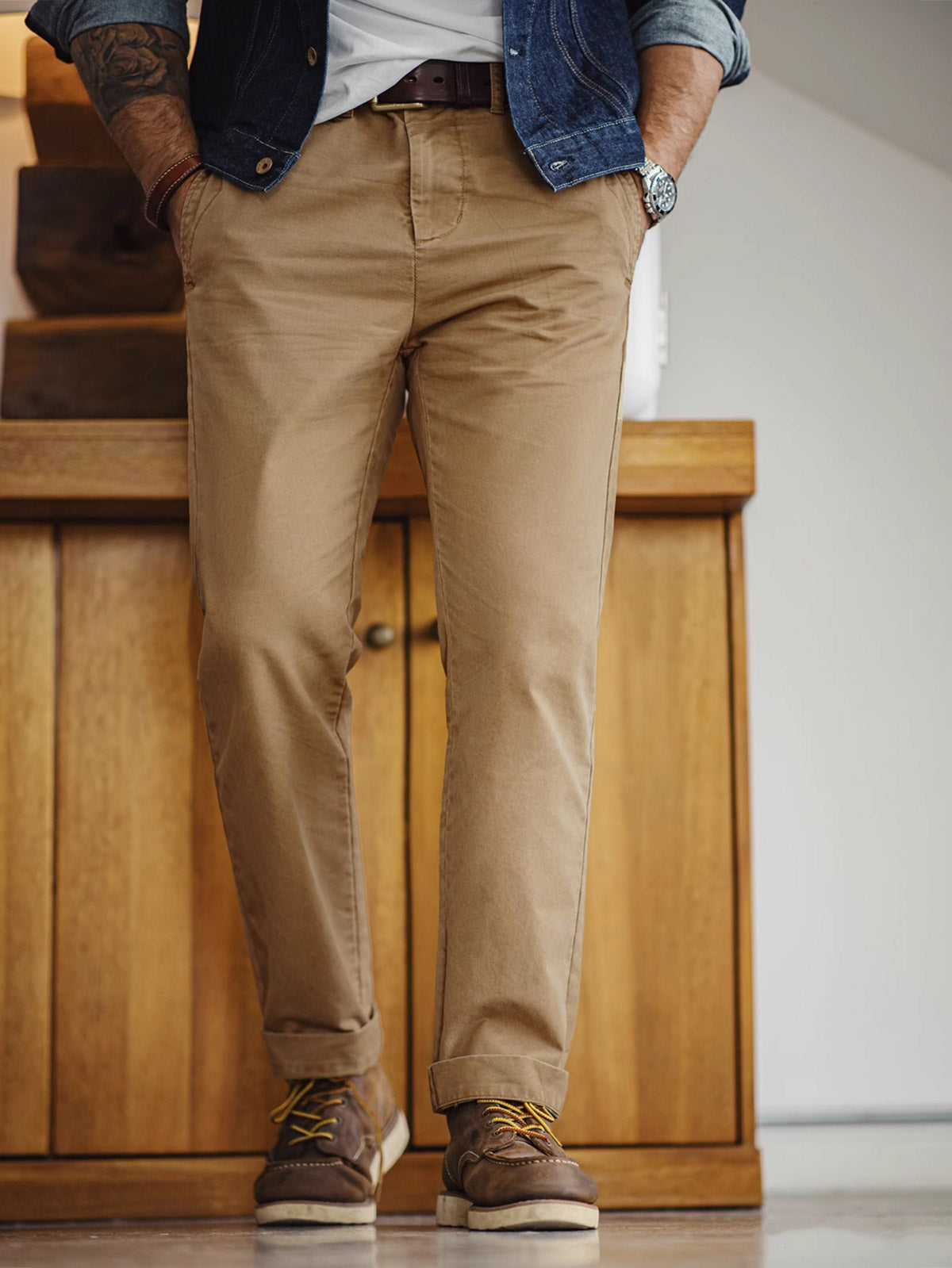 このカーキカジュアルパンツは、ヴィンテージワークウェアスタイルに強く影響を受けており、20世紀の労働者の服装からインスピレーションを得ており、耐久性と実用性を重視しています。
