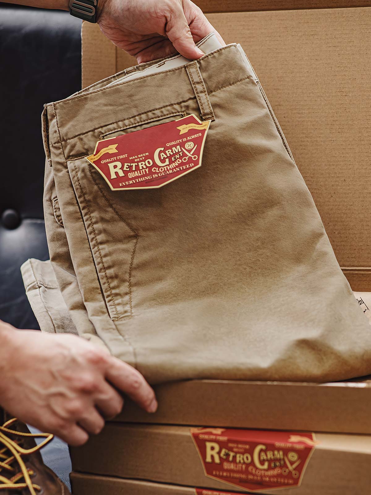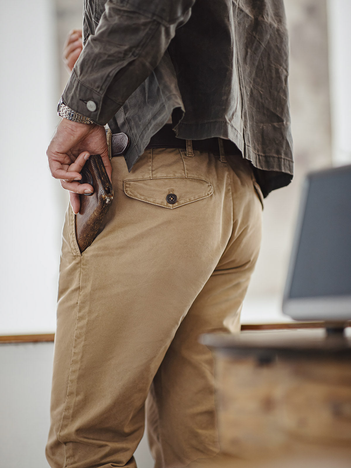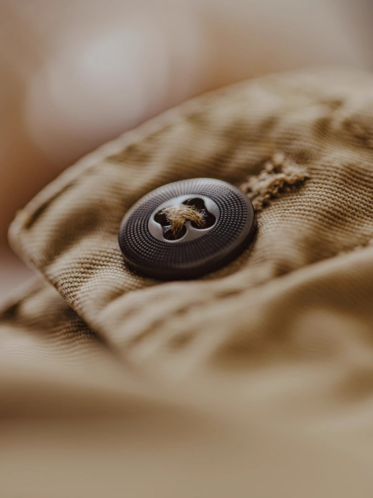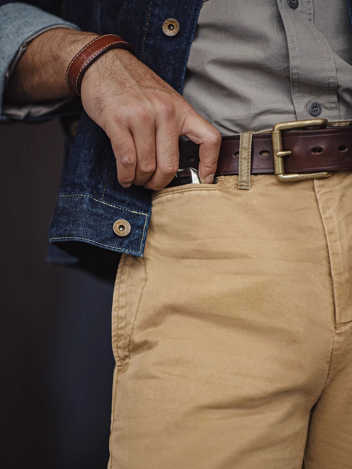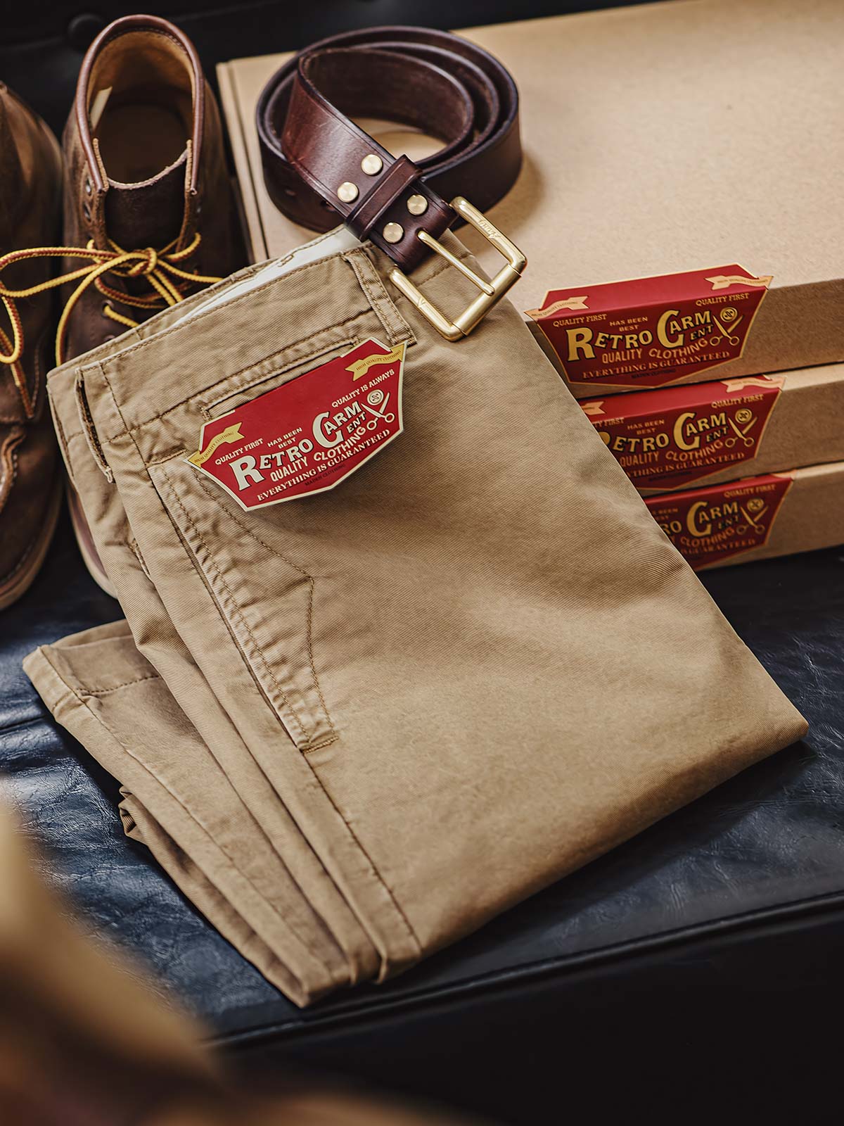 このカーキカジュアルパンツは、ヴィンテージワークウェアスタイルに強く影響を受けており、20世紀の労働者の服装からインスピレーションを得ており、耐久性と実用性を重視しています。