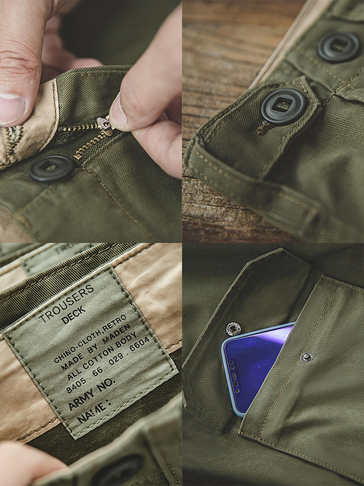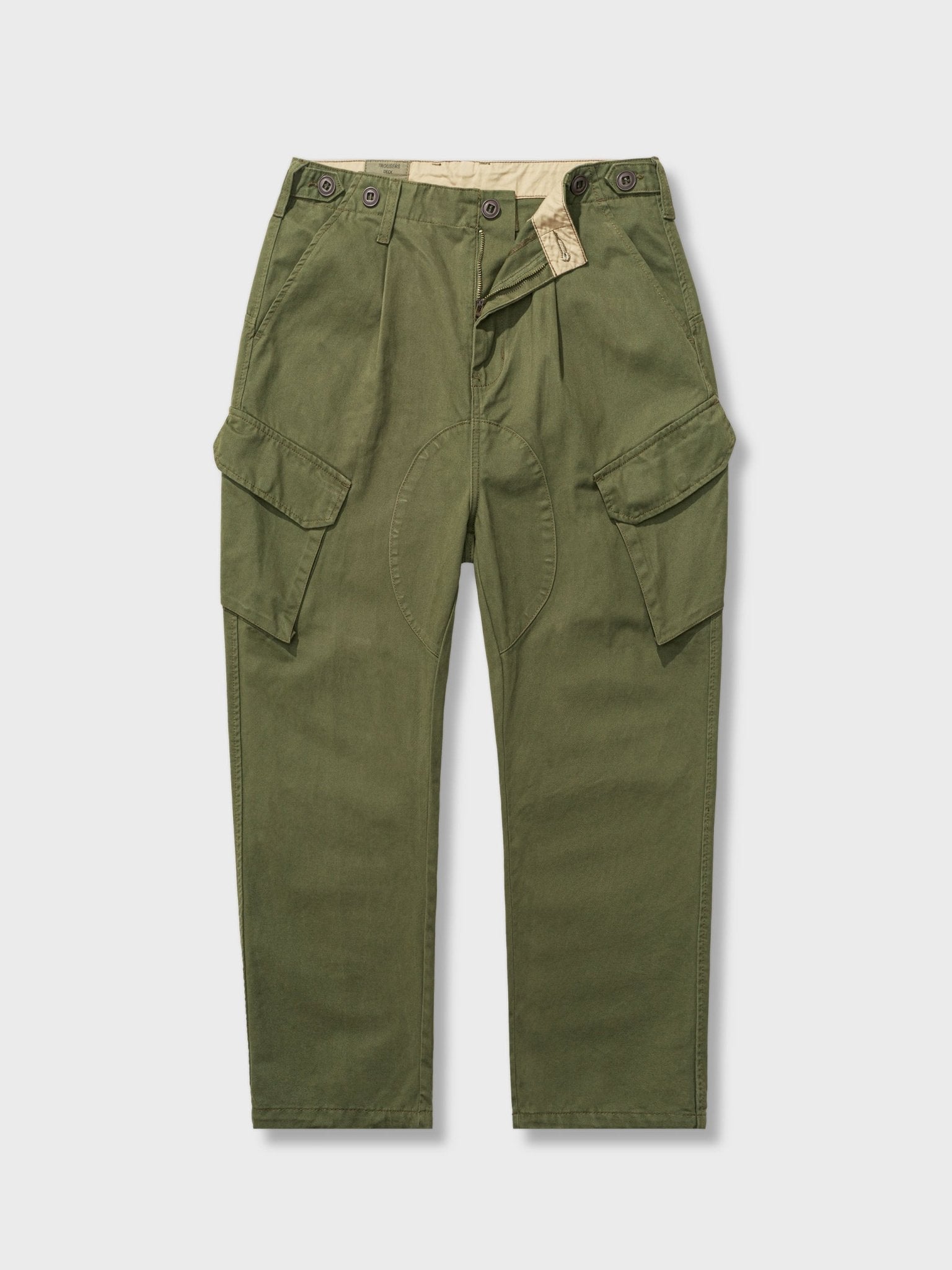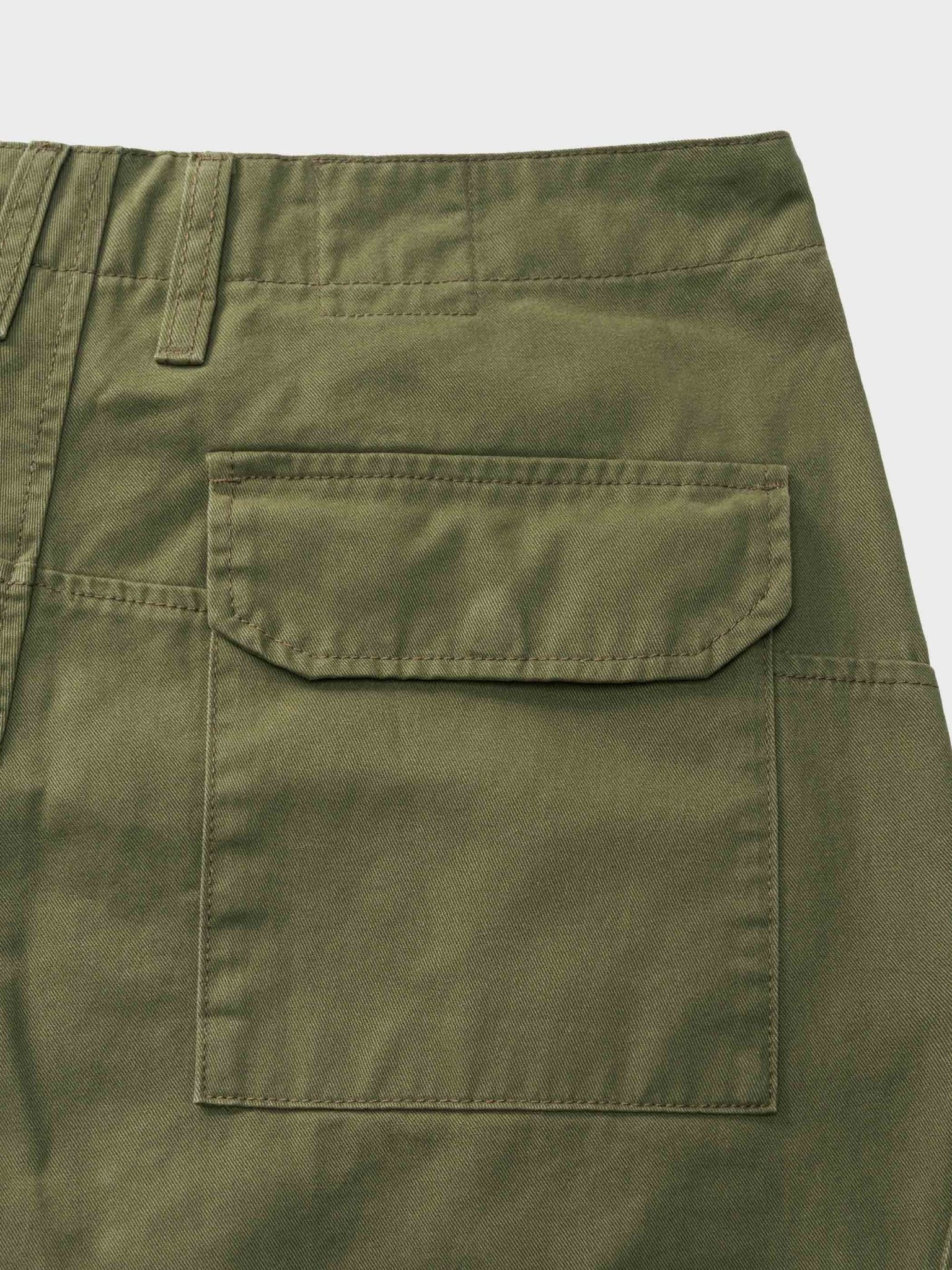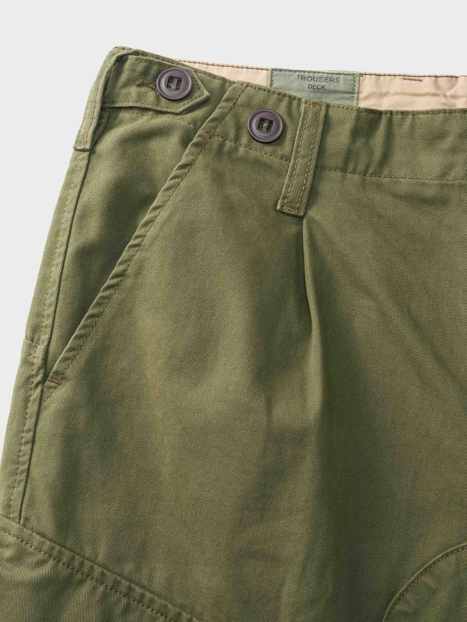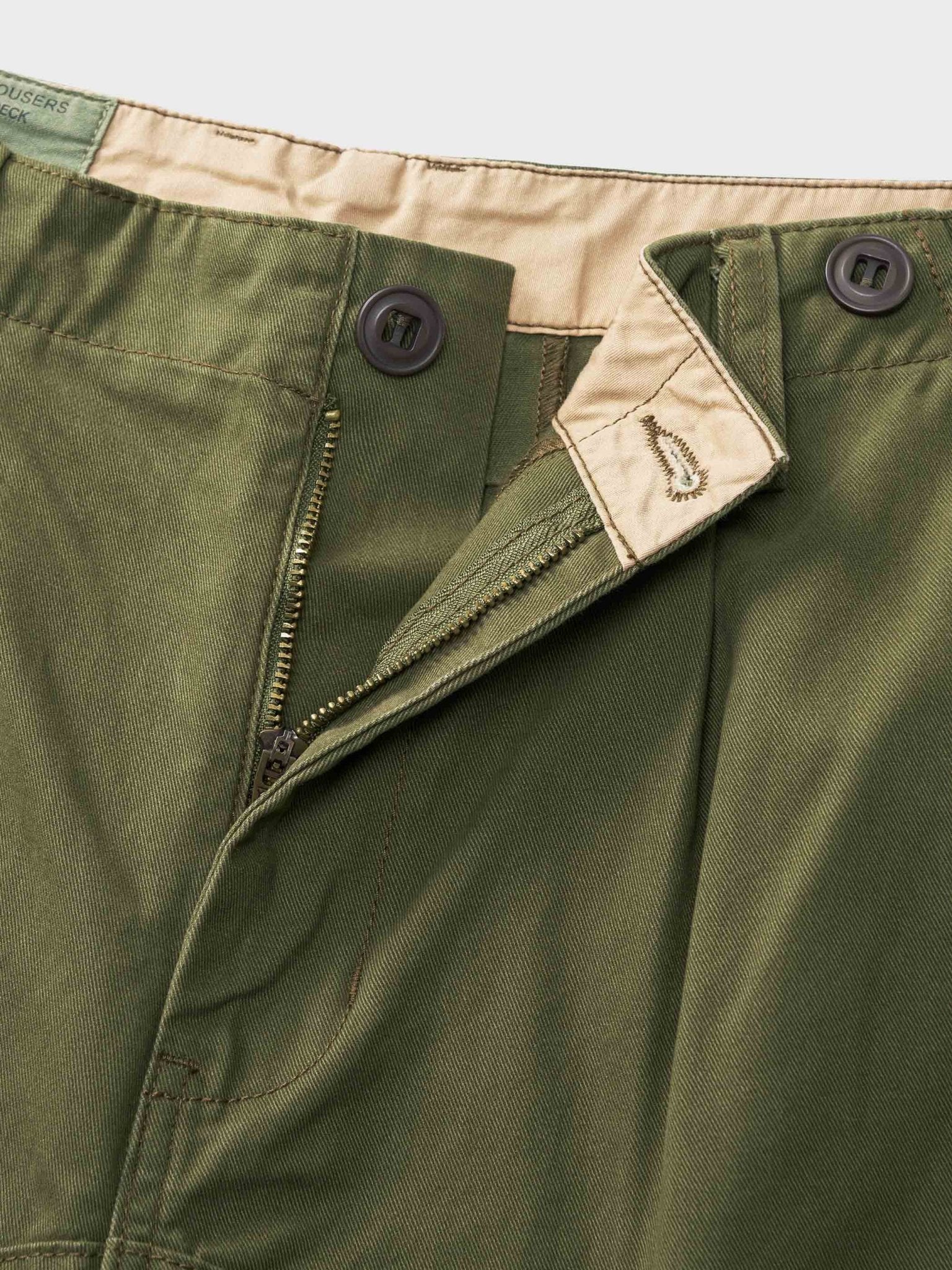 生地はチノクロスを使用しており、45度方向に織り込まれ構成されています。1902年には英国軍の制服に使用されるようになり、しっかりとした手触りが特徴です。