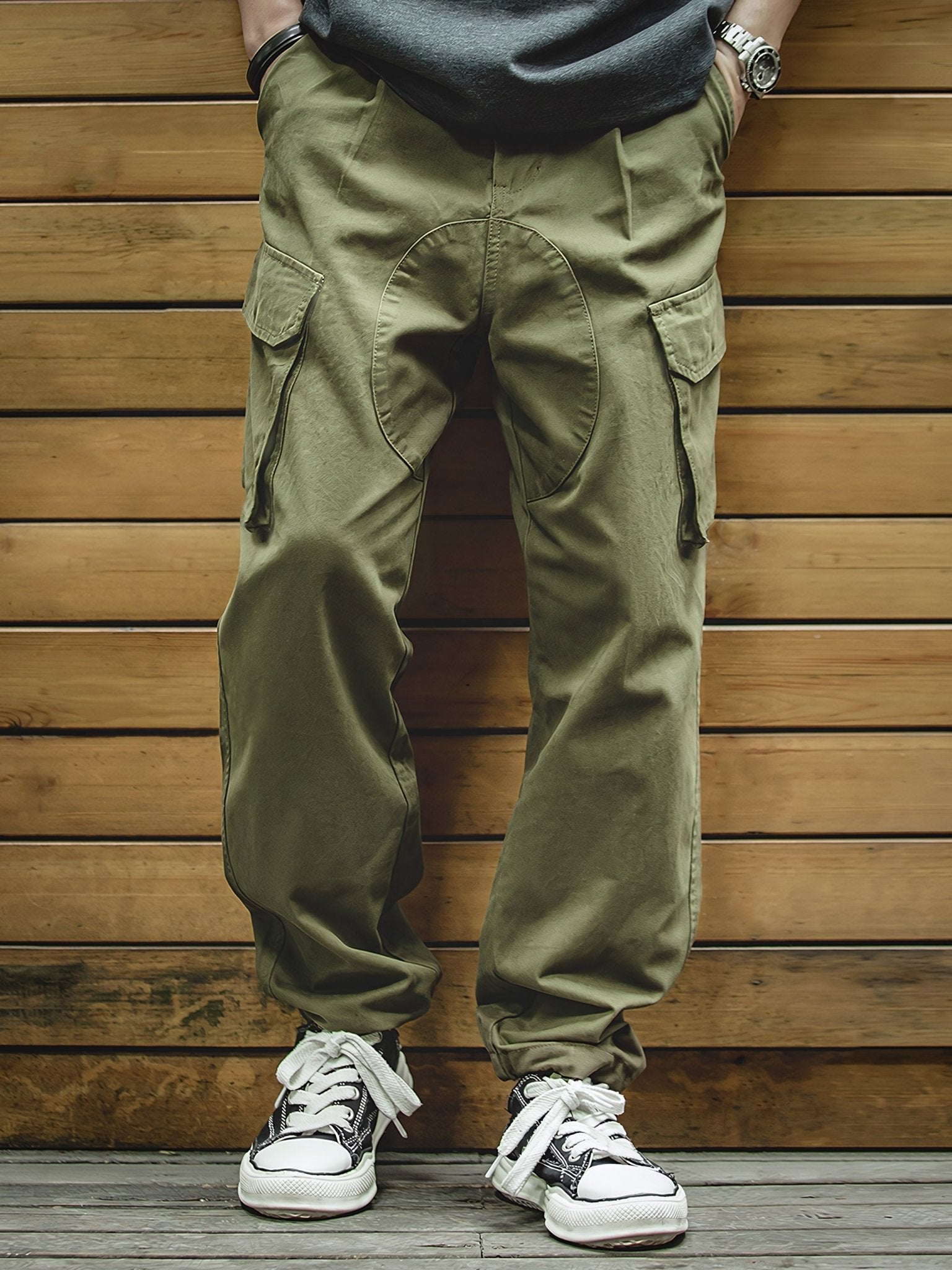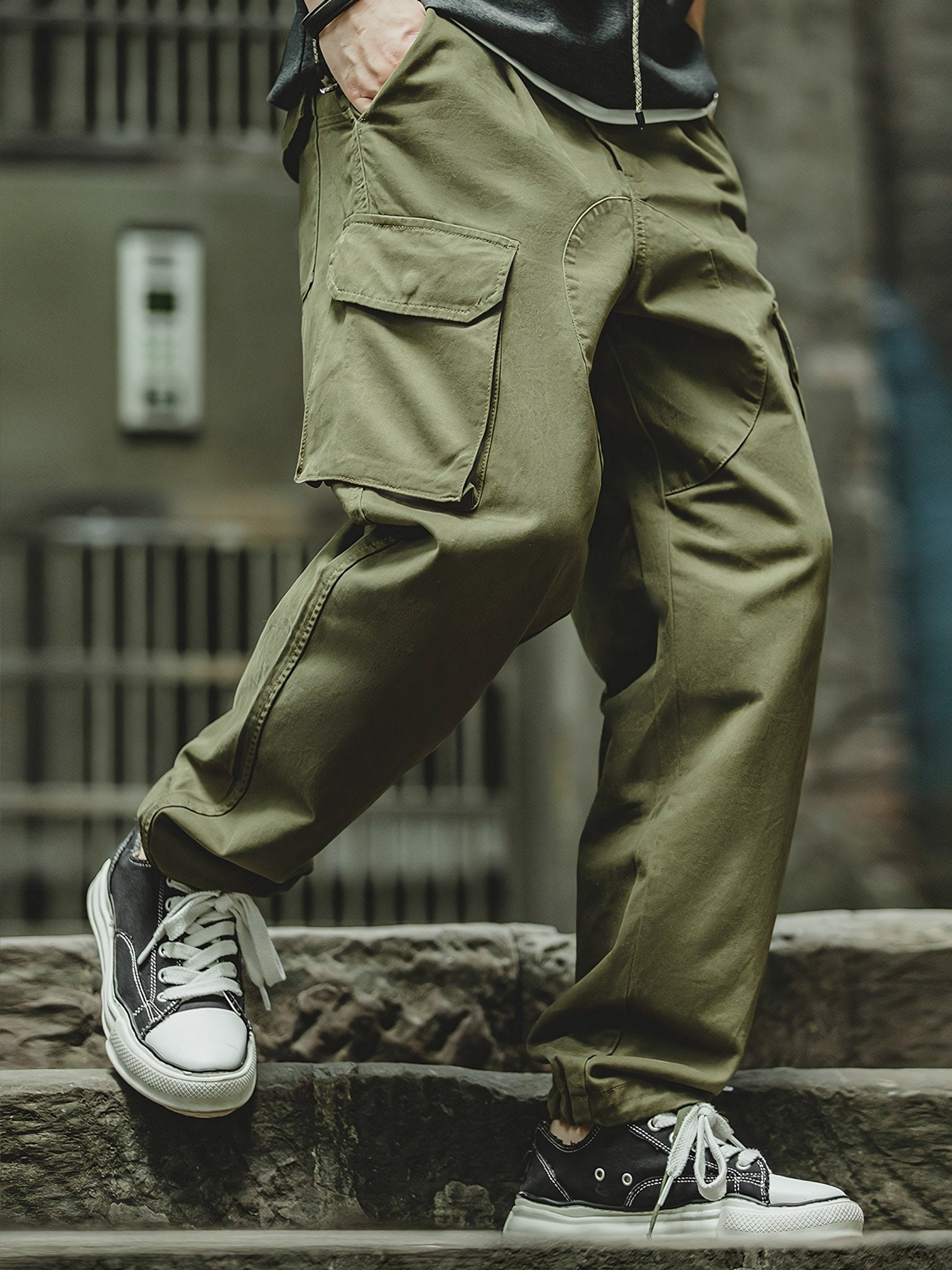このパンツは丈夫で耐久性のある素材を使用しています。適度なゆとりがあり、すっきりとしたテーパードの足元が特徴です。裾にはドローコードが付いており、サイドポケットにはスマートフォンや財布などが収納可能です。