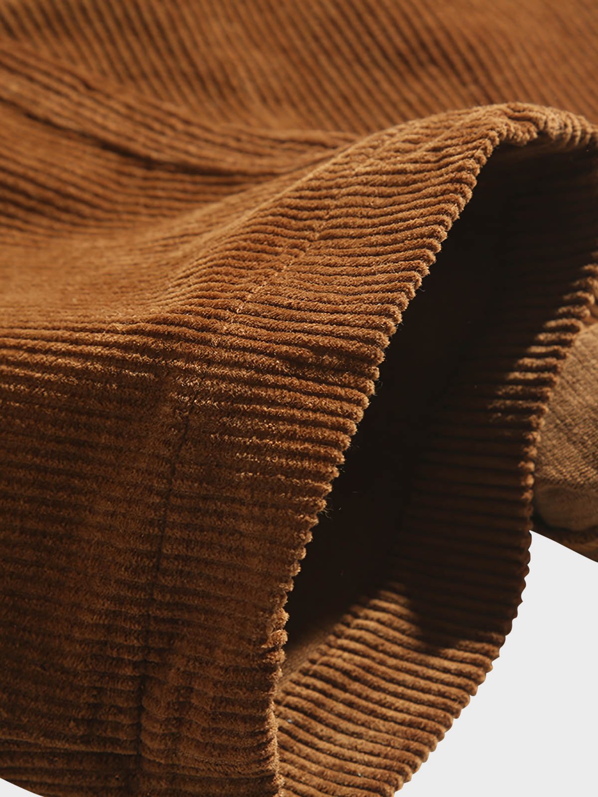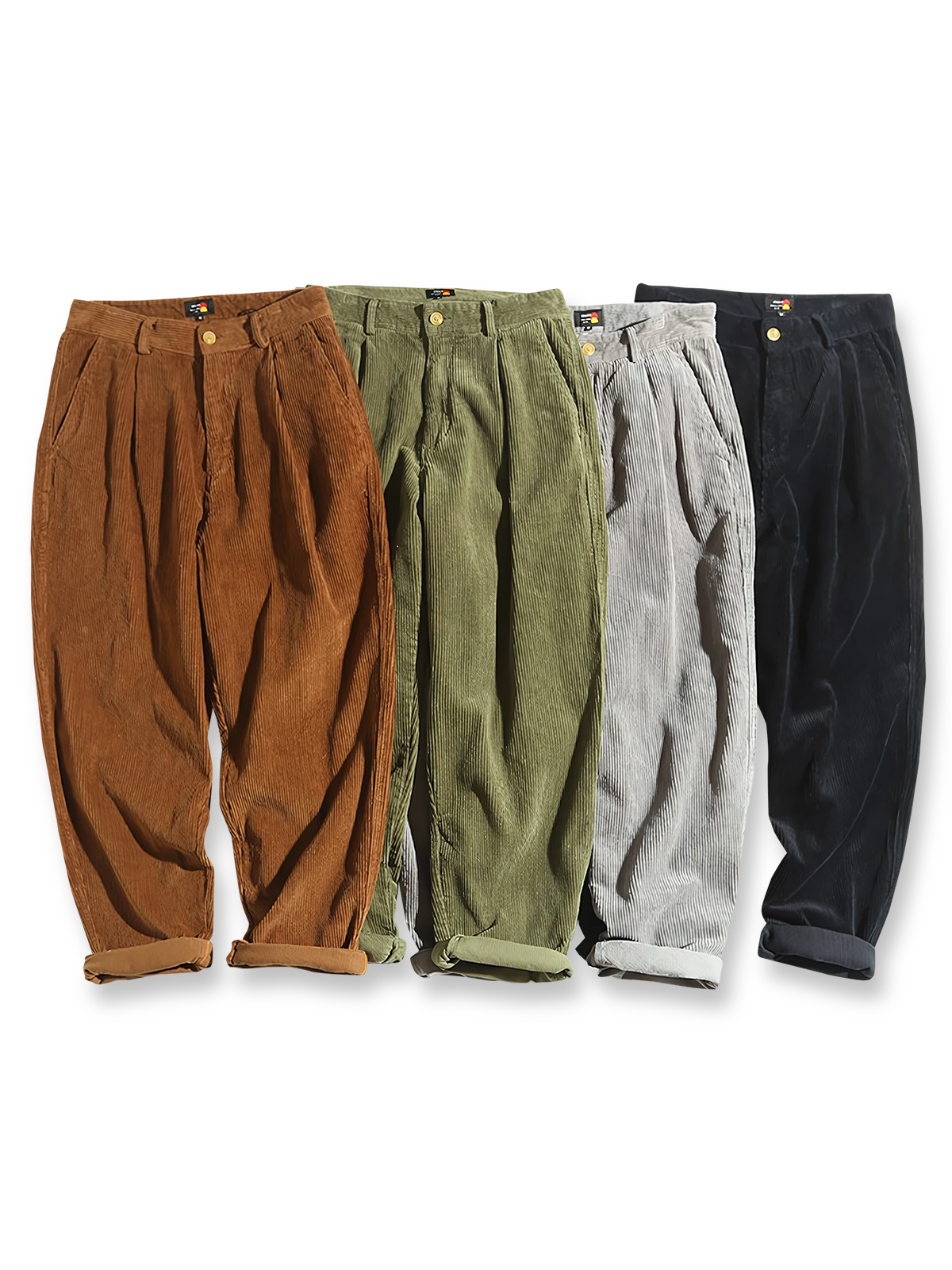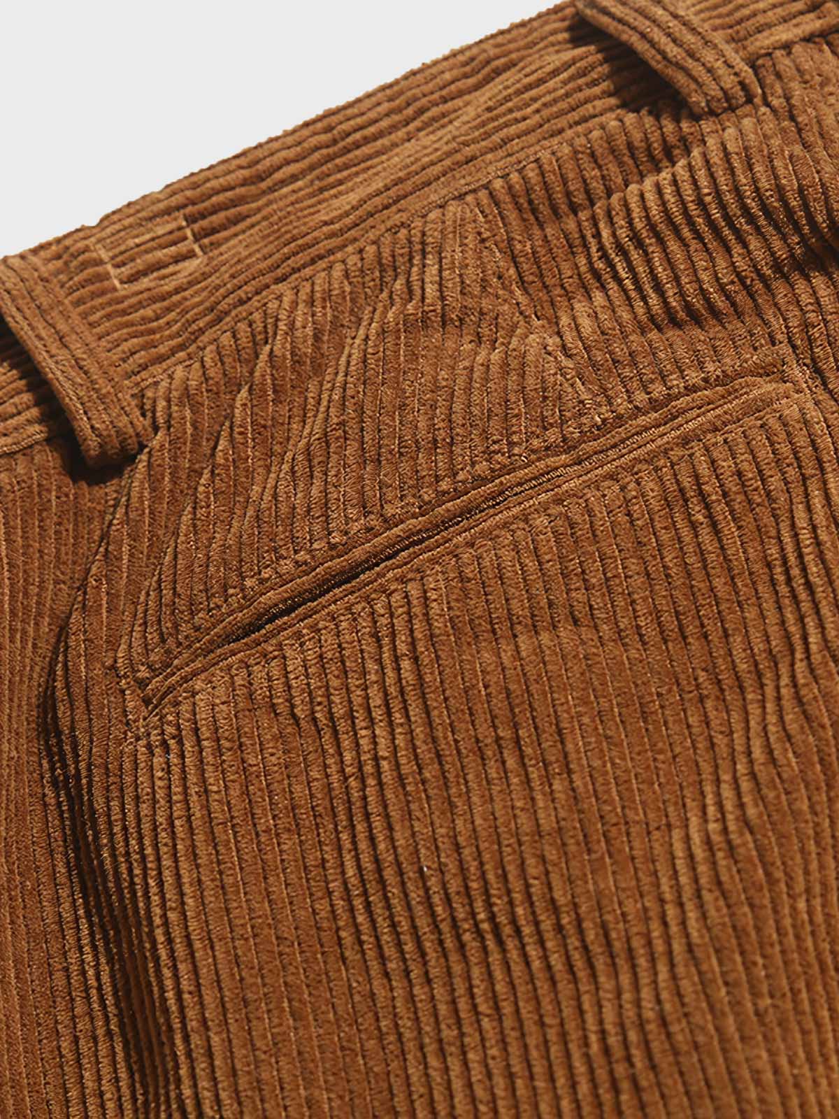これらのコーデュロイパンツは、ストレートカジュアルスタイルで、レトロなスタイルと現代ファッションの組み合わせを反映しています。コーデュロイは、その独特な織りと暖かい質感で20世紀のカジュアルウェアやプレッピースタイルによく使われる古典的な素材です。