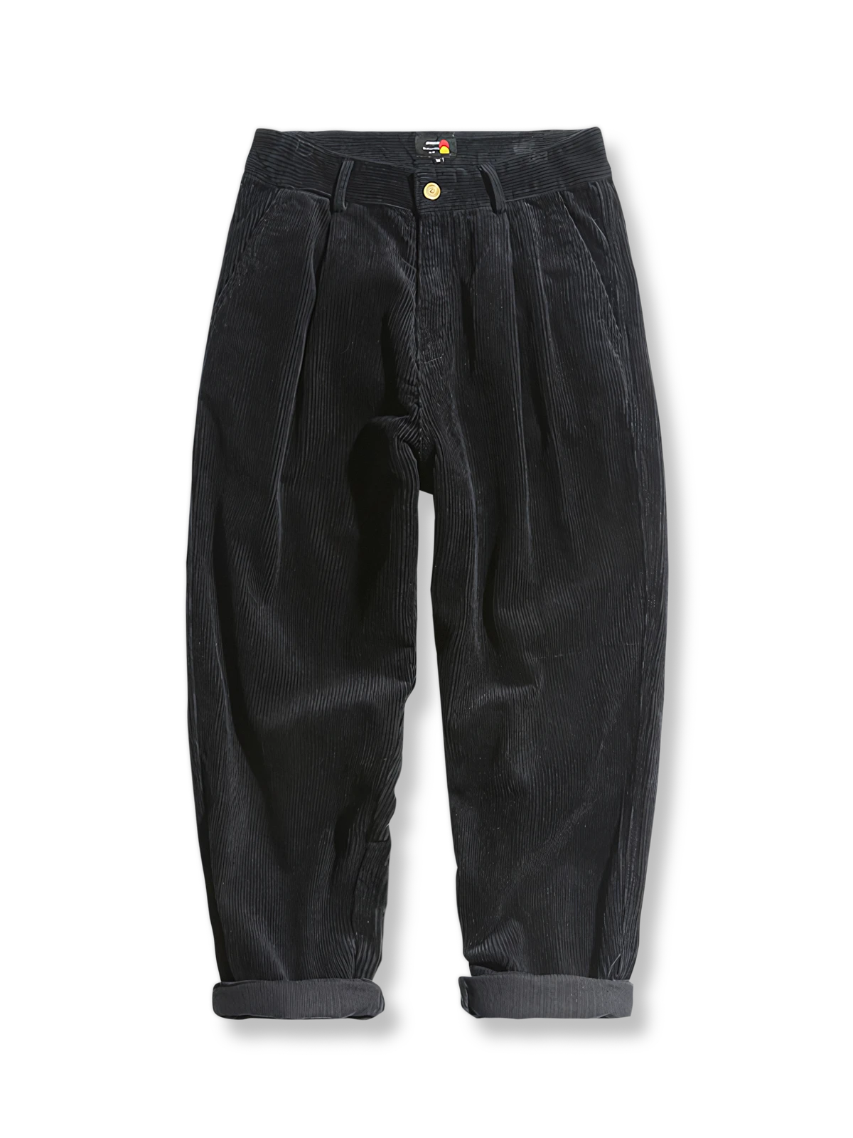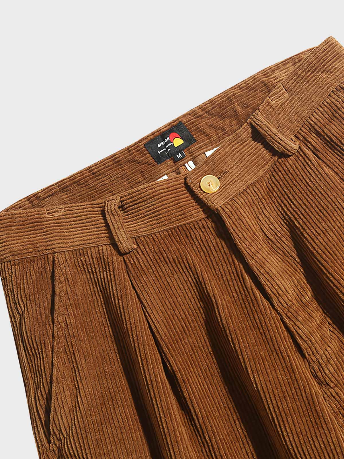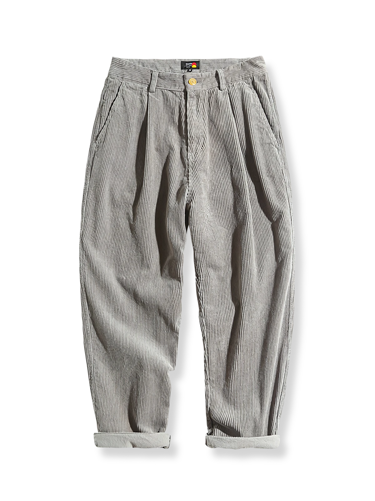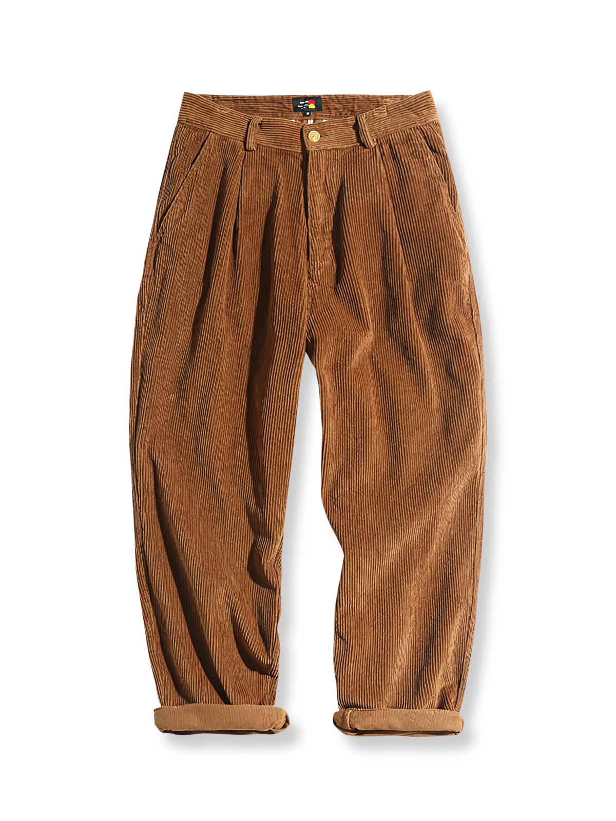 これらのコーデュロイパンツは、ストレートカジュアルスタイルで、レトロなスタイルと現代ファッションの組み合わせを反映しています。コーデュロイは、その独特な織りと暖かい質感で20世紀のカジュアルウェアやプレッピースタイルによく使われる古典的な素材です。