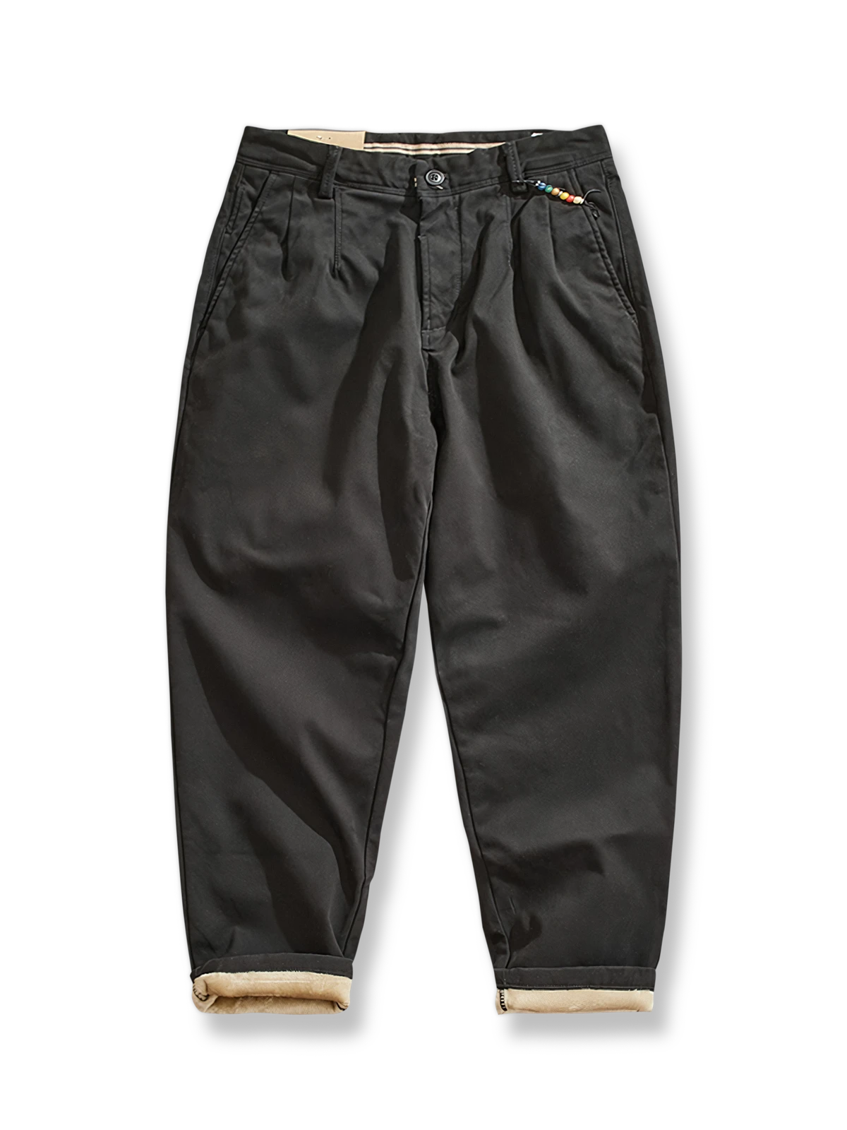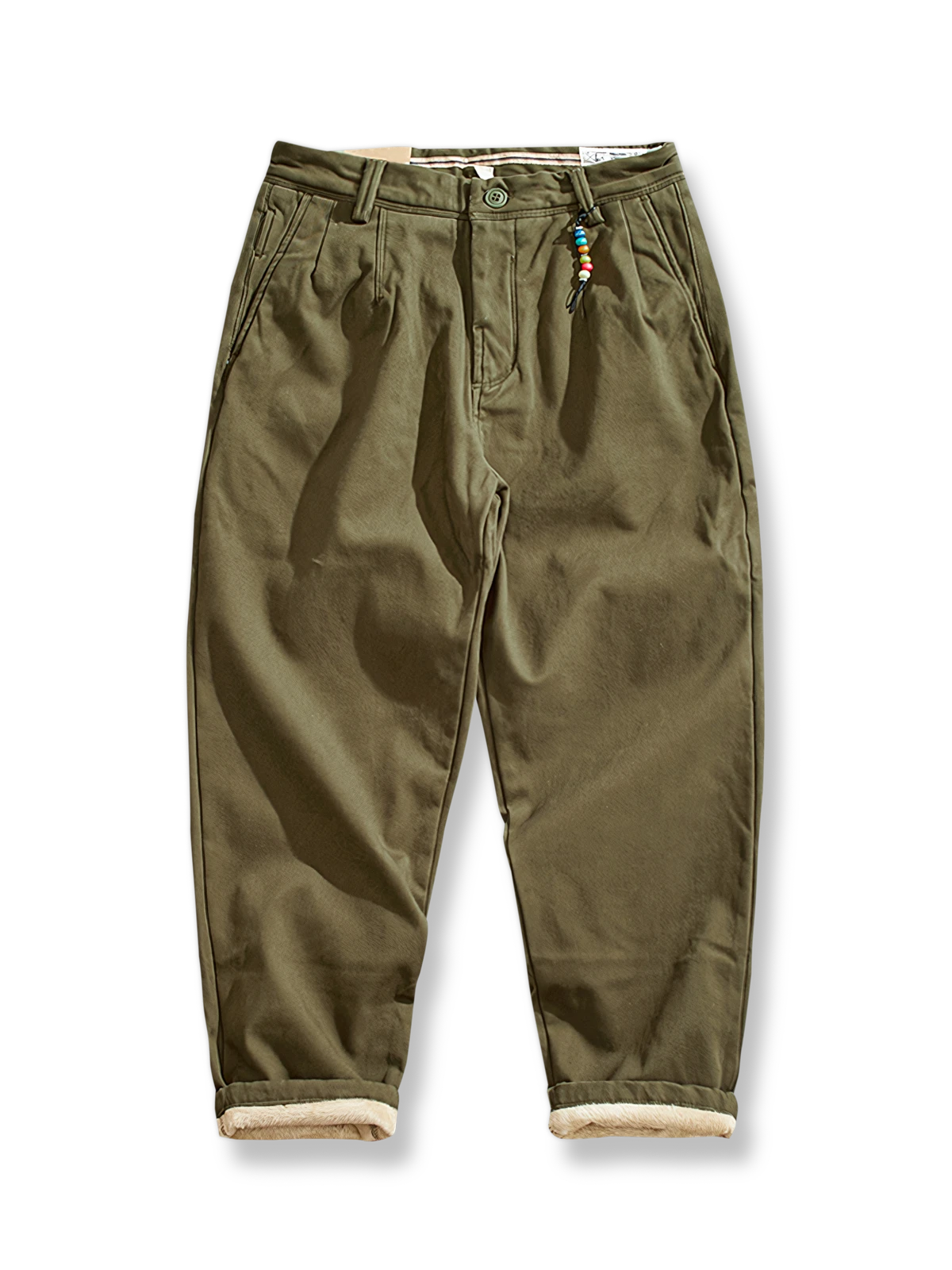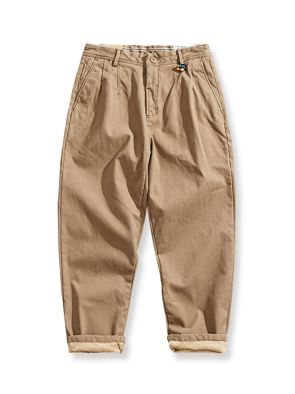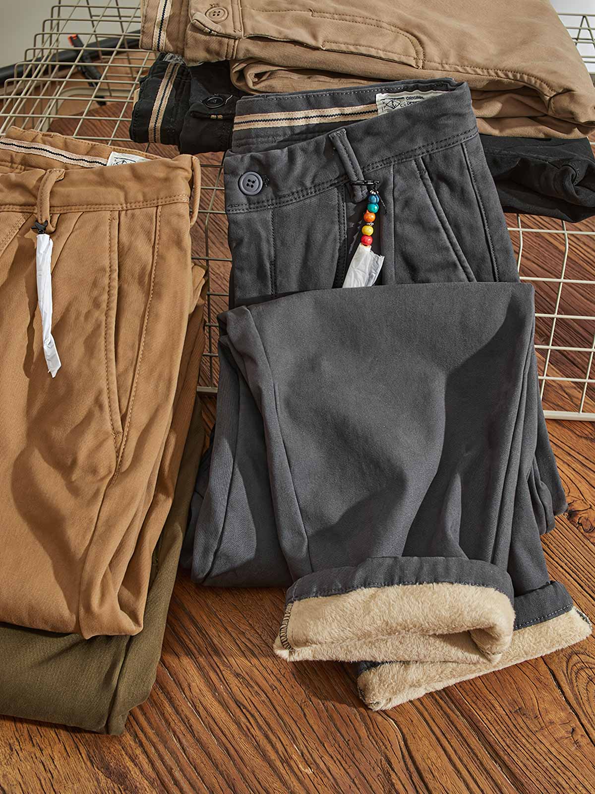 このパンツはリラックスフィットのストレートテーパードデザインで、スリムに見えるが十分な動きの自由を提供します。裏地のフリース加工と厚手の生地は、冬の暖かさを保ち、低温天候に適しています。
