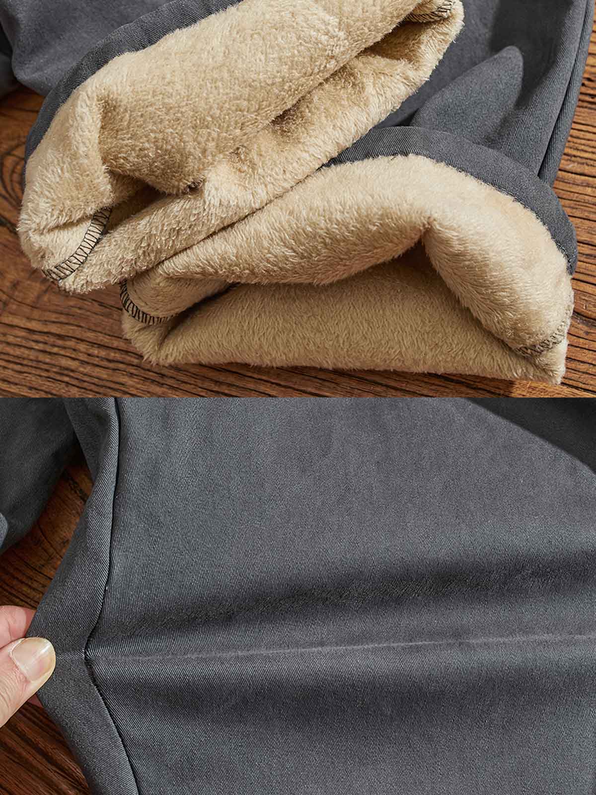 弾性コットンの生地は暖かさと伸縮性を提供し、より快適な着用感を実現します。裏地のフリース加工と厚手の処理は、冷たい冬に最適で、リラックスフィットはインナーとのレイヤードを容易にします。