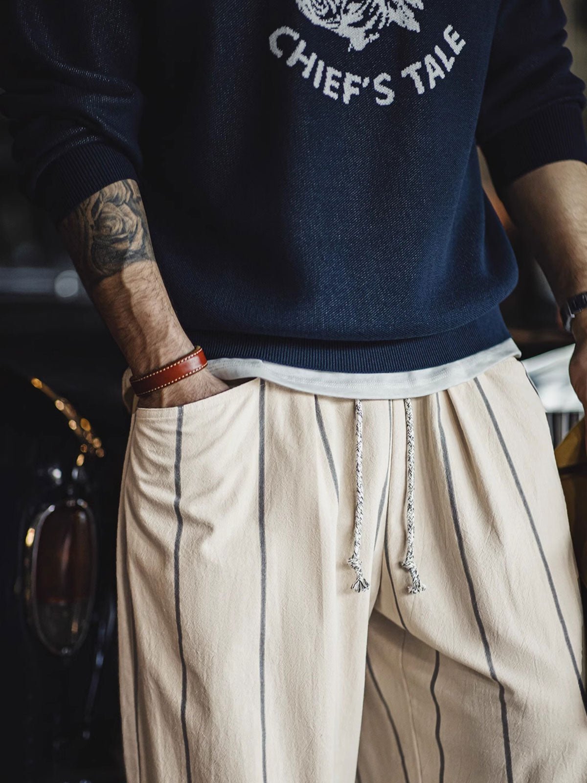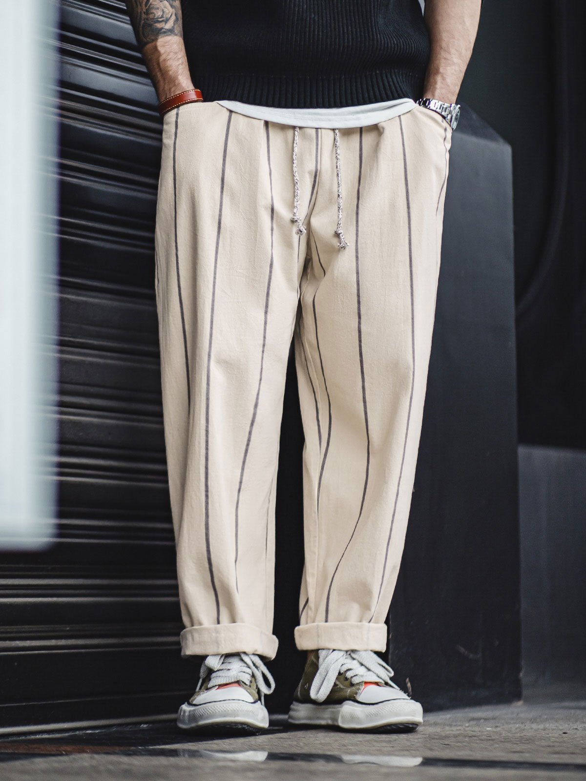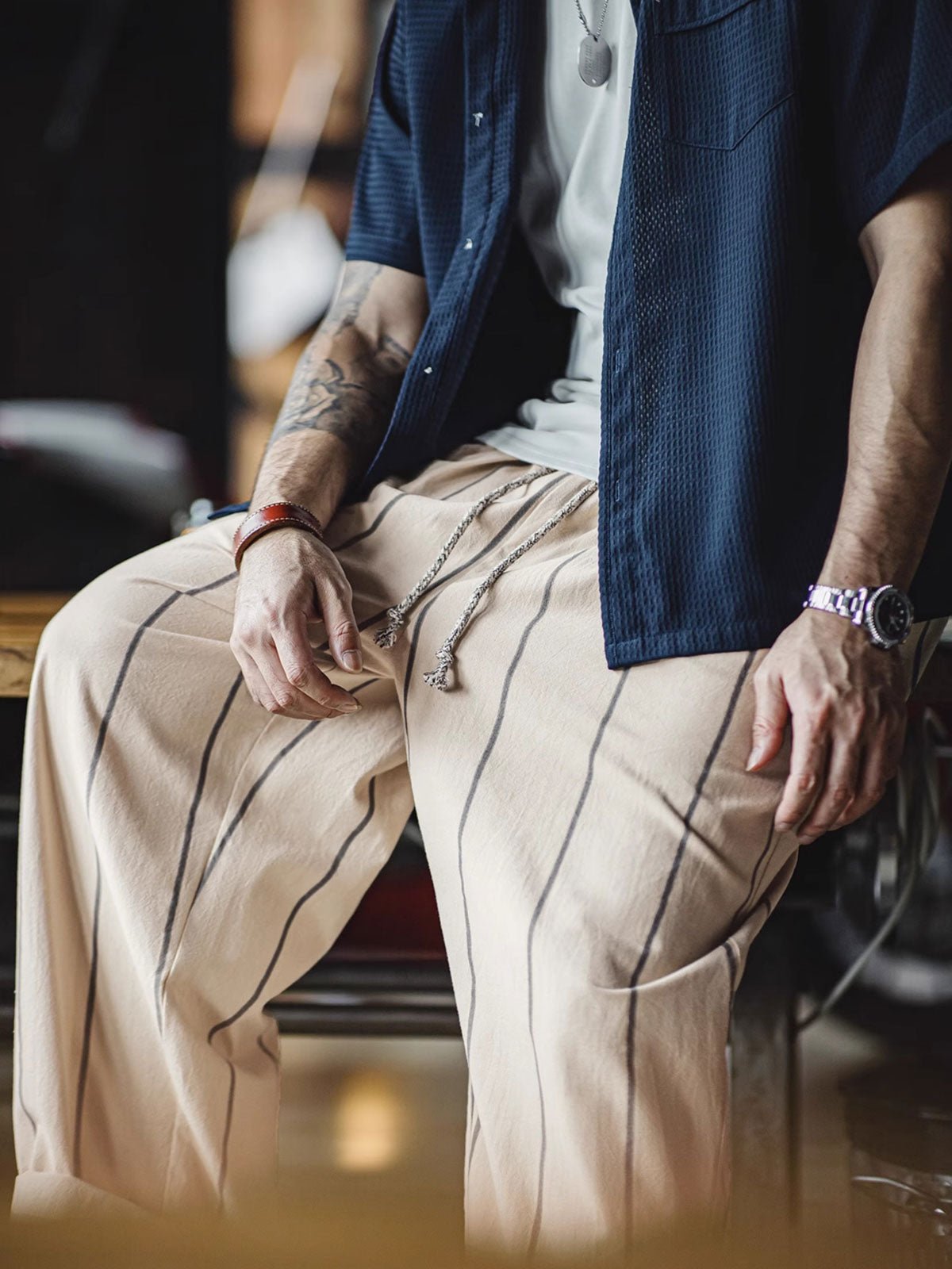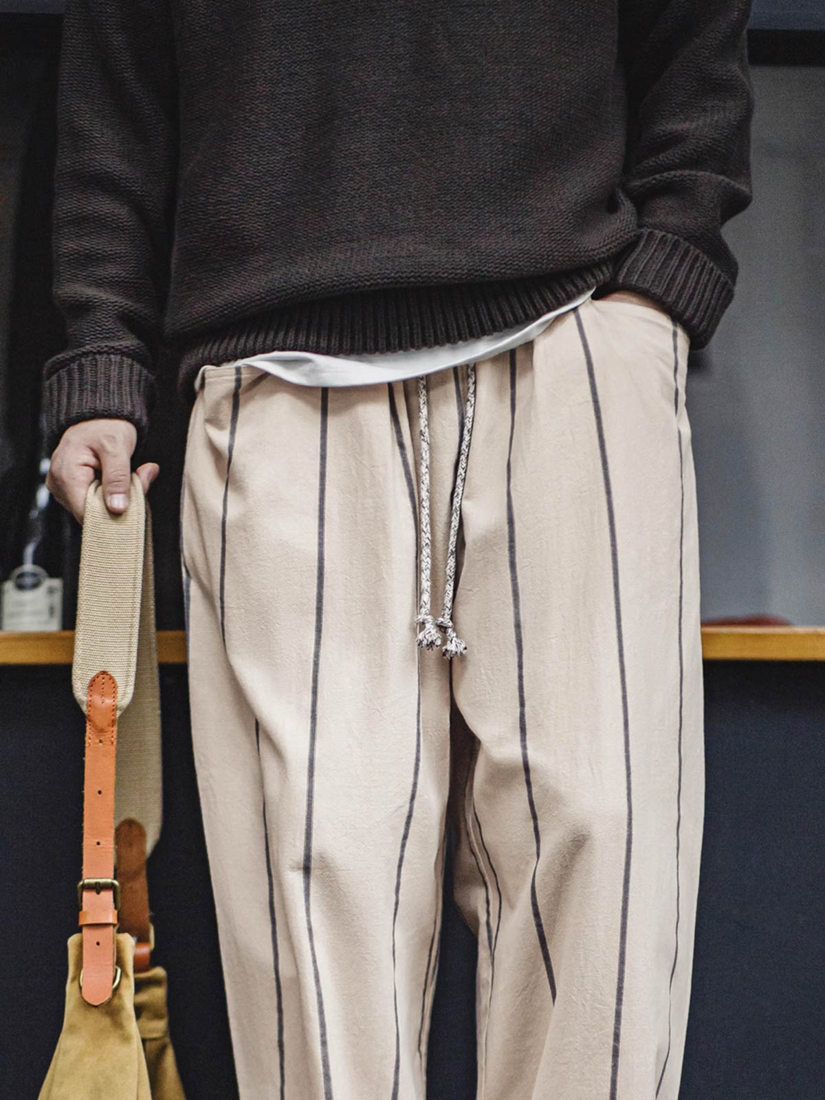 縦ストライプデザイン、ゆったりと快適、クラシックなリラックススタイル。
