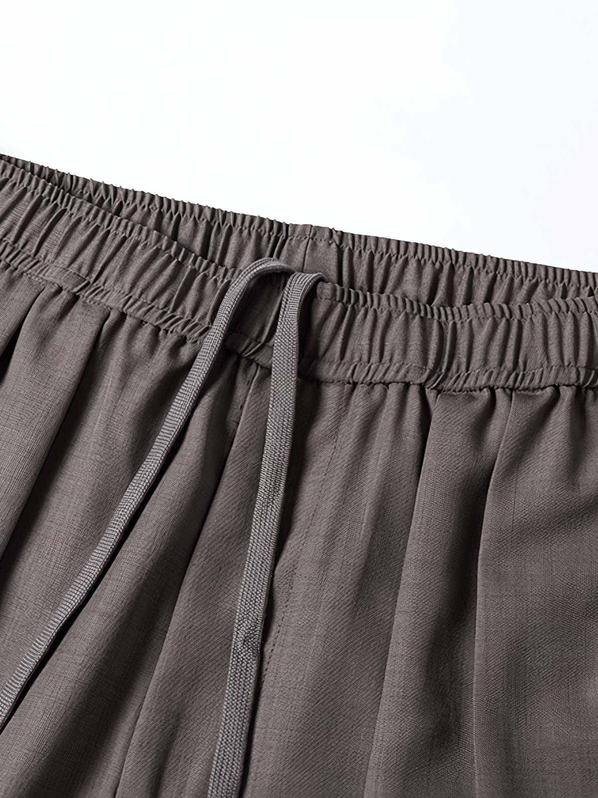 このパンツは、高品質な100%ポリエステル素材で作られており、布地が緻密で快適な肌触りです。冷感のある質感は、綿麻混紡のような手触りを実現しています。生地表面の経緯が交差することで、質感と耐久性が向上しています。ウエスト部分はゴムとドローストリングのデザインで、サイズ調整が簡単で、さまざまなウエストサイズの方に適しています。水洗とスチーム高温定型の二重収縮加工が施されており、パンツが型崩れしにくく、しっかりとしたシルエットを保ちます。ゆったりとしたデザインは、快適な着心地とコーディネートのしやすさを提供し、さまざまなカジュアルシーンに適しています。グレー、ブルー、ブラックの3つのクラシックなカラーがあり、異なるスタイリングニーズに応えます。