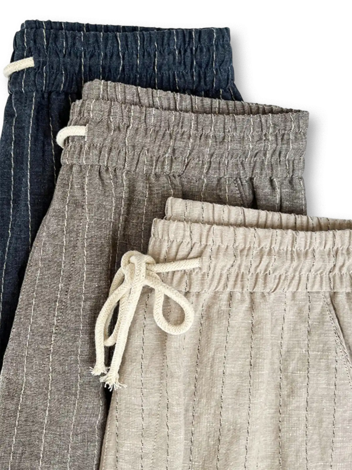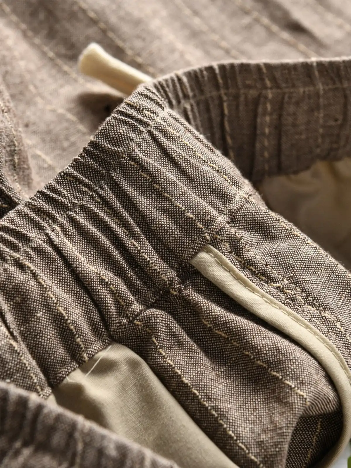 このクロップドパンツは、55%のリネンと45%のコットンを混紡した素材を使用しており、通気性が良く、夏でも快適な着心地を提供します。さらに、優れた抗シワ性を持ち、シワになりにくいのも特徴です。ヴィンテージストライプデザインがクラシックな要素を加え、ウエスト部分はゴム仕様で、ドローコードによる調節が可能で、さまざまな体型にフィットします。クロップド丈のデザインは、視覚的に脚を長く見せる効果があり、暑い季節でも涼しく過ごせます。実用性とヴィンテージスタイルを兼ね備えた、必携の一着です。