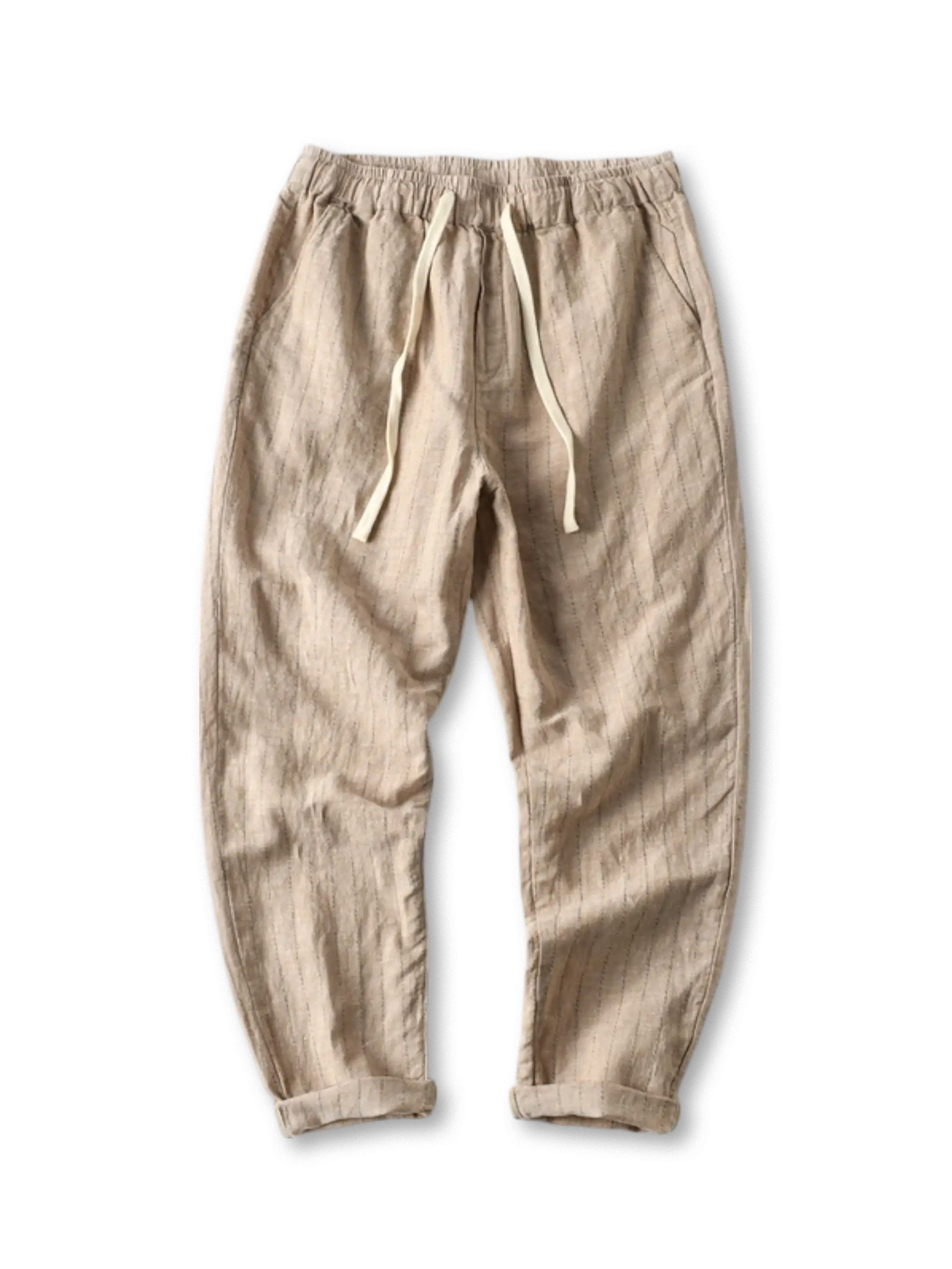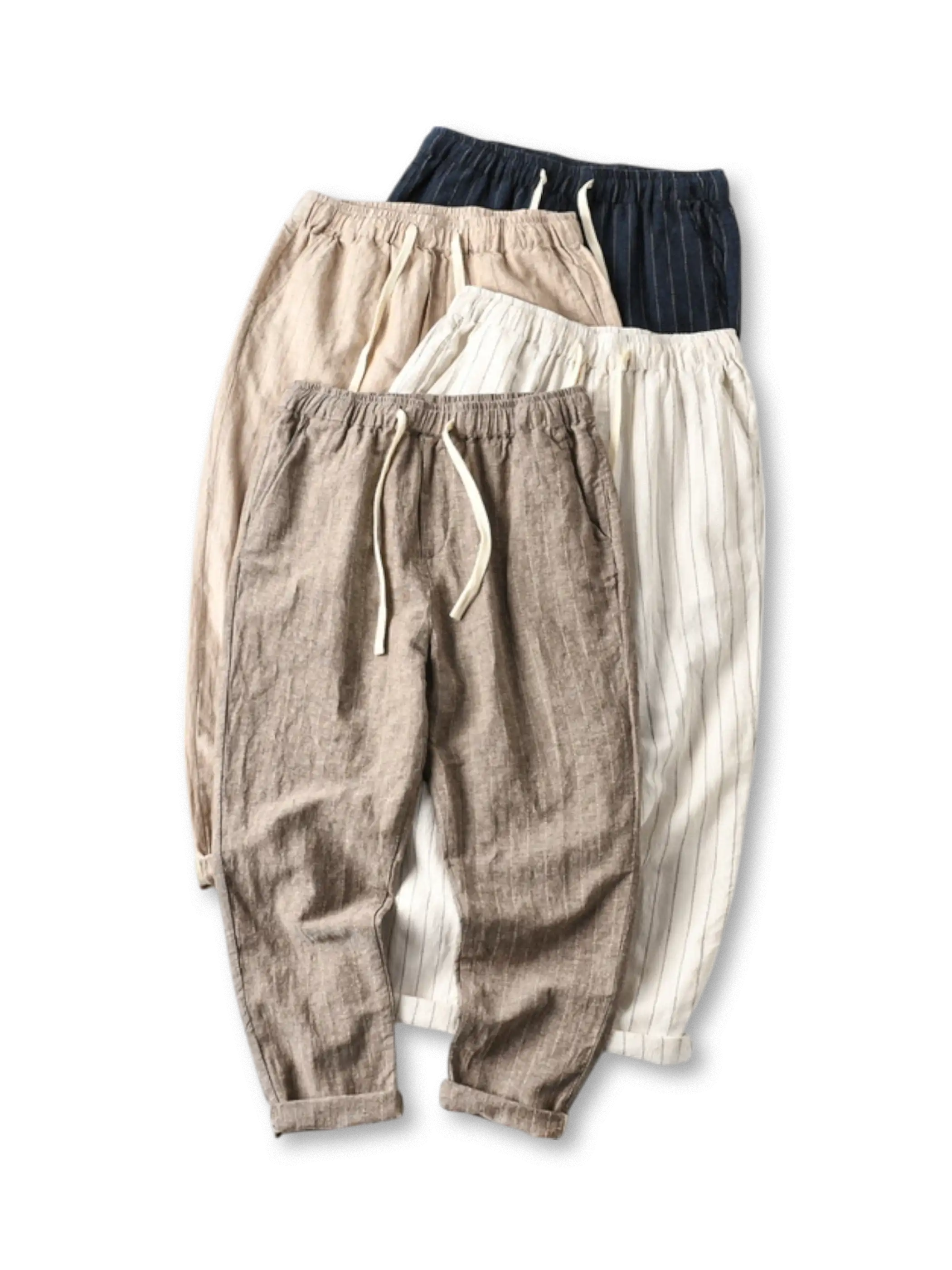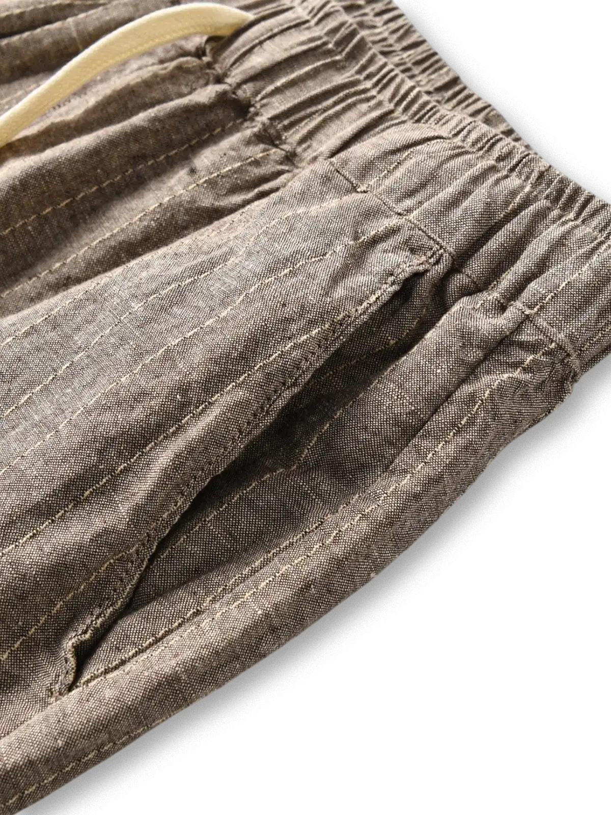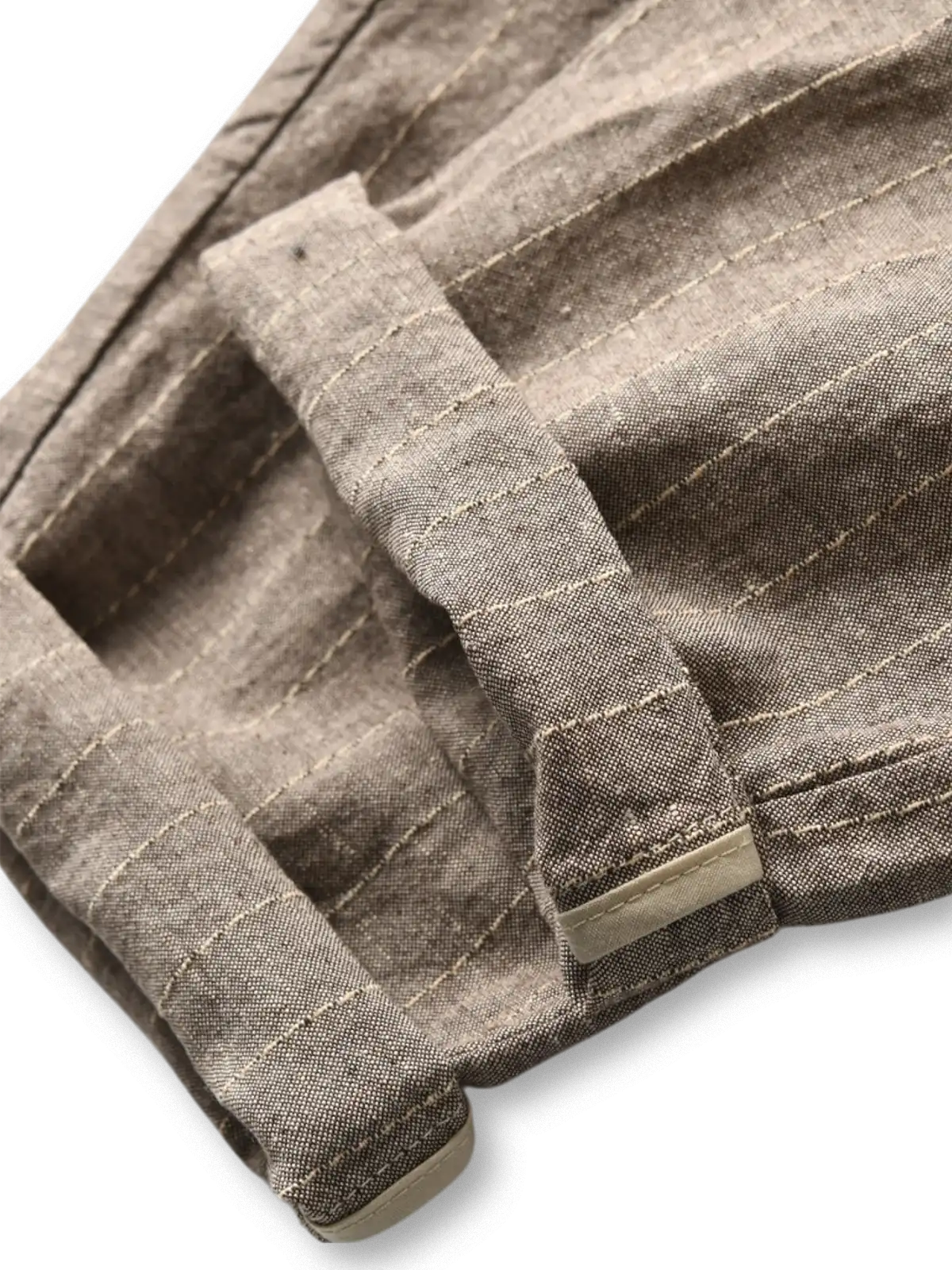 リネンコットン混紡素材を使用したメンズクロップドパンツで、抗シワ性と通気性に優れ、夏に快適。