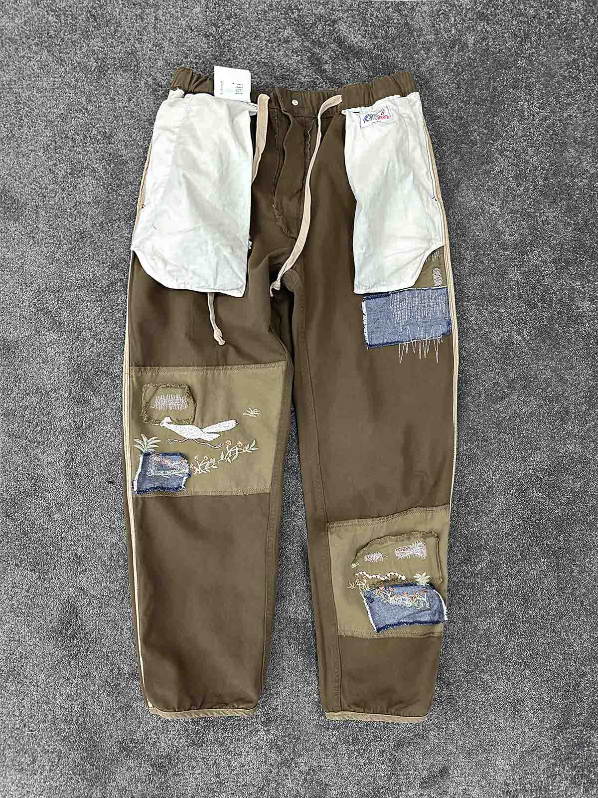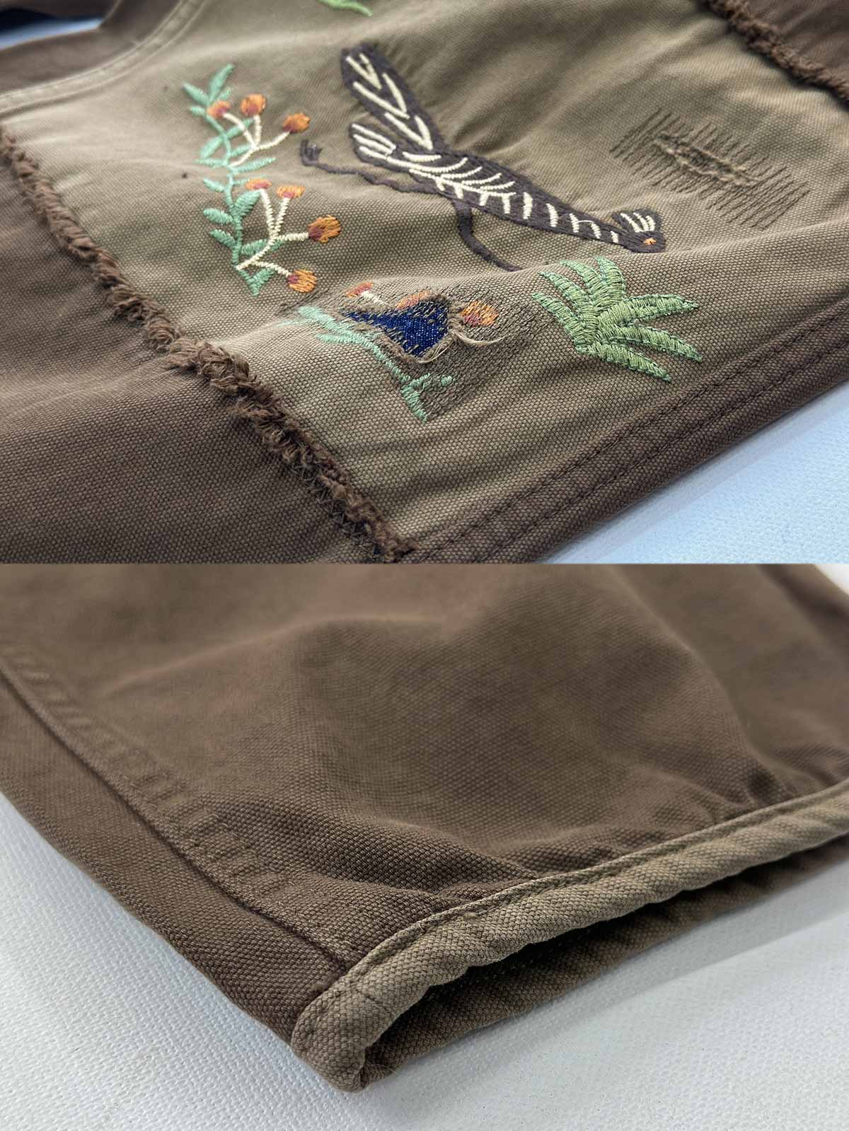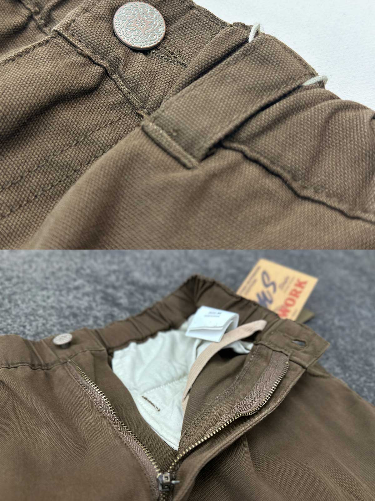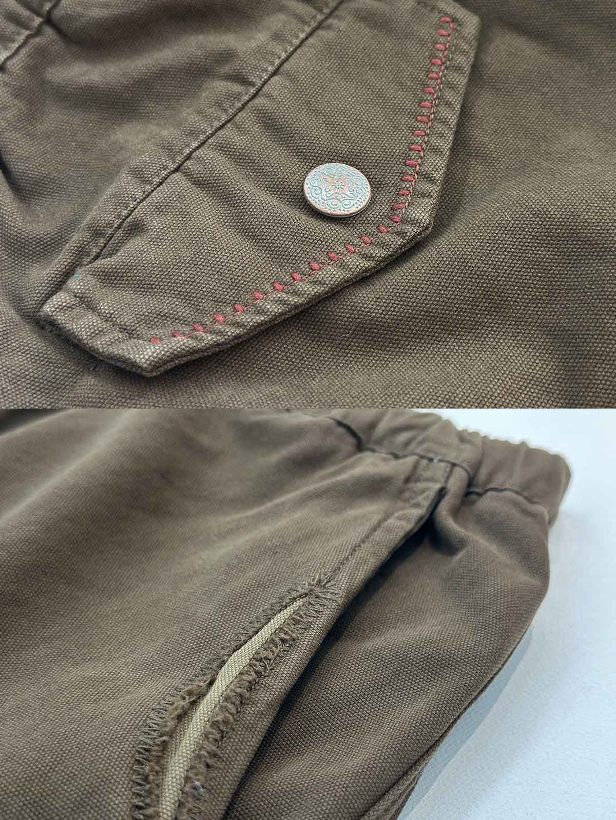 このワークパンツは、耐久性に優れた全綿のキャンバスで作られています。シーズンを問わず快適に着用可能な適度な厚みが特徴です。パンツの表面には手の込んだ刺繍が施されており、西部風のレトロな色使いと重厚な水洗加工が施されています。ウエストバックは伸縮性があり、内側には調整紐が付いており、快適なフィット感を提供します。