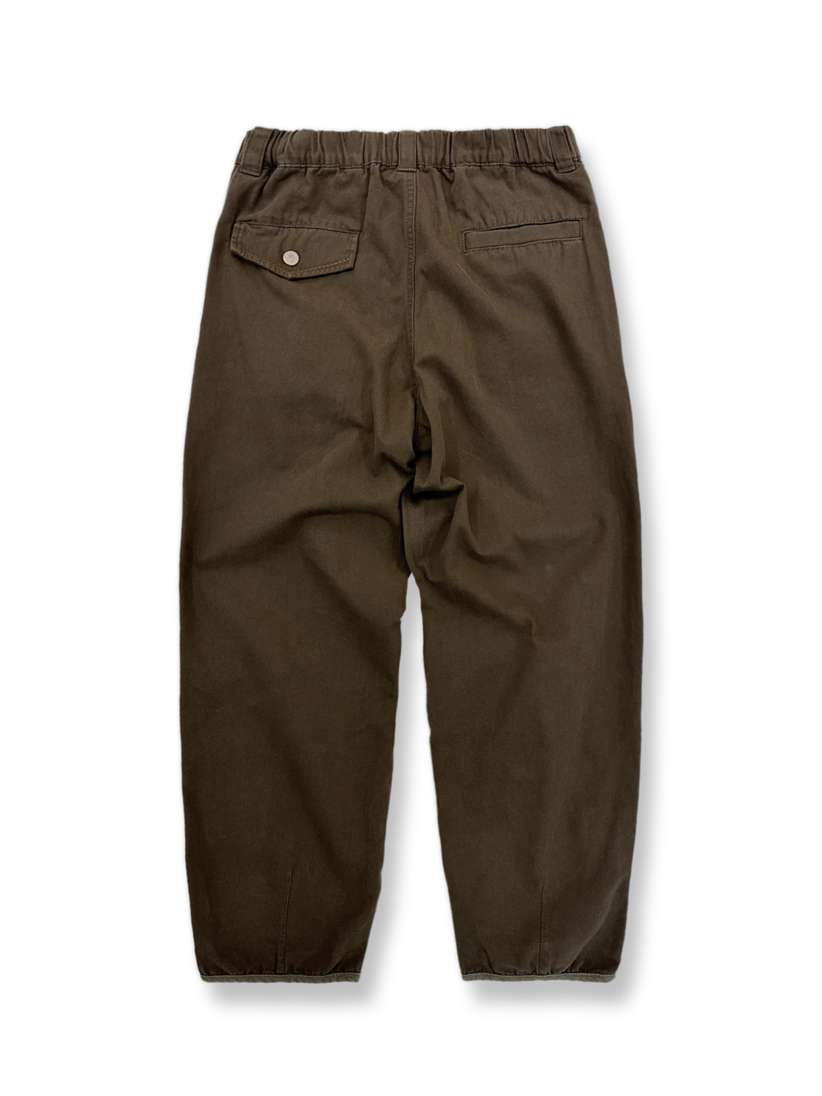 リラックスフィットで、ゆったりとした穿き心地ながらも、裾に向かって少し絞ることですっきりとした見た目が保たれています。ウエストの伸縮性と内蔵されたドローストリングは、個々の体形に合わせた調整を可能にします。足口はわずかに絞りが入っており、履くとストレートに近いシルエットを生み出します。