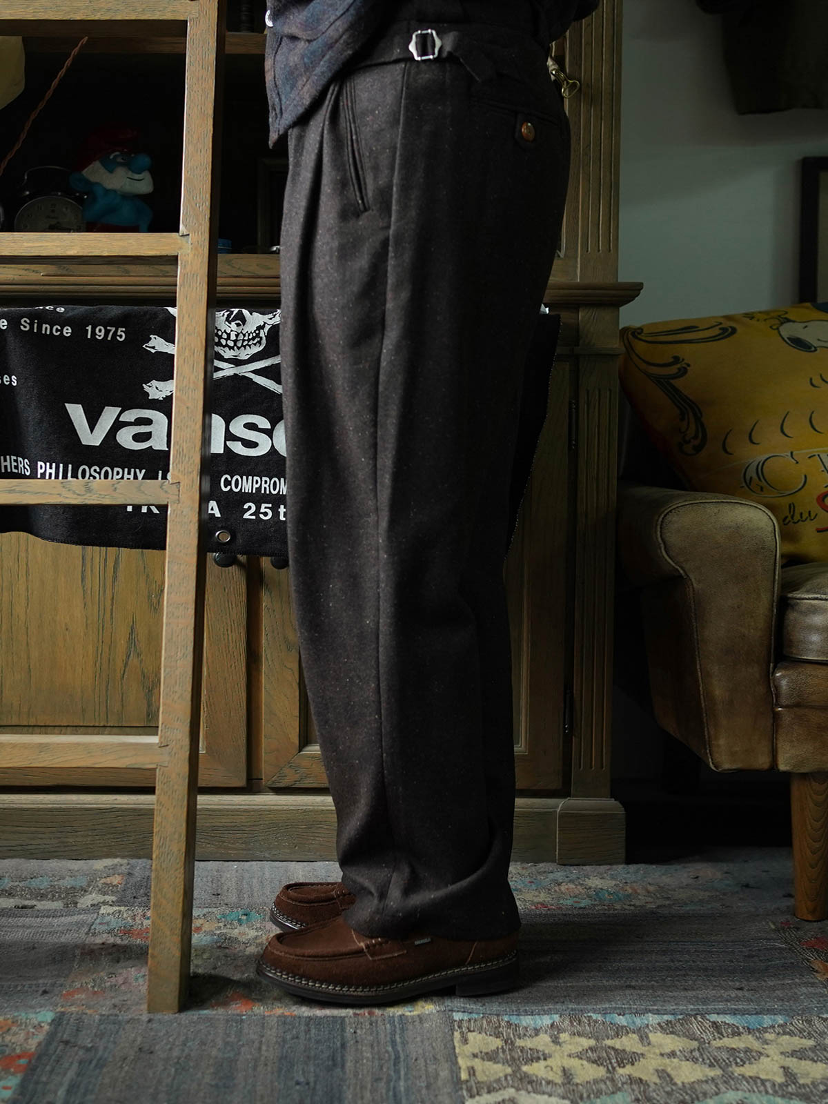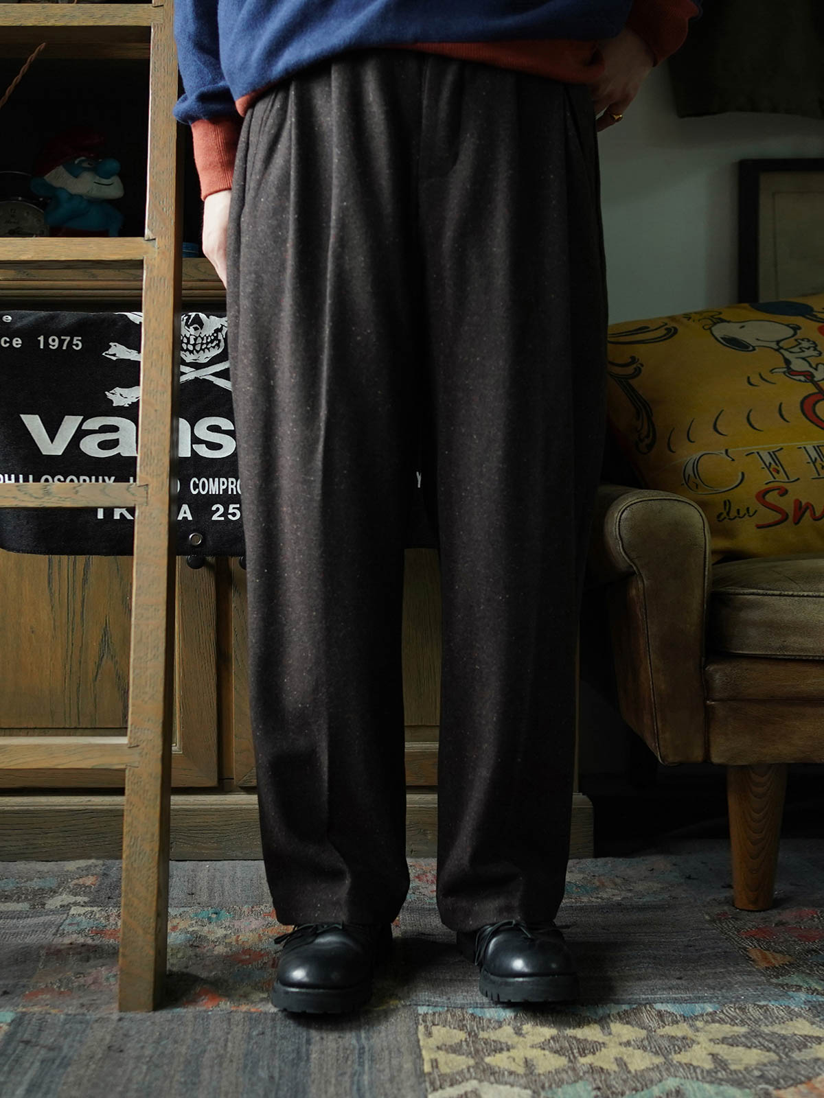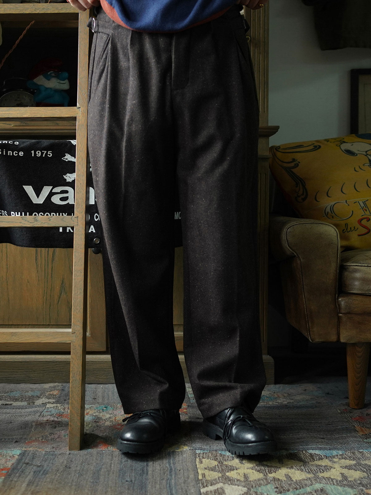 クラシックなハイウエストダブルプリーツデザインとウールの快適さ、ヴィンテージ感を組み合わせたエレガントな紳士スタイルを演出するパンツ。