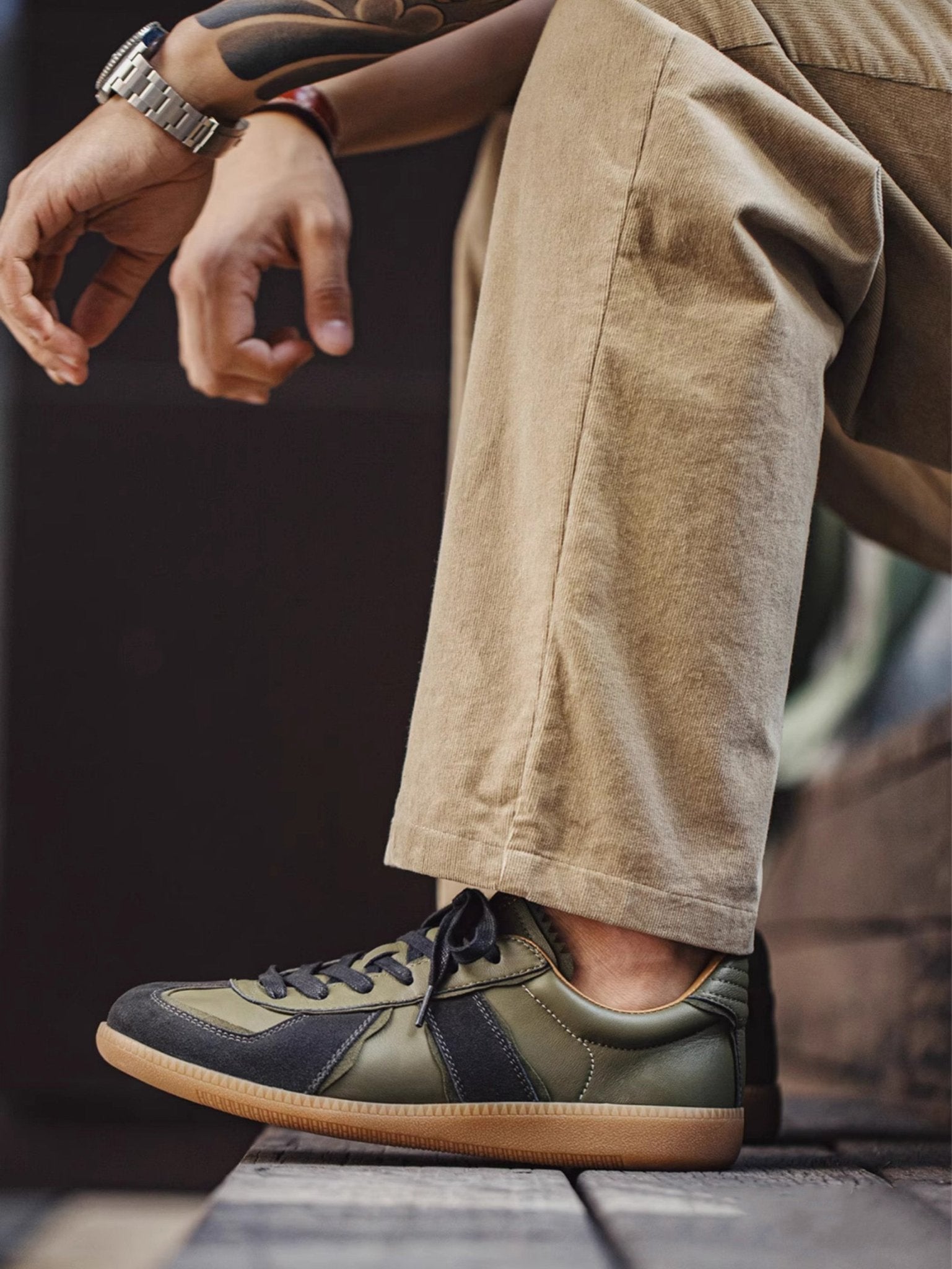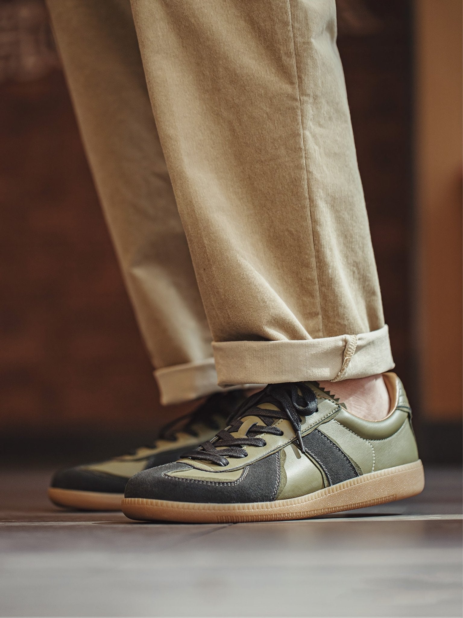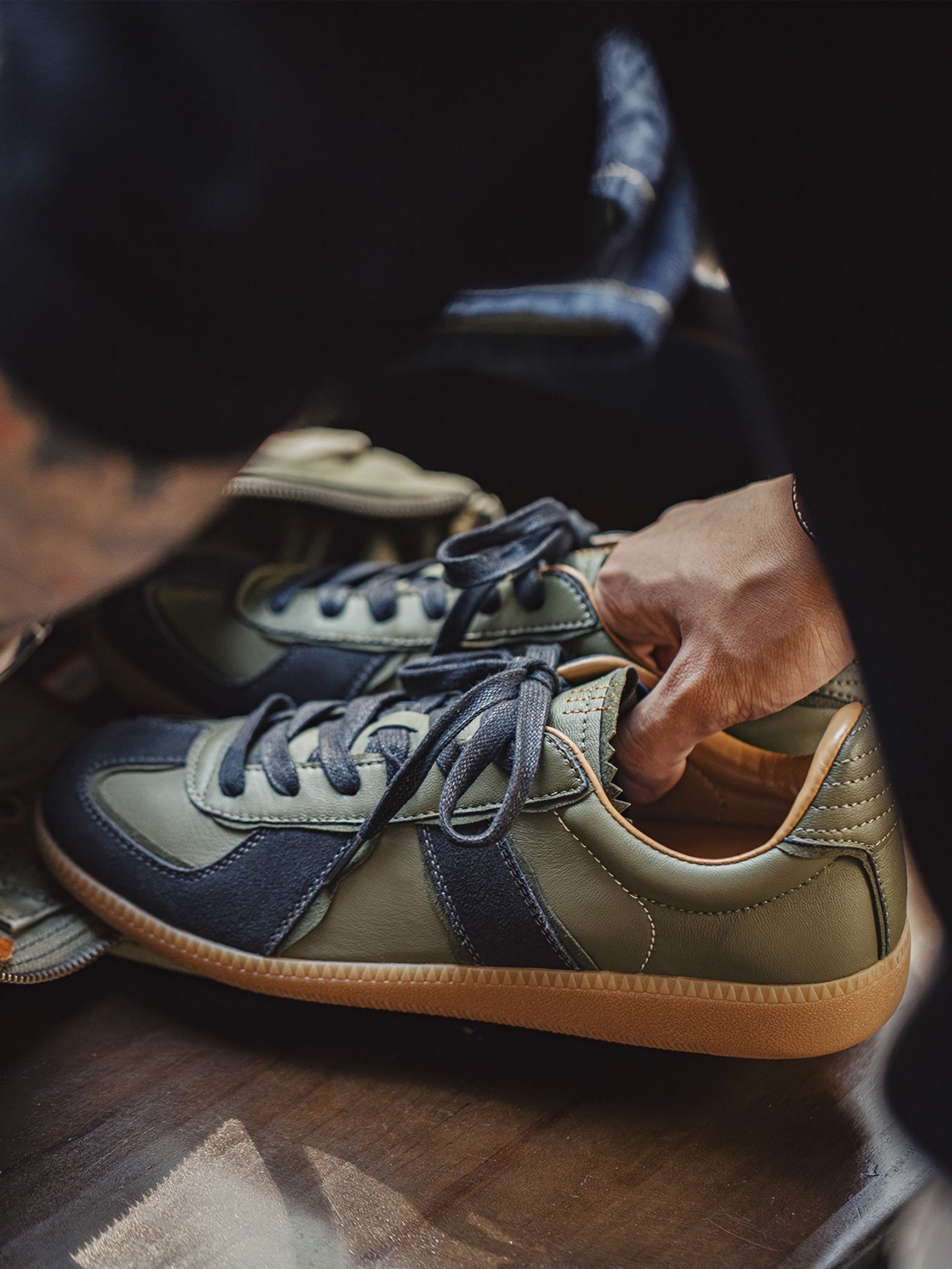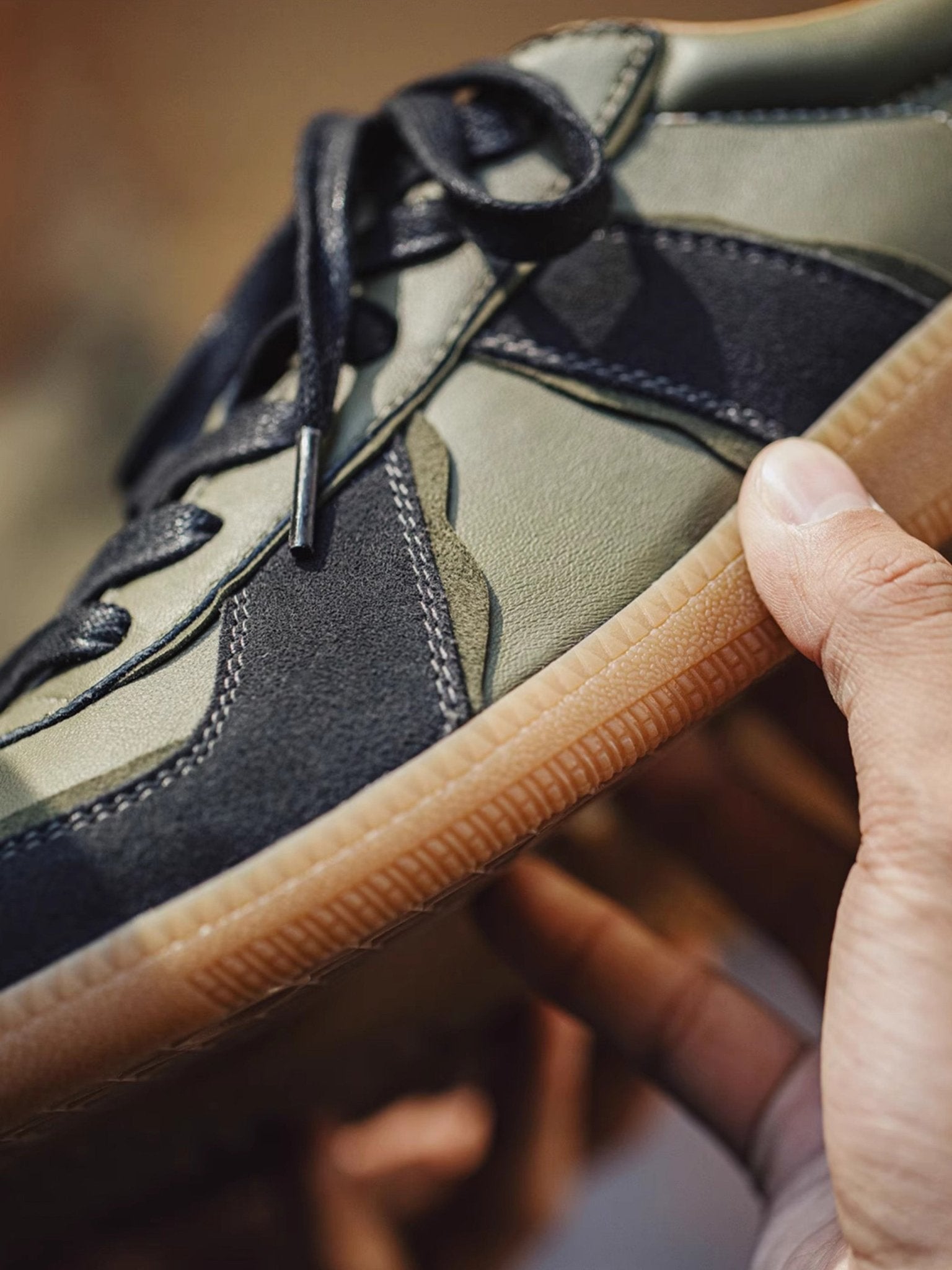 本アイテムは品質の高いラムスキンを使用しています。オリーブグリーンの部分がラムスキンを採用、 ダークグレーの毛羽立った部分がスエードレザーです。アッパーには良質なレザーとスウェード。ソールにはクラシックなゴムソールを採用。 スニーカーとは思えないほどの履き心地。