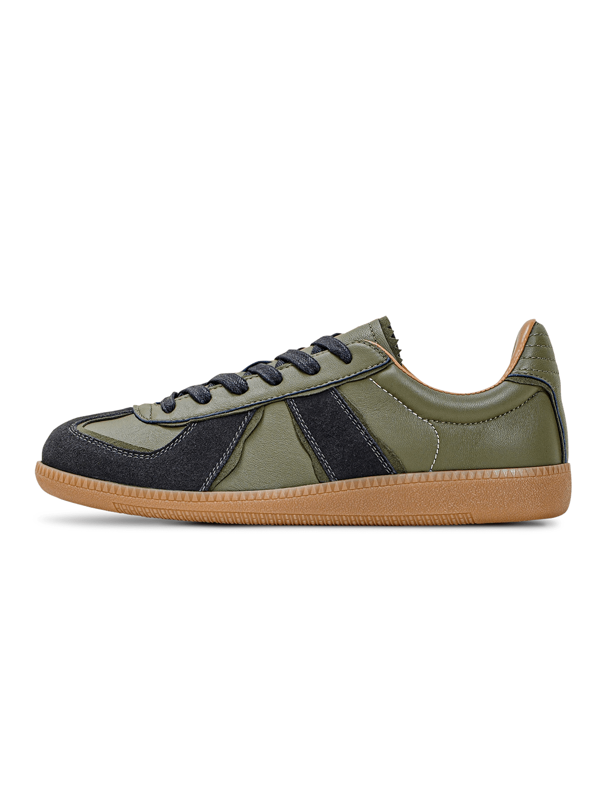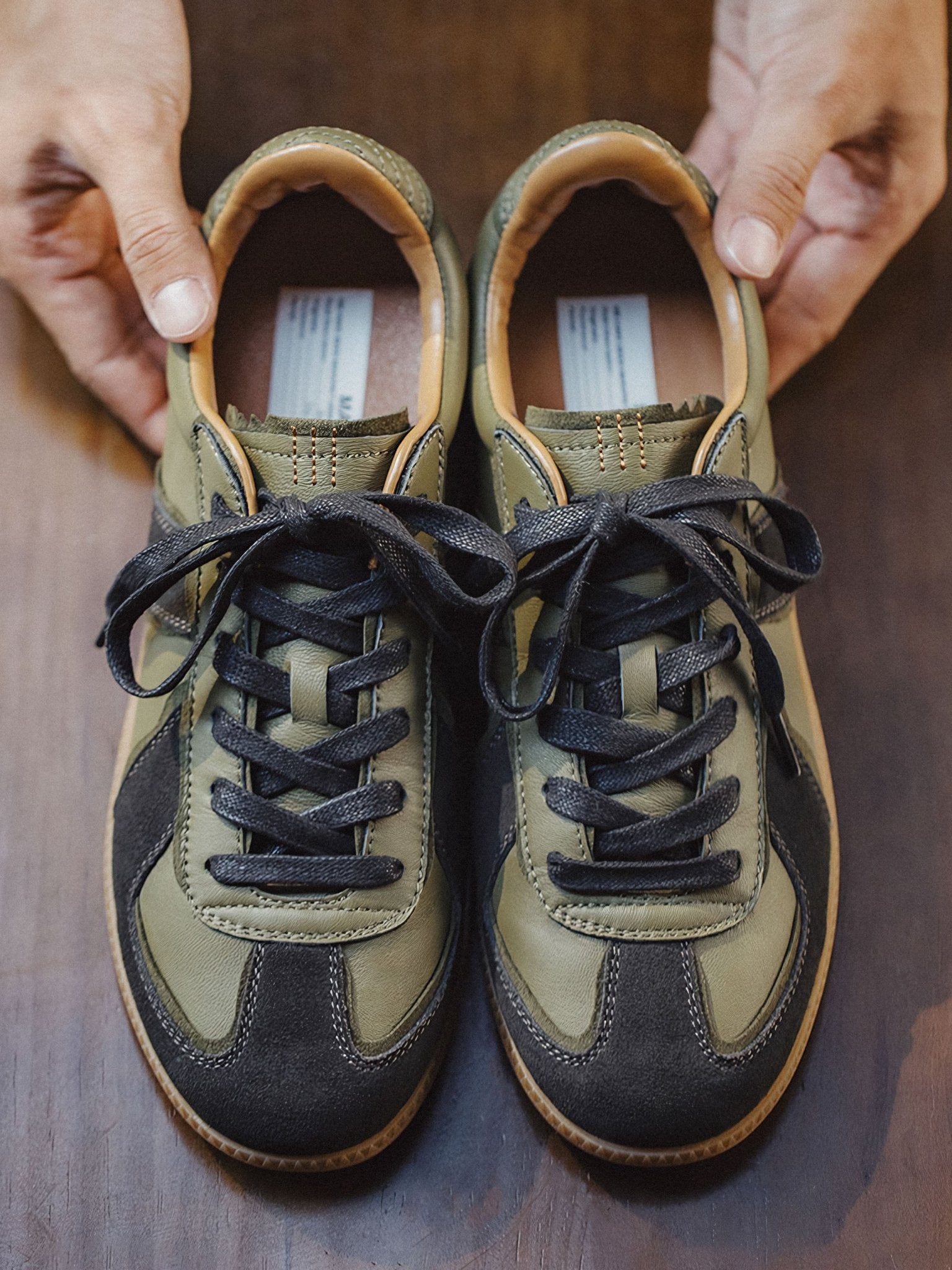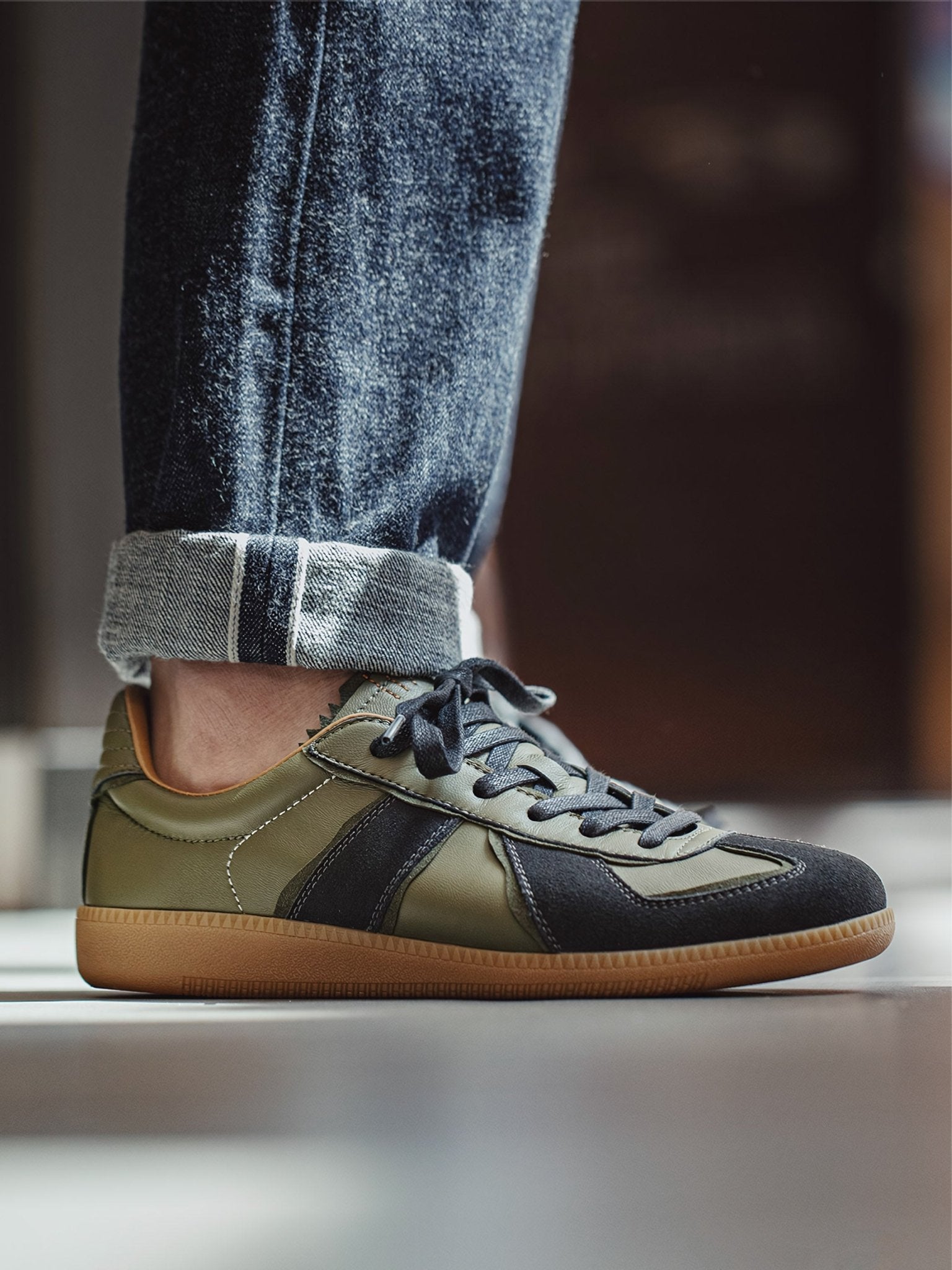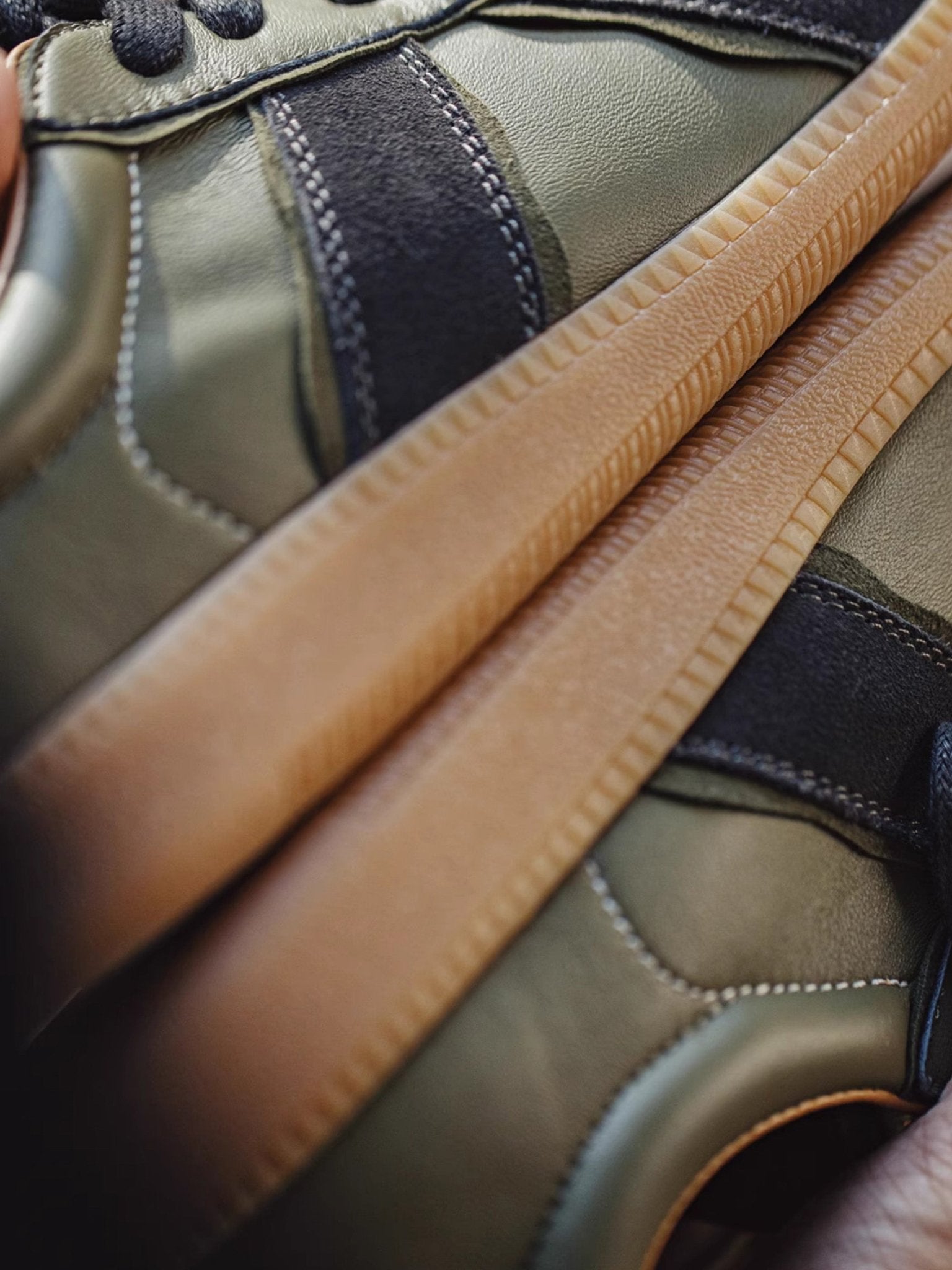 本アイテムは品質の高いラムスキンを使用しています。オリーブグリーンの部分がラムスキンを採用、 ダークグレーの毛羽立った部分がスエードレザーです。アッパーには良質なレザーとスウェード。ソールにはクラシックなゴムソールを採用。 スニーカーとは思えないほどの履き心地。