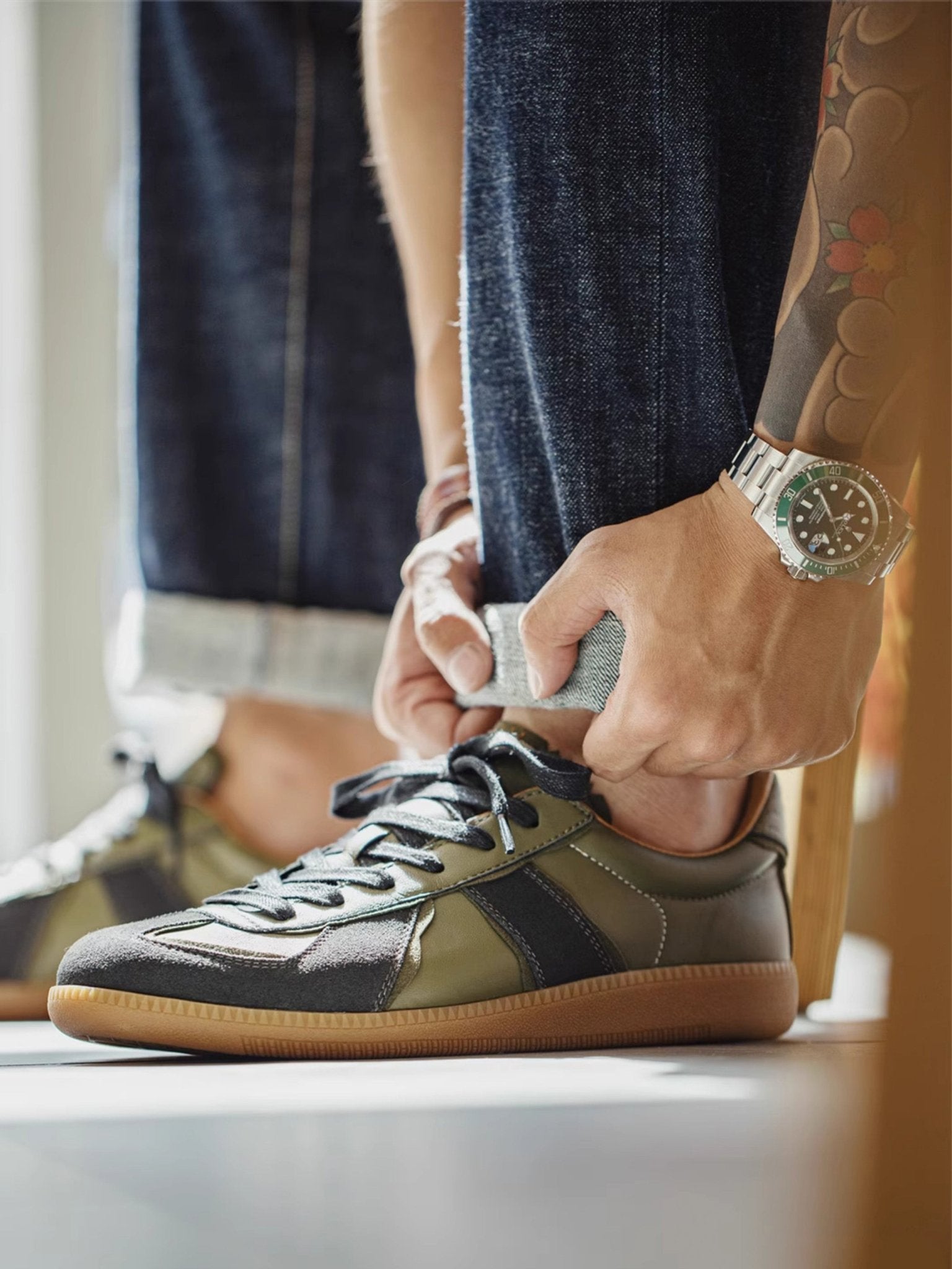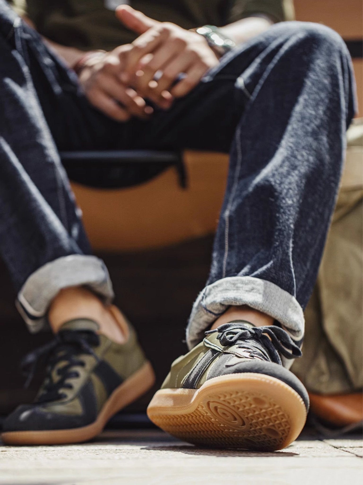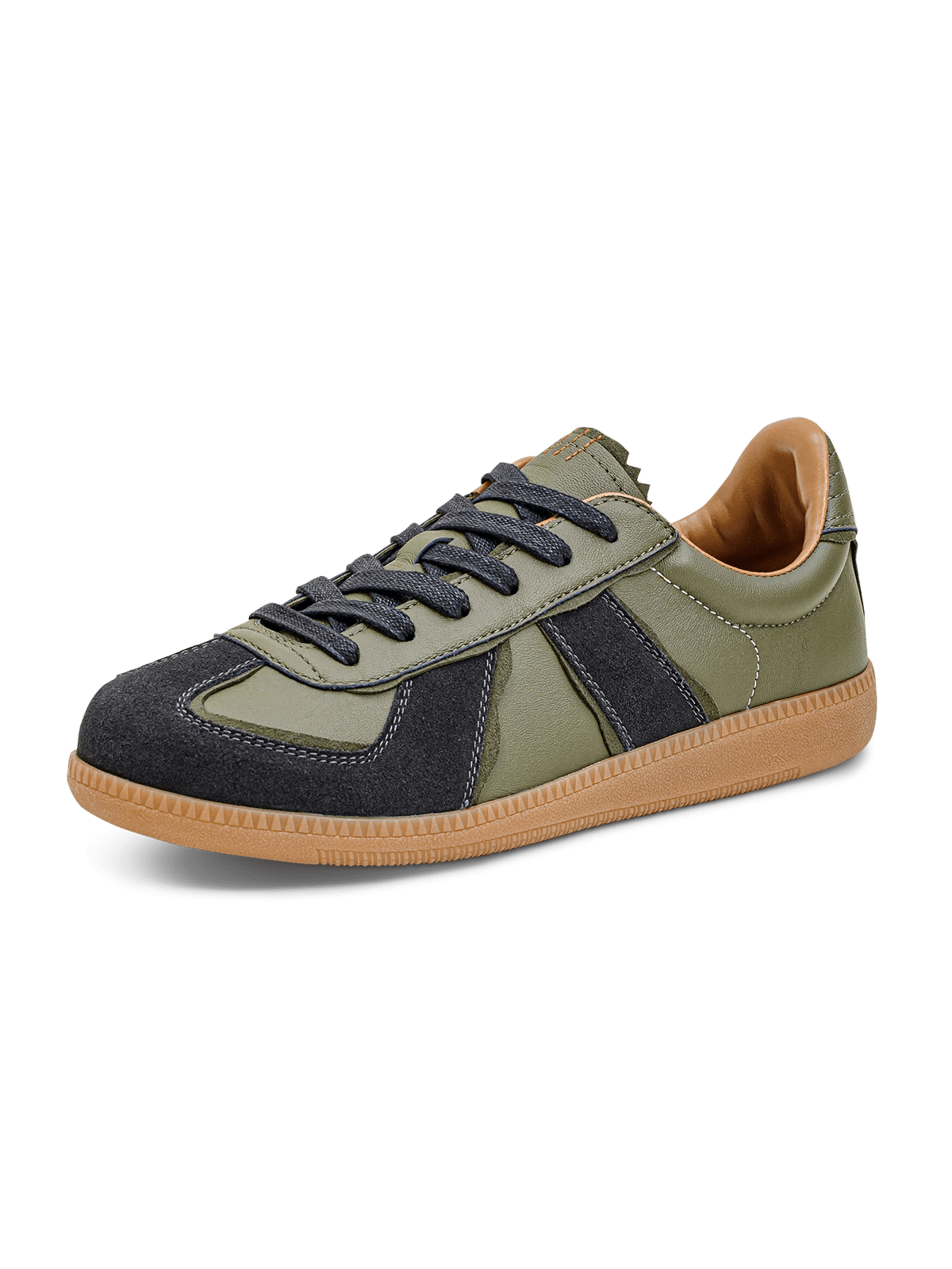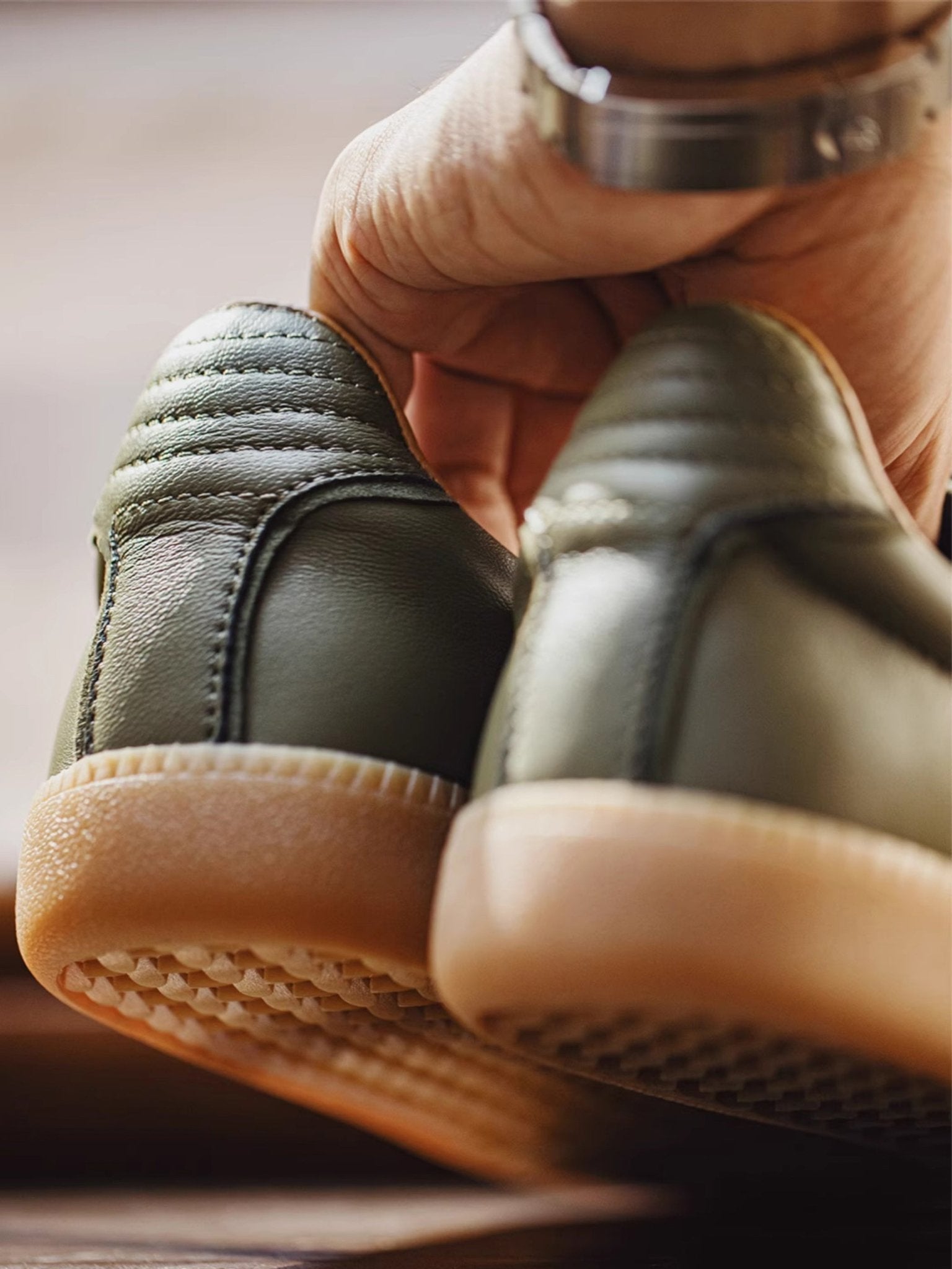 本アイテムは品質の高いラムスキンを使用しています。オリーブグリーンの部分がラムスキンを採用、 ダークグレーの毛羽立った部分がスエードレザーです。アッパーには良質なレザーとスウェード。ソールにはクラシックなゴムソールを採用。 スニーカーとは思えないほどの履き心地。