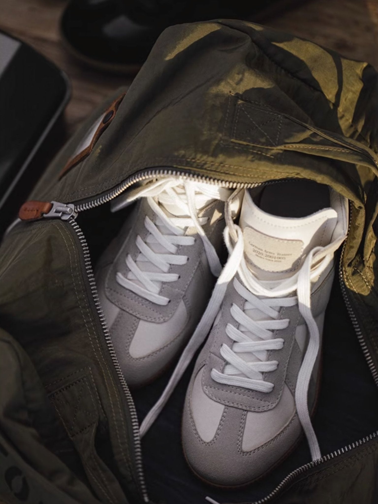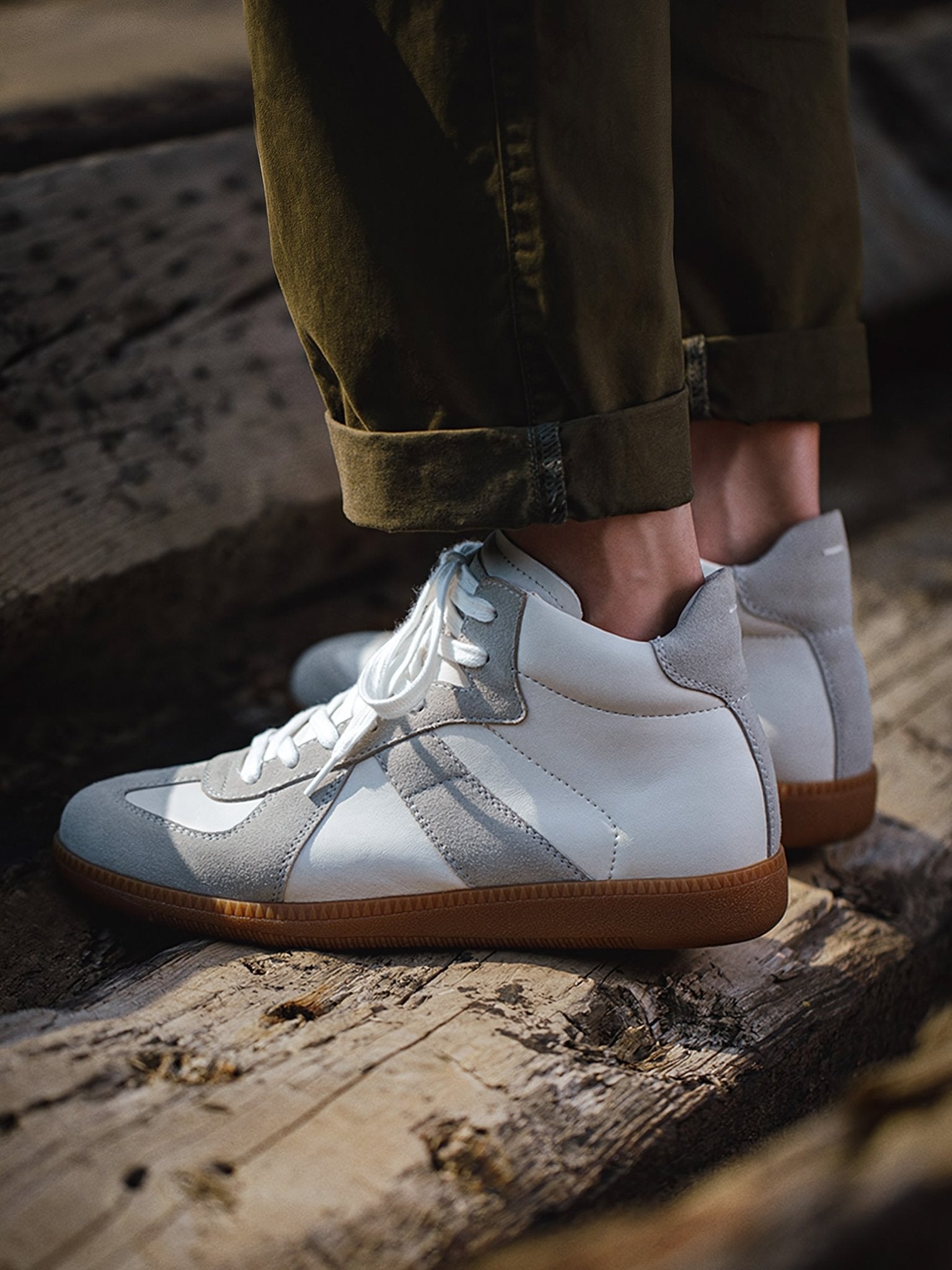 ハイカットドイツ軍ジャーマンスニーカーは、耐久性と快適性を兼ね備えた素材を使用しています。デザインはシンプルながらも大人らしいスタイリングにぴったりで、カジュアルからきれいめまで幅広く対応できる注目の一足です。