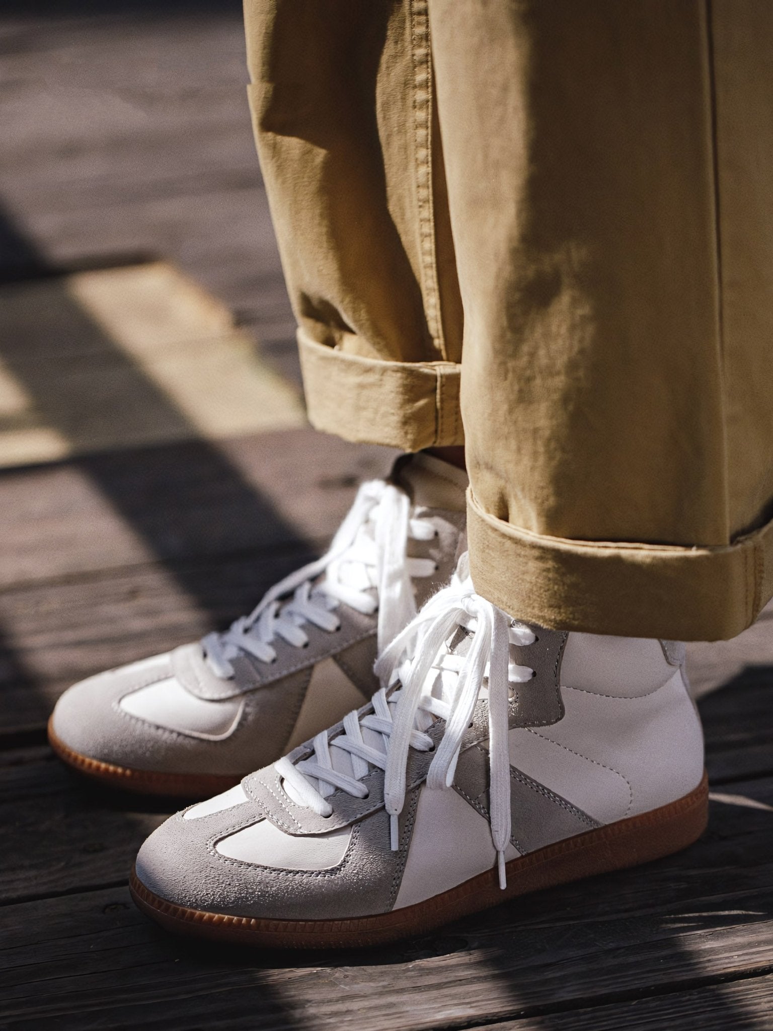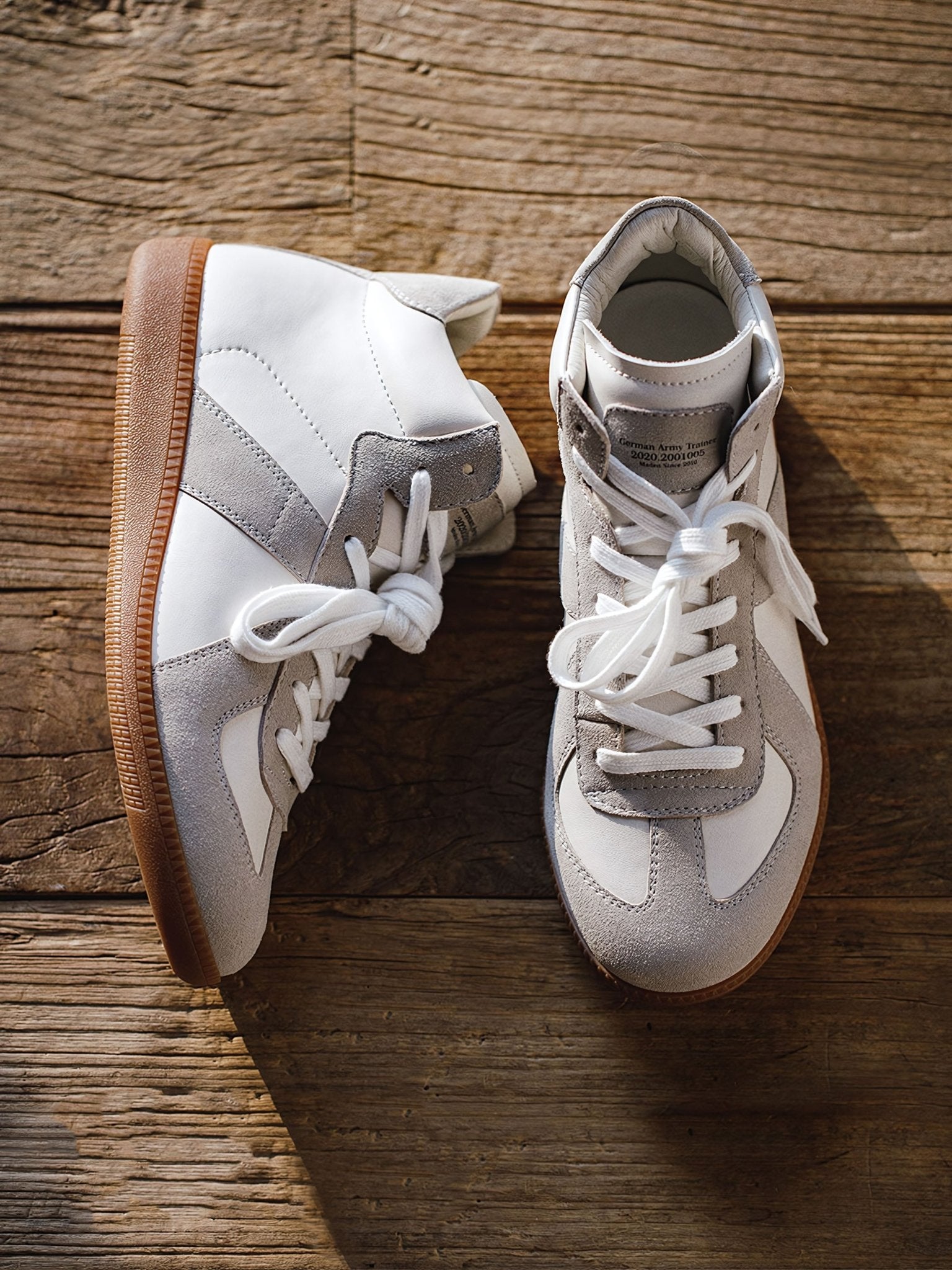 ハイカットバージョンのジャーマンスニーカーは、ジャーマントレーナーの定番デザインを踏襲しつつ、より多様なコーディネートに対応しています。1970年代~1994年にかけて、ドイツ軍のトレーニングシューズとして支給されていたこのスニーカーは、現在も多くのスニーカーのデザインに影響を与えています。レトロな雰囲気が好まれるジャーマントレーナーの愛好家にとって、このリプロダクションのハイカットバージョンは必見の一足です。シンプルでありながら個性を感じさせるデザインで、幅広いスタイリングにマッチします。