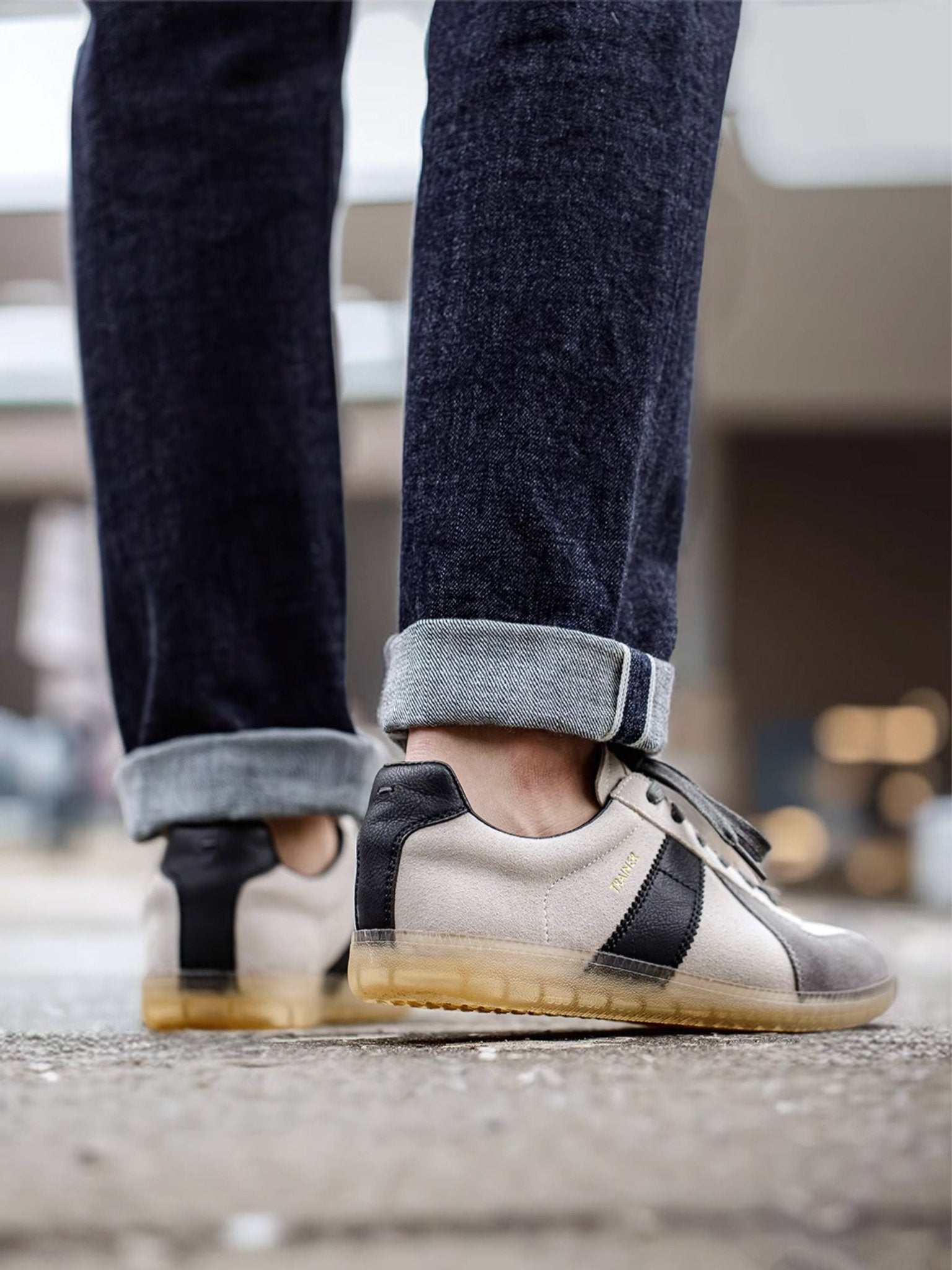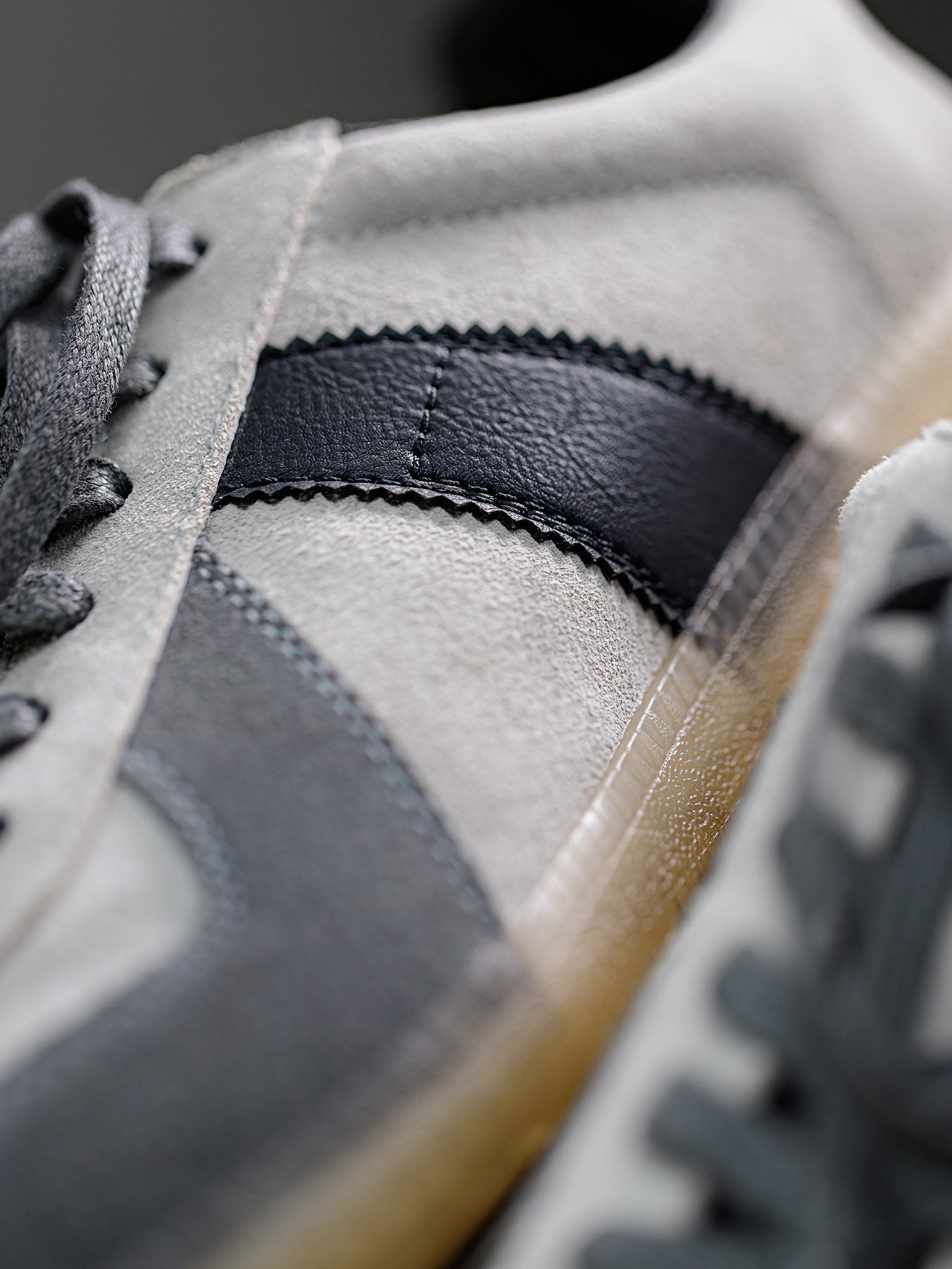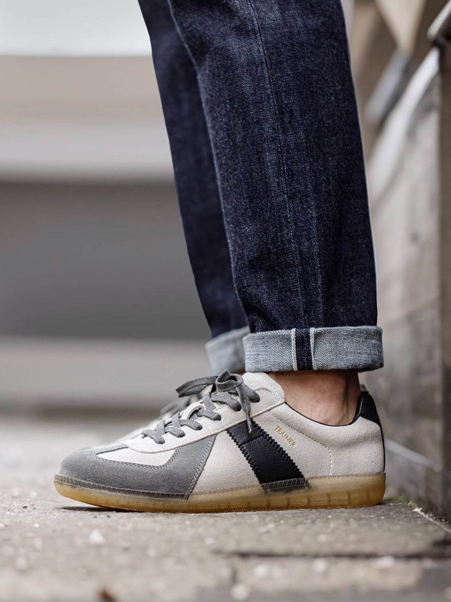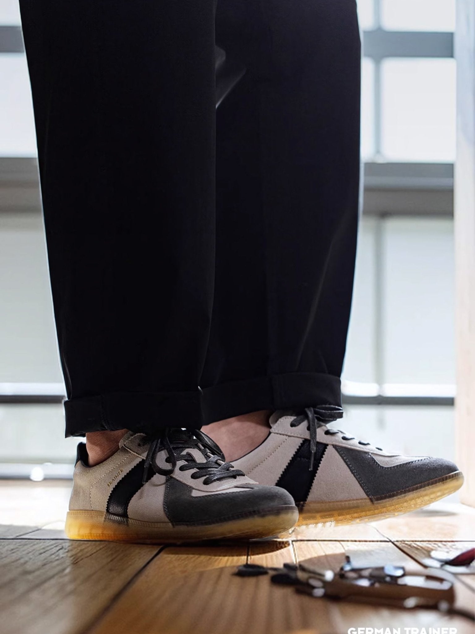 ジャーマントレーナーはスニーカーの中でもよく目にするデザインです。もともとはドイツ軍のトレーニングシューズとして生まれ、現在では数多くのスニーカーのデザインに影響を与えています。本アイテムは伝統的な染め職人が古くからの技術を現代の素材に施し、本来の味を生かした特別な加工法で一反一反丁寧に染めています。