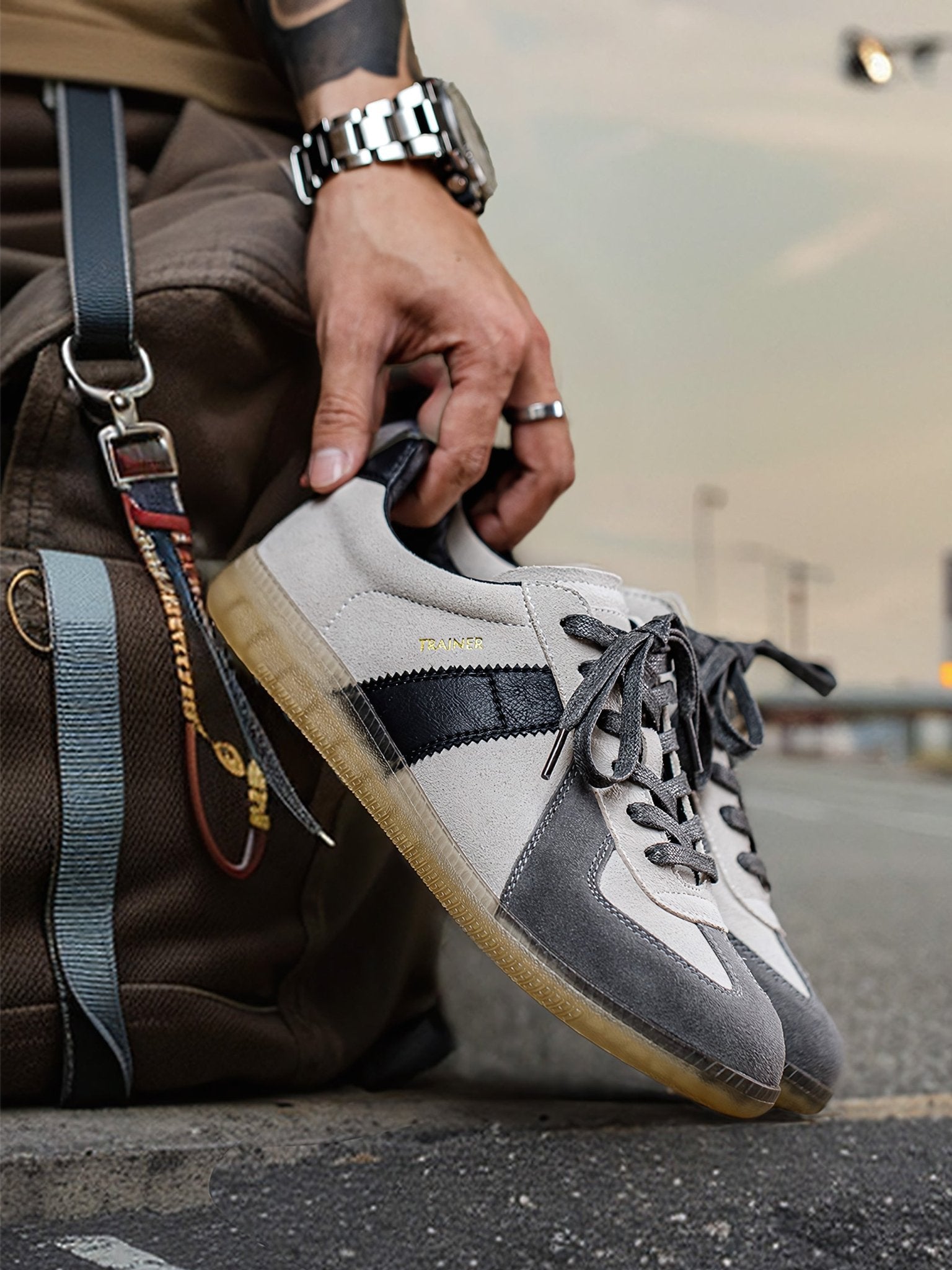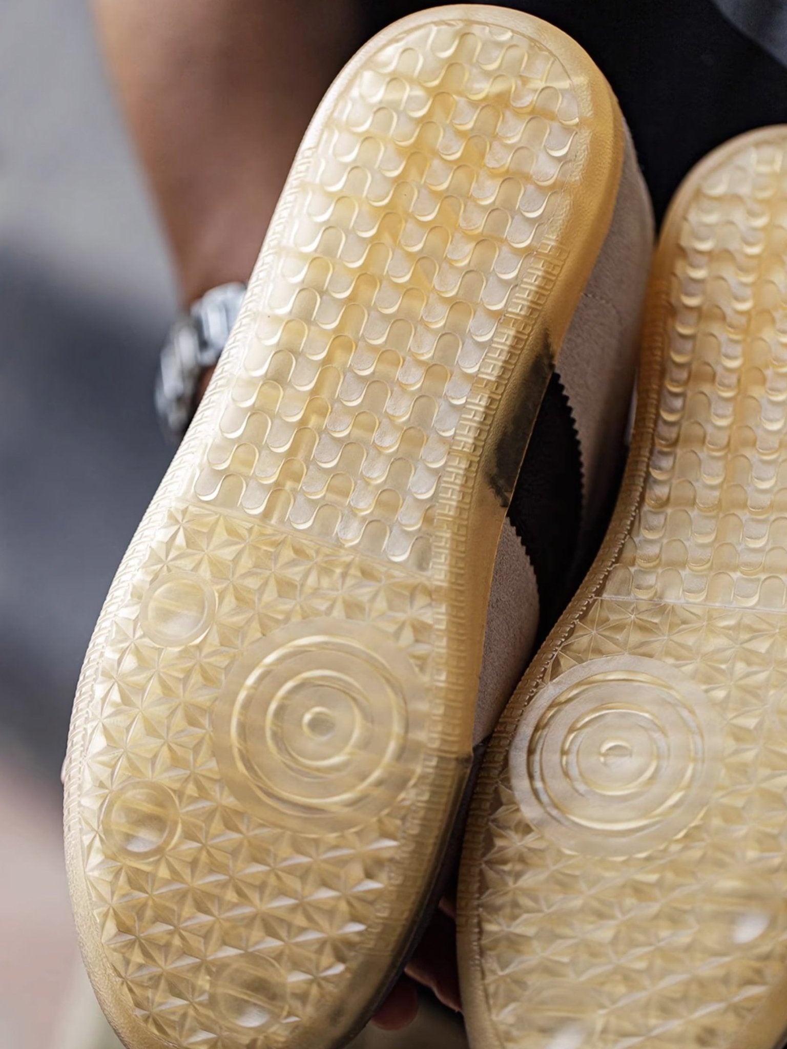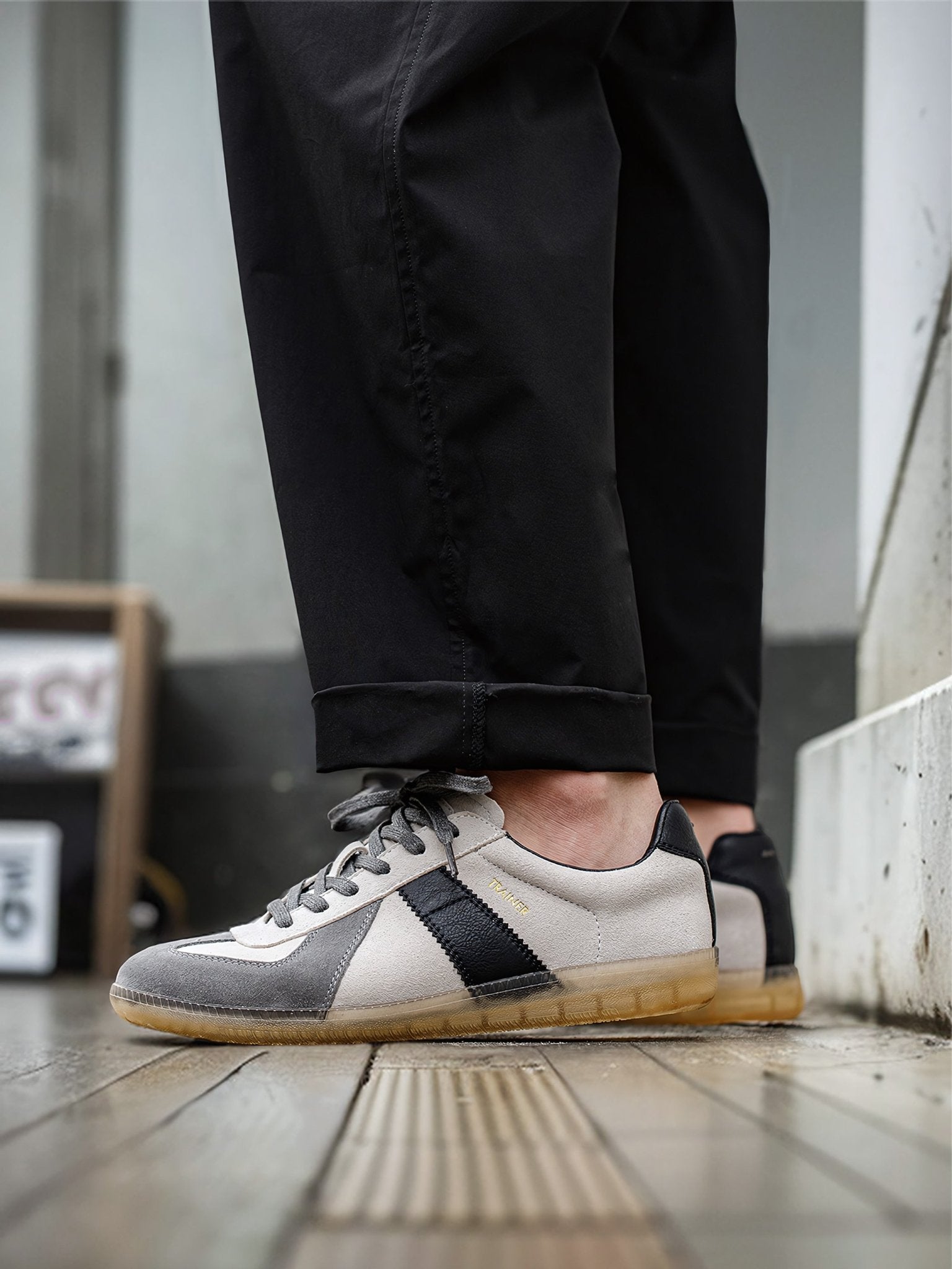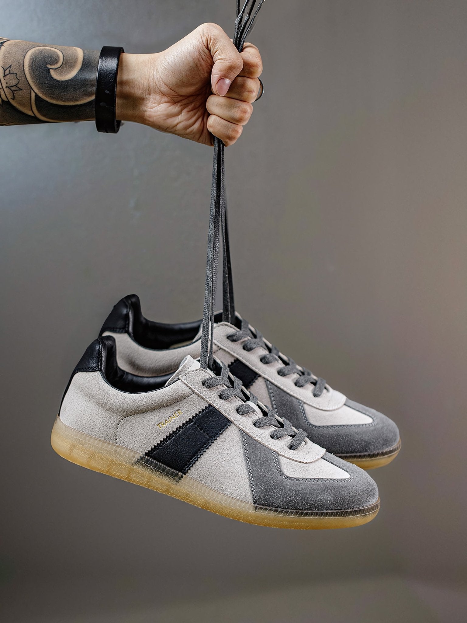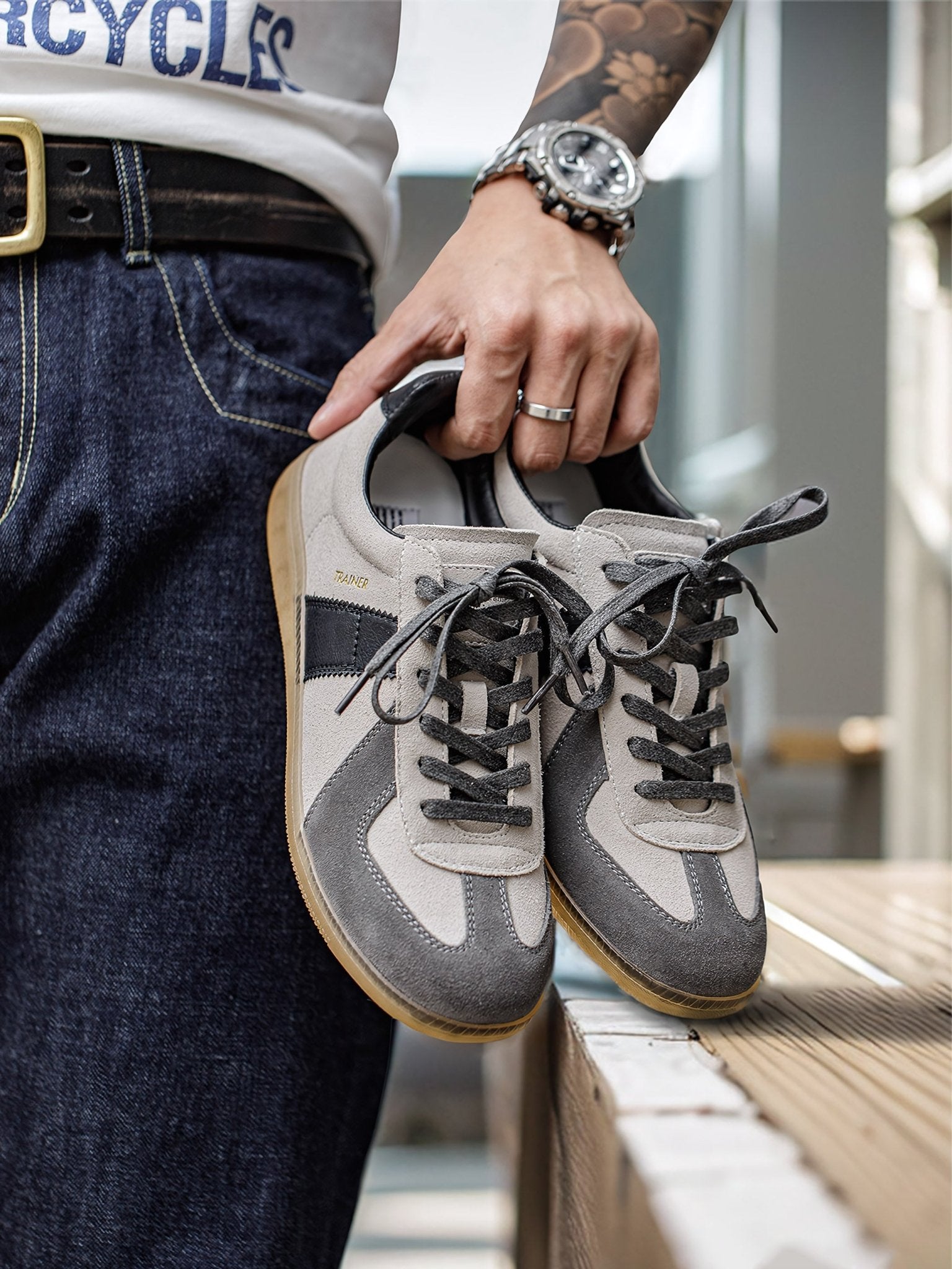 ジャーマントレーナーはスニーカーの中でもよく目にするデザインです。もともとはドイツ軍のトレーニングシューズとして生まれ、現在では数多くのスニーカーのデザインに影響を与えています。本アイテムは伝統的な染め職人が古くからの技術を現代の素材に施し、本来の味を生かした特別な加工法で一反一反丁寧に染めています。