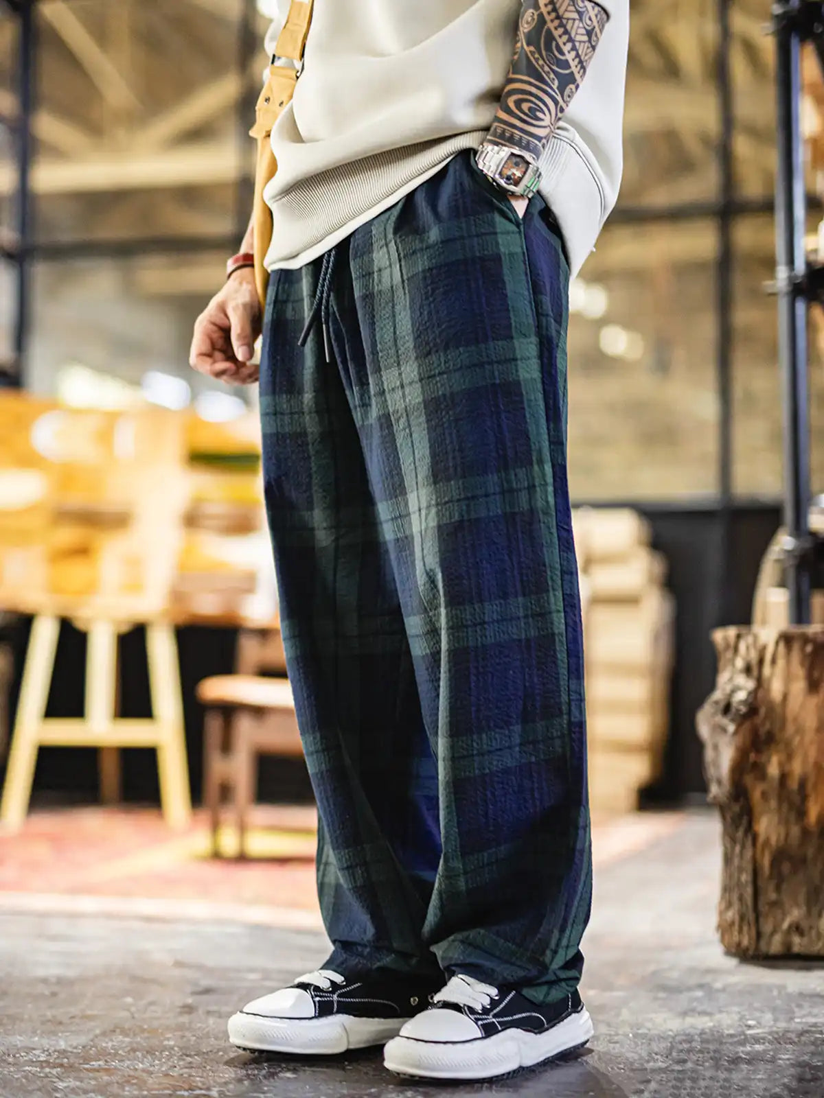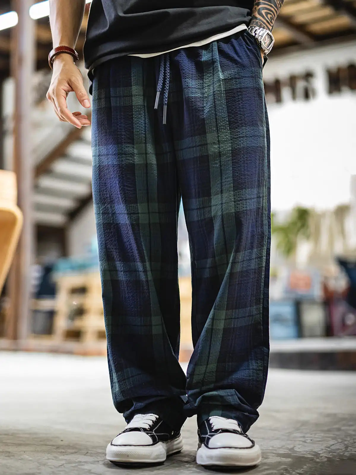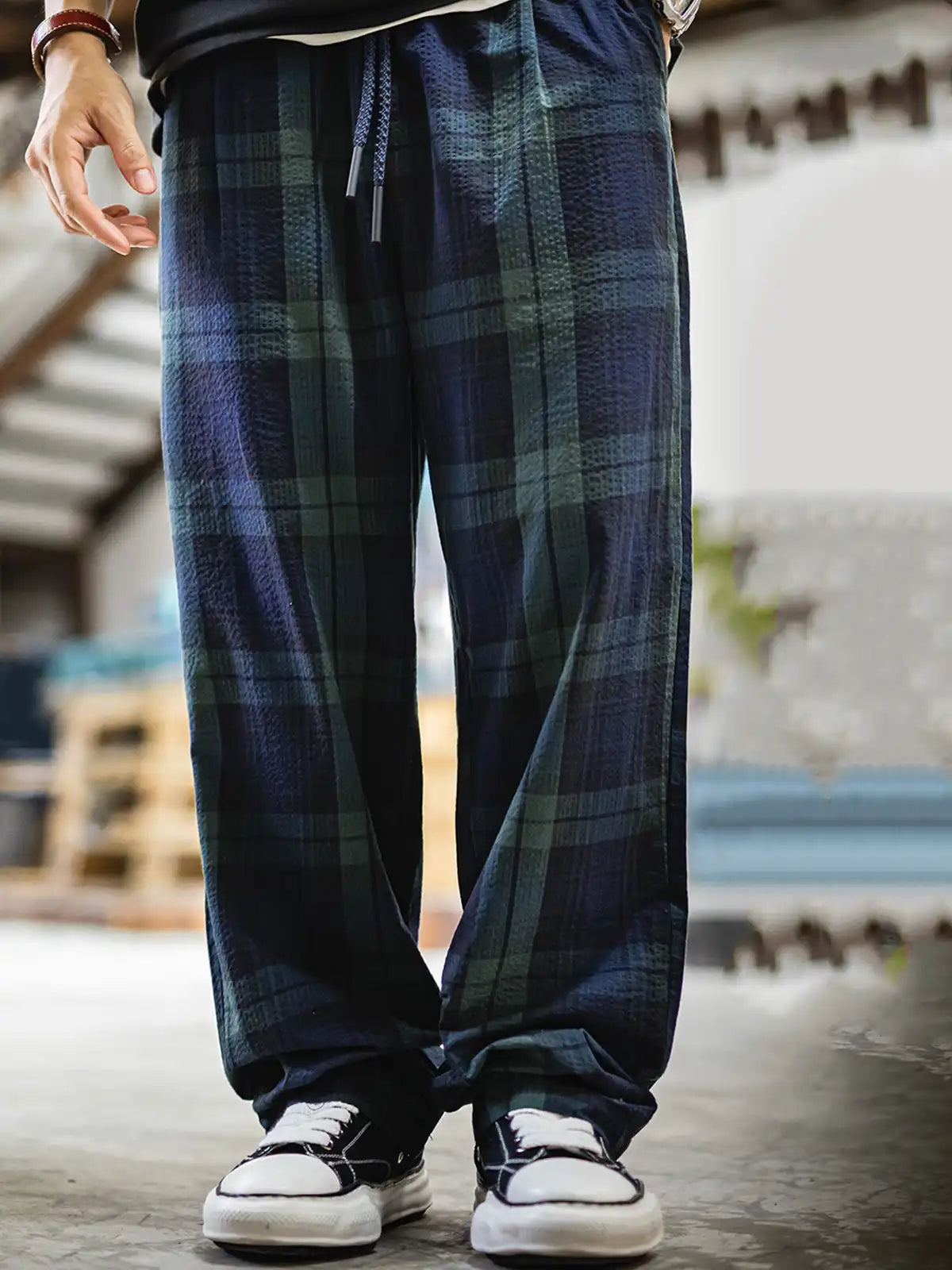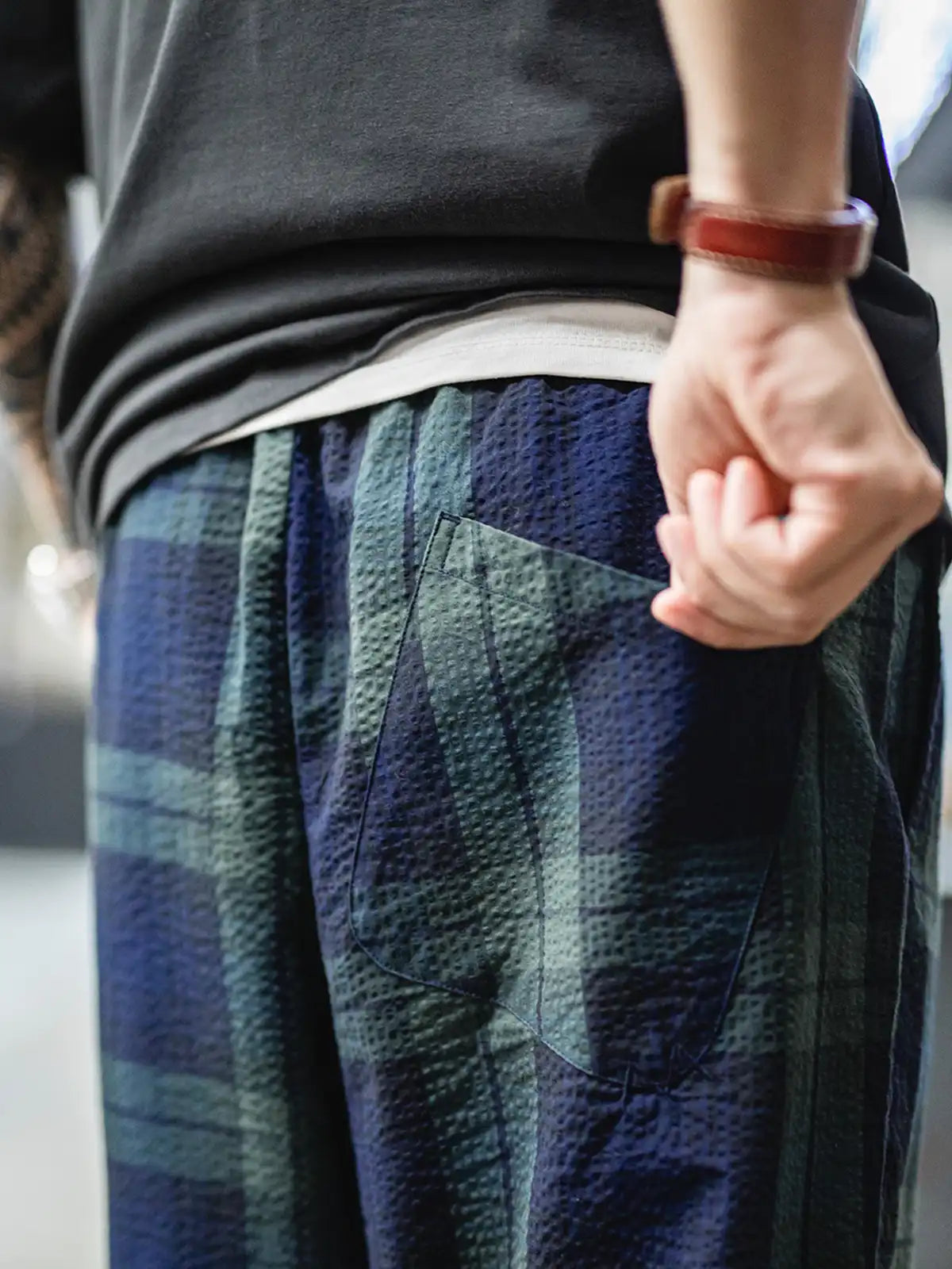 18世紀スコットランド高地のBlack Watch部隊が纏った軍服のタータンパターンを現代に再解釈し、リネンライクな凹凸が特徴のサッカー生地で仕立てました。ウエストはゴム+ドローコードで好みのフィット感に調節可能。後ろポケットの同色ステッチやマット仕上げのコードエンドなど、細部までこだわったディテールがさりげない存在感を放ち、Tシャツからニット、ジャケットまであらゆるアイテムと自然に調和します。