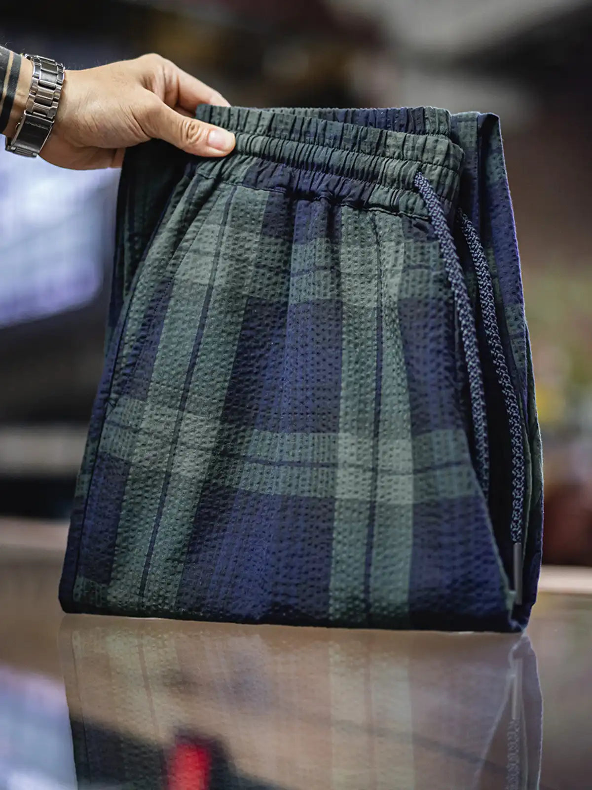 Black Watch由来の落ち着いたブルー×グリーン格子が、凹凸のあるサッカー生地と相まってリラックス感と気品を両立します。