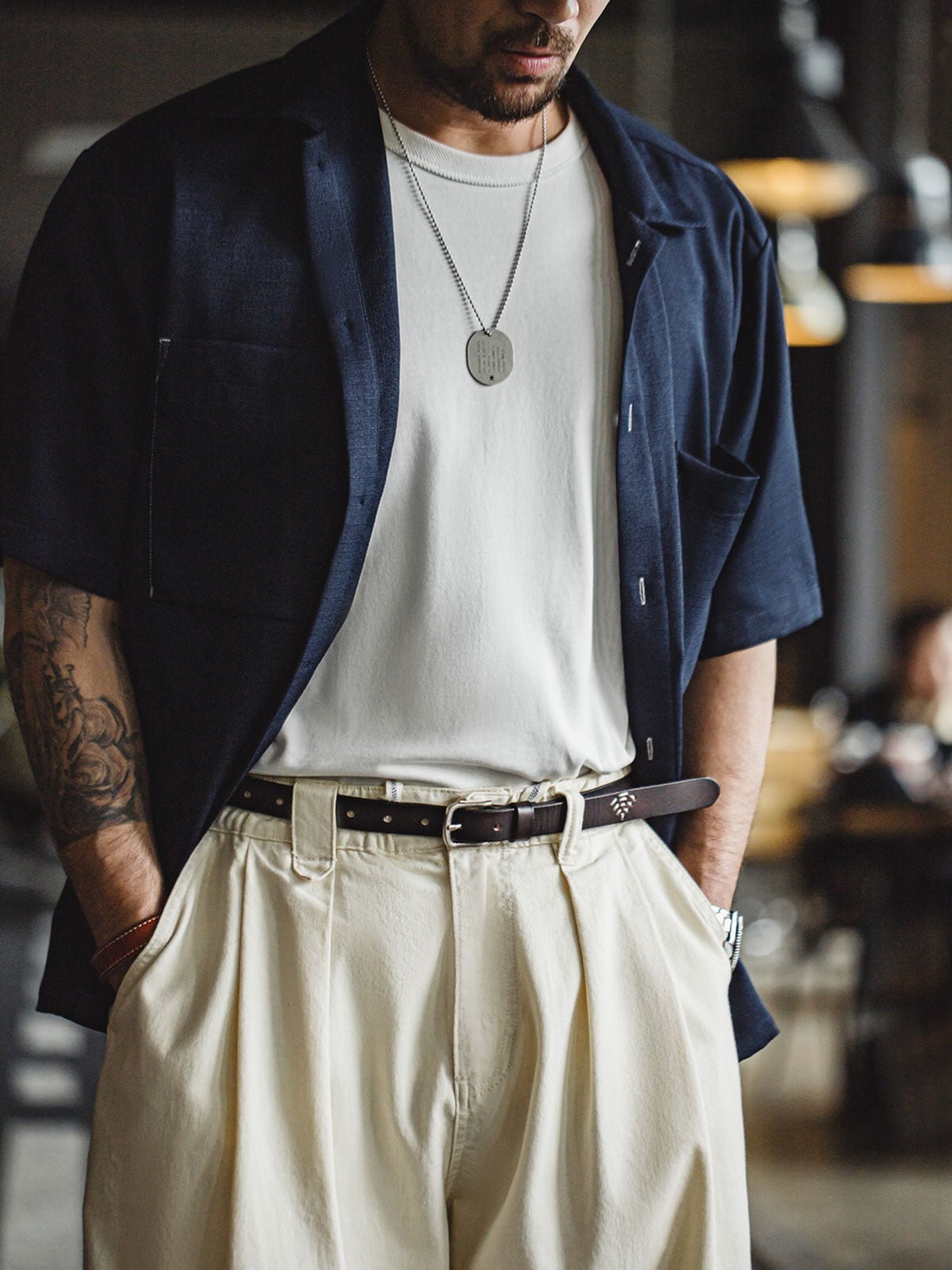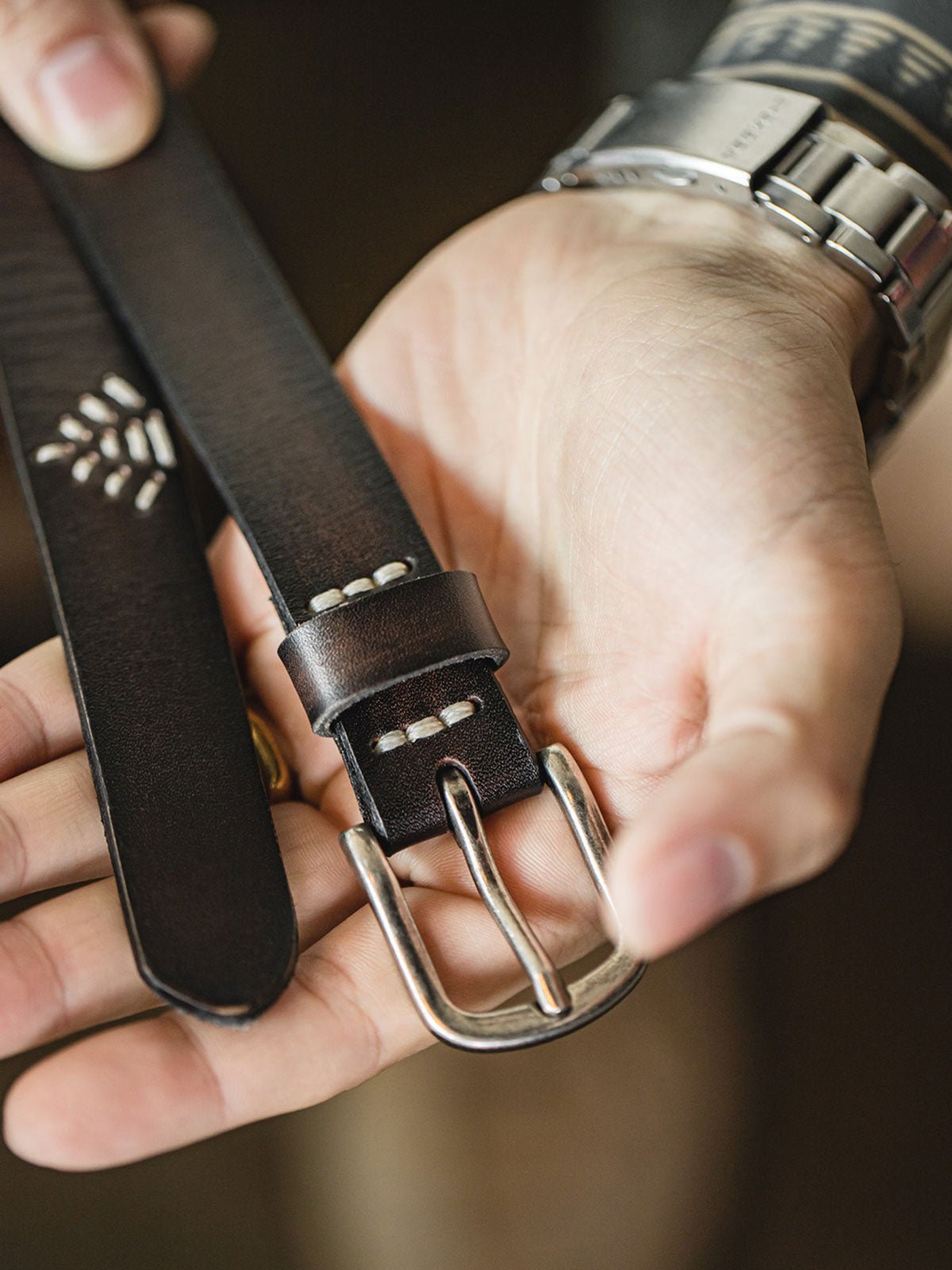 この黒の一層牛革ベルトは、ネイティブアメリカンのインディアン要素を取り入れ、控えめなステッチが特徴的なユニークなレトロスタイルを演出します。クラシックな黒にヴィンテージ風のアンティークシルバーピンバックルを組み合わせることで、全体のファッション性と実用性を高めています。ベルトには高品質な一層牛革を使用し、耐久性と快適性を保証します。亜鉛合金のピンバックルと白いステッチが、ベルトの強度と耐久性を確保しています。ベルトには金箔の英語とアンカーのエンボスが施され、デザイン性と独自性を高めています。日常の装いに欠かせないスタイリッシュなアイテムです。