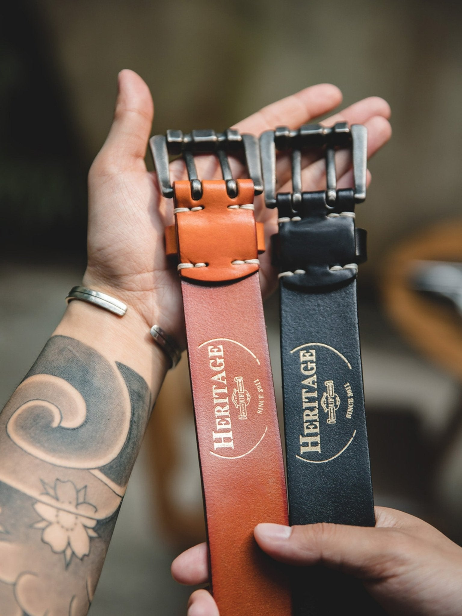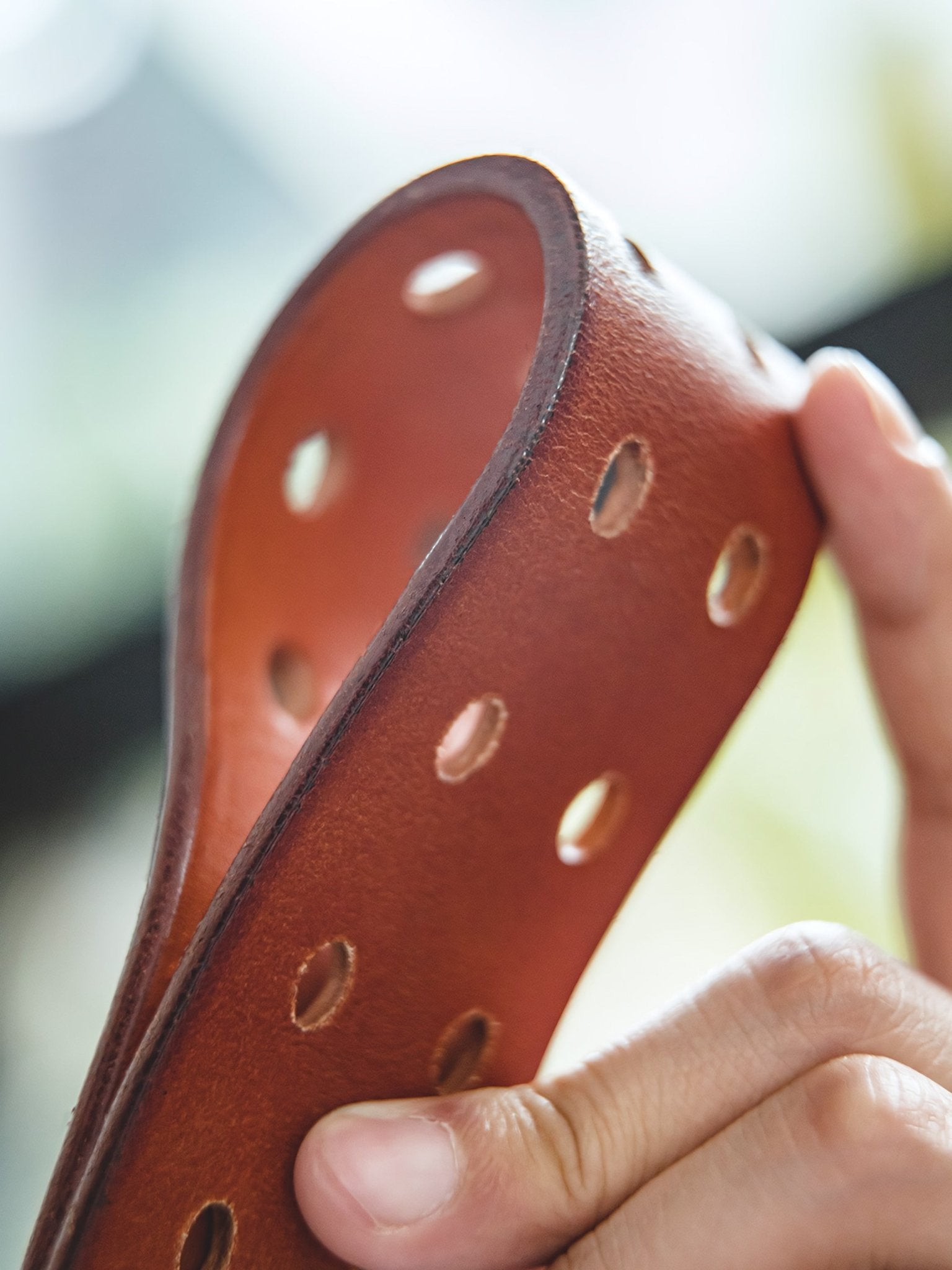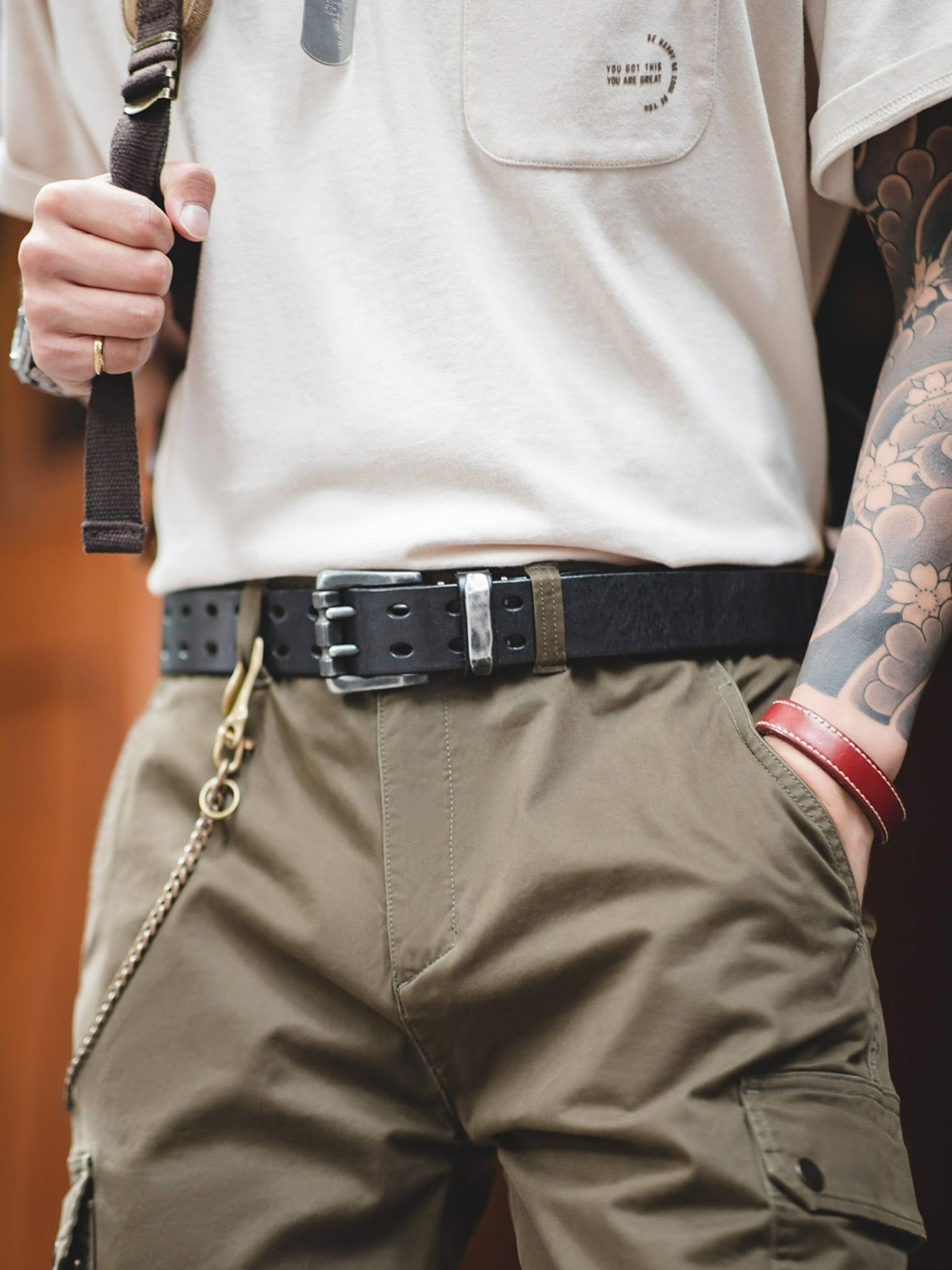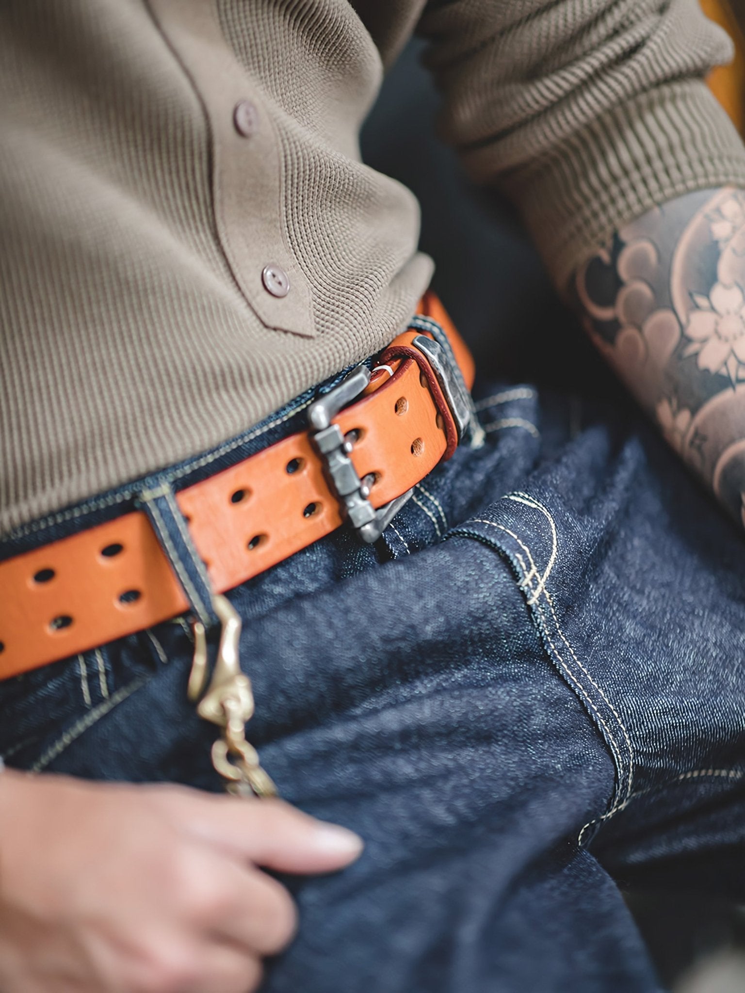 ストリートスタイルやアウトドアコーデ、そして流行のミリタリーファッションに最適なトップレザー素材のベルトが登場。2連のハトメ穴が存在感抜群で、ダブルピンによる長さ調節が可能。ローラー部は回転し、装着感を高めています。