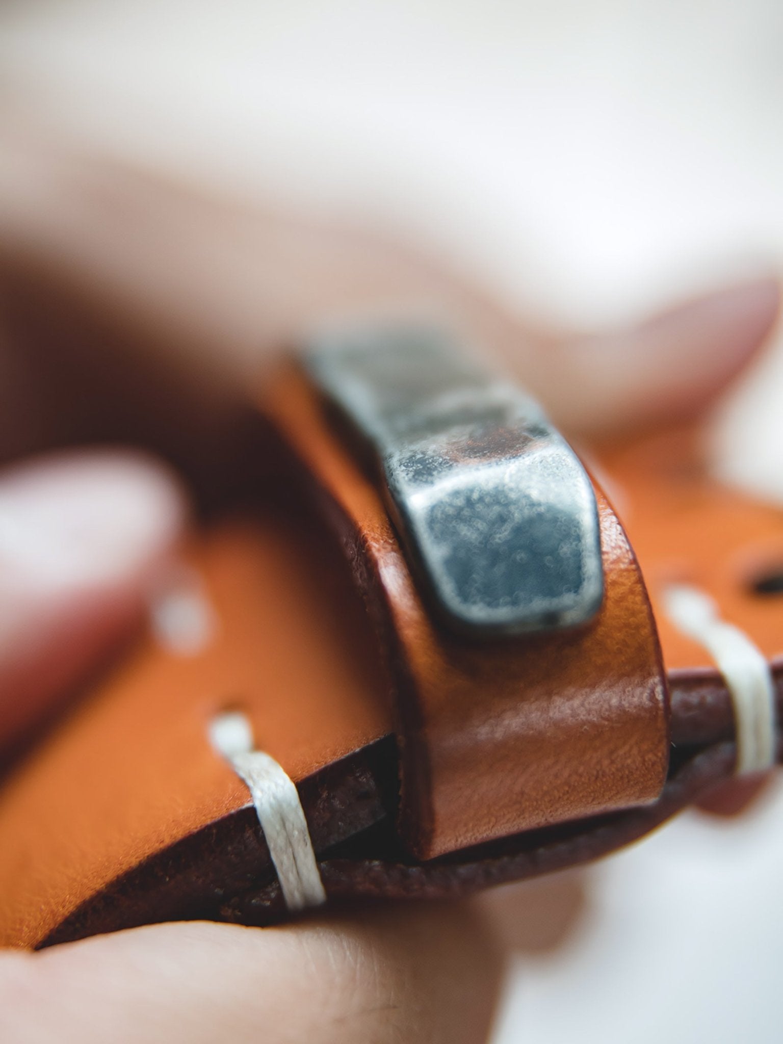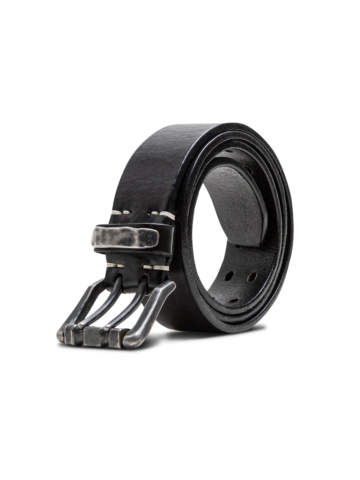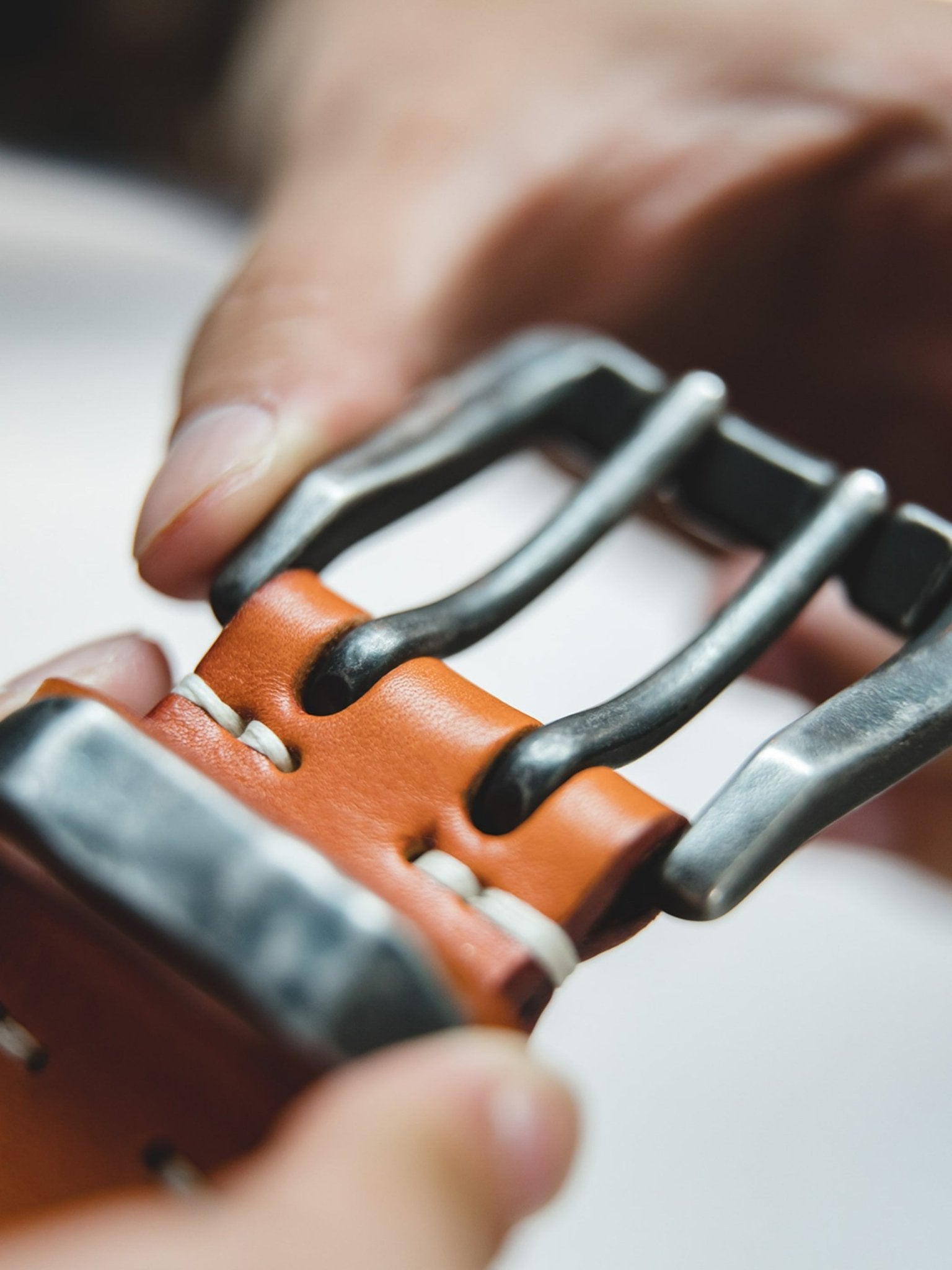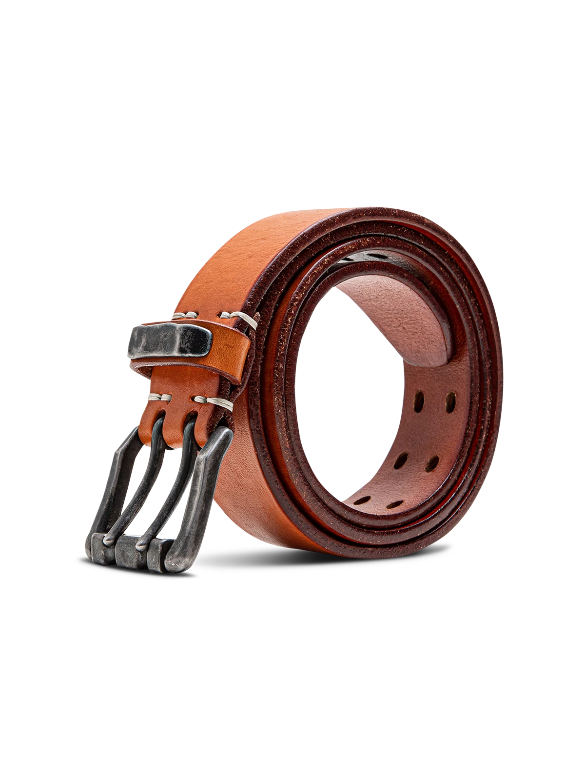 ストリートスタイルやアウトドアコーデ、そして流行のミリタリーファッションに最適なトップレザー素材のベルトが登場。2連のハトメ穴が存在感抜群で、ダブルピンによる長さ調節が可能。ローラー部は回転し、装着感を高めています。