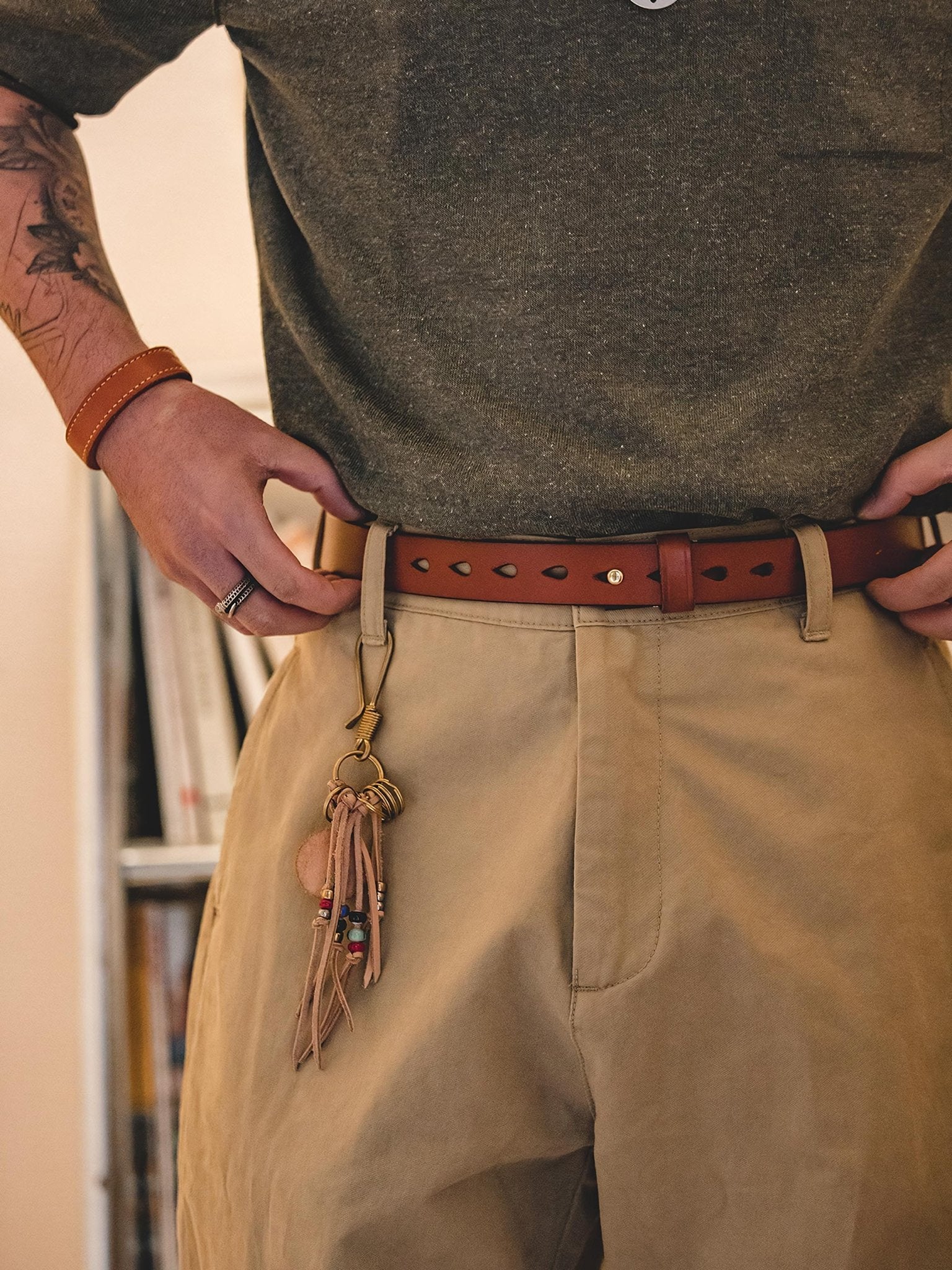 このベルトは植物性のタンニンを使用して原皮をなめし、表面加工をほとんどせずに仕上げた牛革のベルトです。植物タンニンなめしの革は、繊維の間に線量が入り込み、肉厚で腰の強い風合いを持っています。使い込むほどに味わいが出る革を生み出します。
