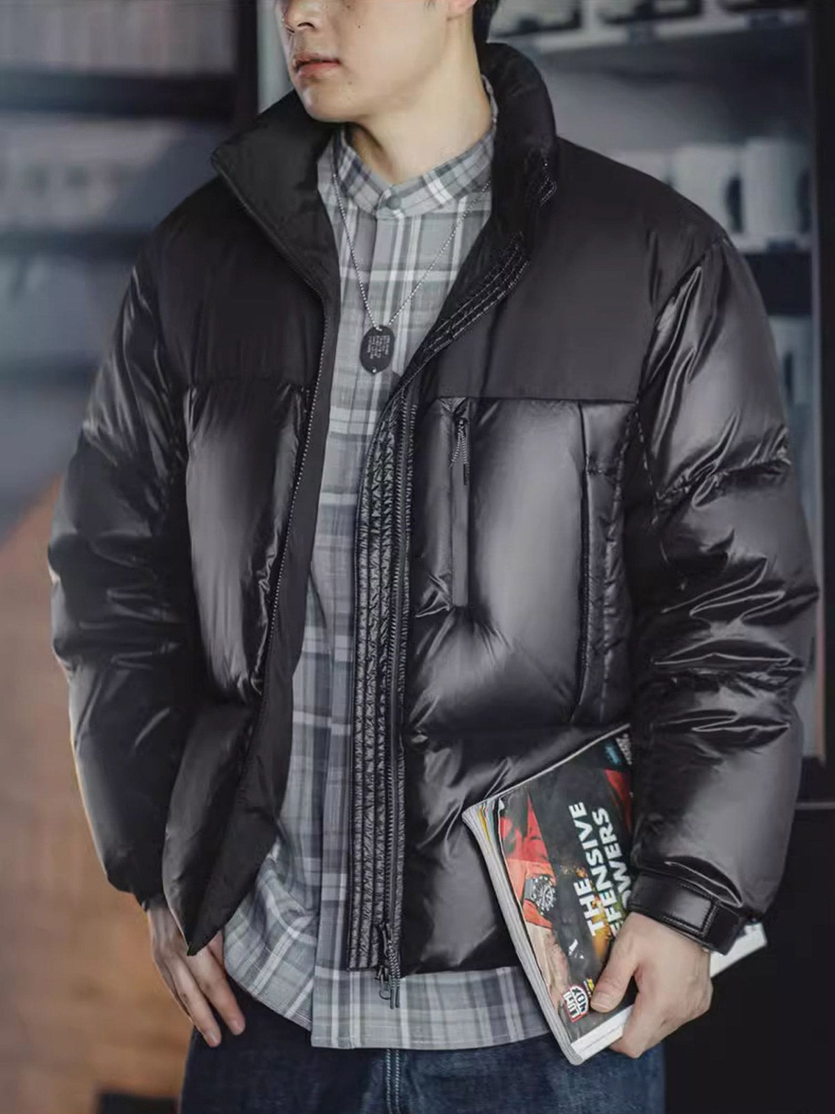 このダウンジャケットは、90%のホワイトダックダウンを使用しており、高い保温性とふんわりとした着心地を提供します。寒冷な冬に抜群の防寒効果を発揮します。外側はリキッドメタルブラックとマットブラックのピンキングデザインが施され、全体的にブラックトーンでありながら、レイヤード感を強調し、独特なビジュアルを引き立てます。三層のキルティング構造と四層のロックダウン技術により、ダウンの漏れを防ぎ、軽量で耐久性に優れています。立ち襟とドローコード付きの裾が風を防ぎ、しっかりと温かさを保ちます。高密度のライニングと外側の生地は、通気性と保温性を兼ね備え、外側には実用的なジッパーポケットがあり、デザインと収納の両方をカバーします。